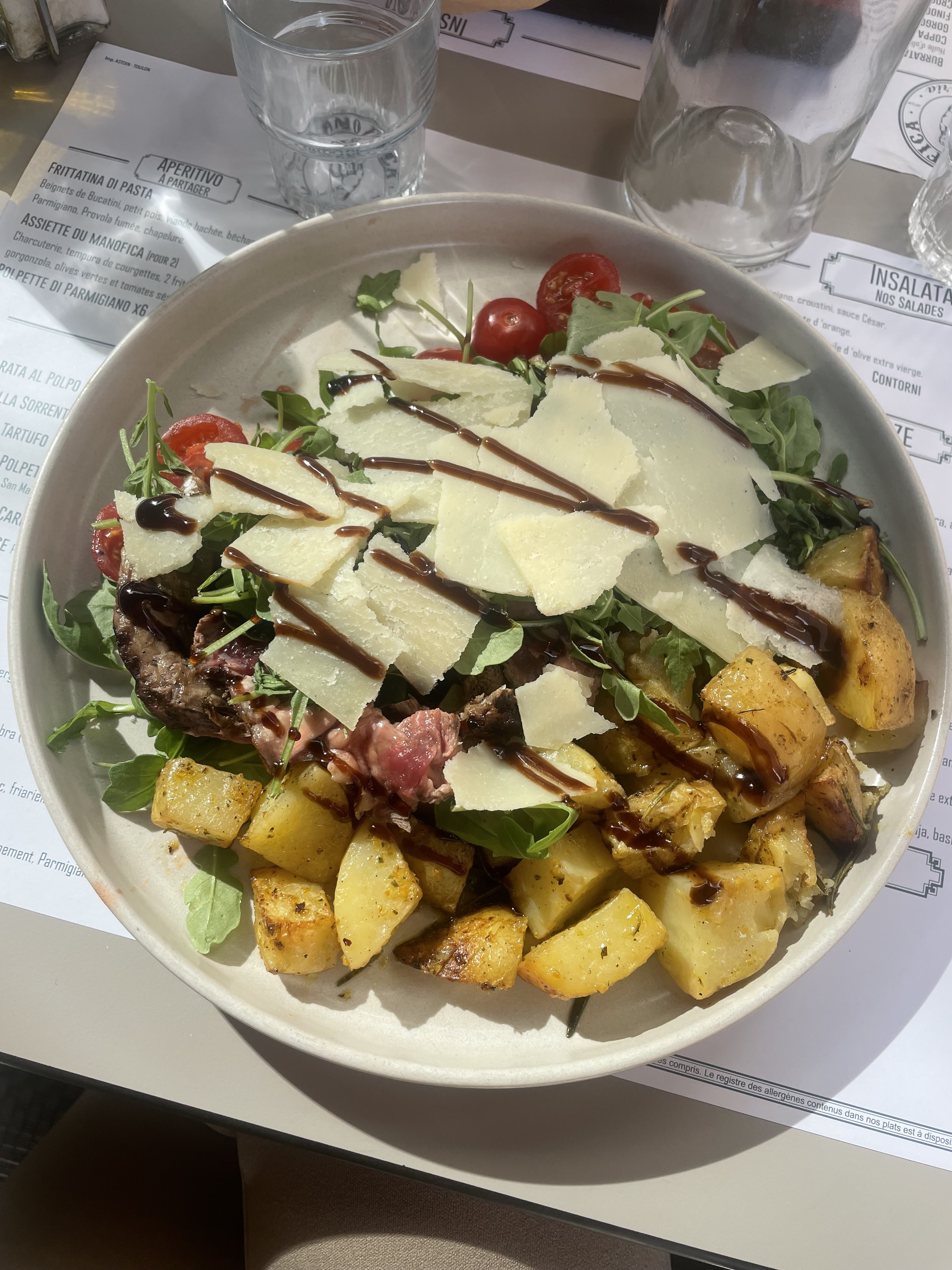 On y mangé hier midi ( plutôt vers les 14h😅) Un régal, une chouette découverte 😊 On y est passé devant et c'est en découvrant les menus et d'avoir Vu un couple manger en terrasse qui nous a donné l'envie de manger Franchement entre le plat,la sauce et le pain Une tuerie culinaire 😋 Franchement on est sorti rassasié et c'est rare Une ambiance vraiment sympa,le décor intérieur sympathique et si on le souhaite on a vu sur le port de toulon Vraiment parfait Bon mon plat c'est un nom italien que je ne pourrai pas vous le redonner sans invoquer un démon 😅 mais c'est du bœuf cuit 48h dans une compotée d'oignons 🤤 j'en salive encore tellement que c'était bon et heureusement que leur pain est aussi bon 😋 Bref c'est une adresse enregistrée et a y retourner absolument 😊