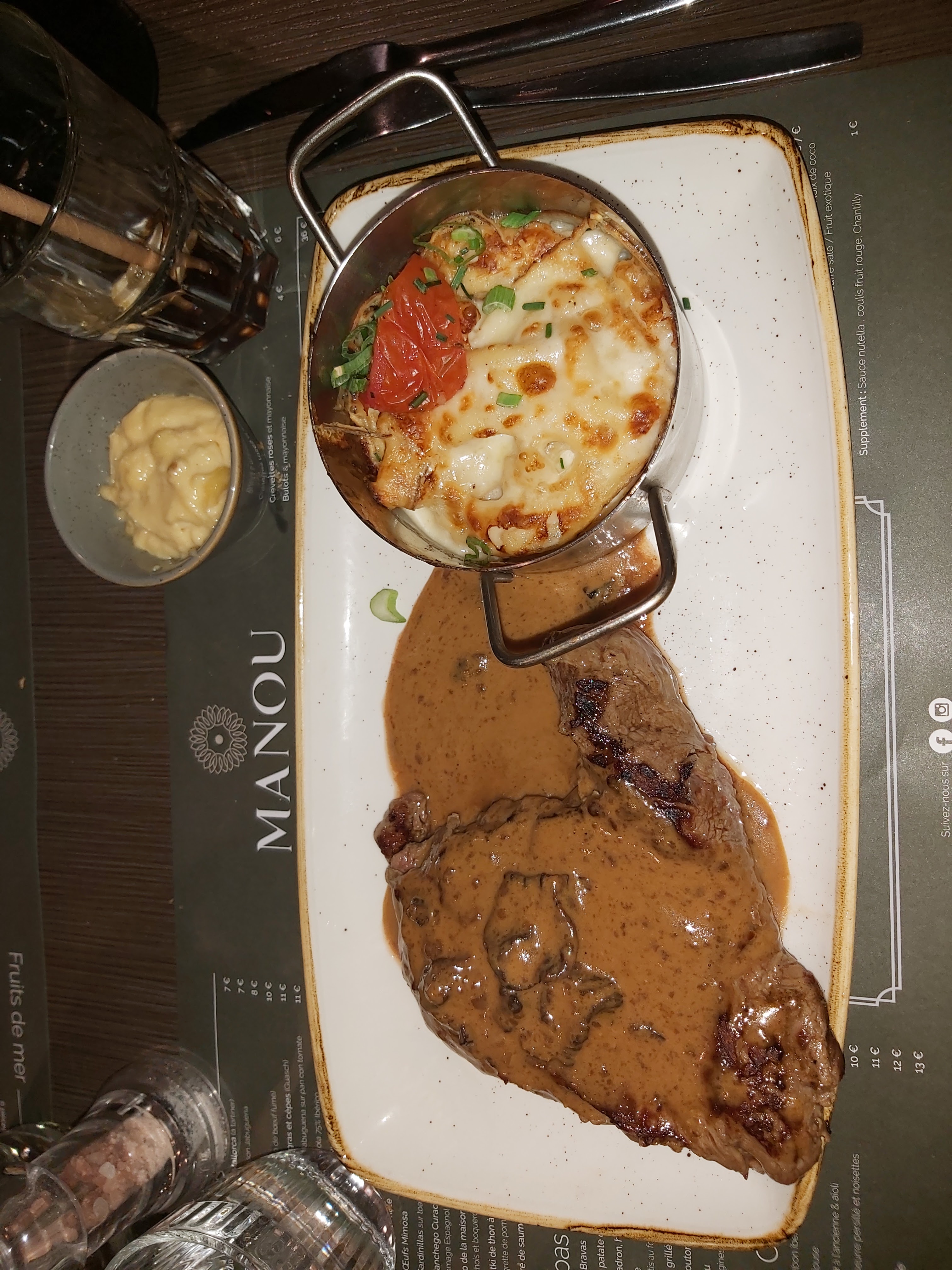 Cadre de qualité, ambiance chaleureuse, une nourriture (tapas pour notre part) excellente et à prix correct, vous pouvez aller dans cet établissement les yeux fermés pour passer une agréable soirée. Excellent retour de notre serveur du soir Damien, serviable, courtois, poli, de très (très) bon conseil, ne force pas du tout à la consommation, et à une répartie à toute épreuve. Merci Damien et toute l’équipe du Manou pour cette super soirée d’anniversaire. Vous avez permis à ma maman, native d’Espagne, de retrouver un peu de son pays d’origine dans notre région. Bravo, continuez ainsi !