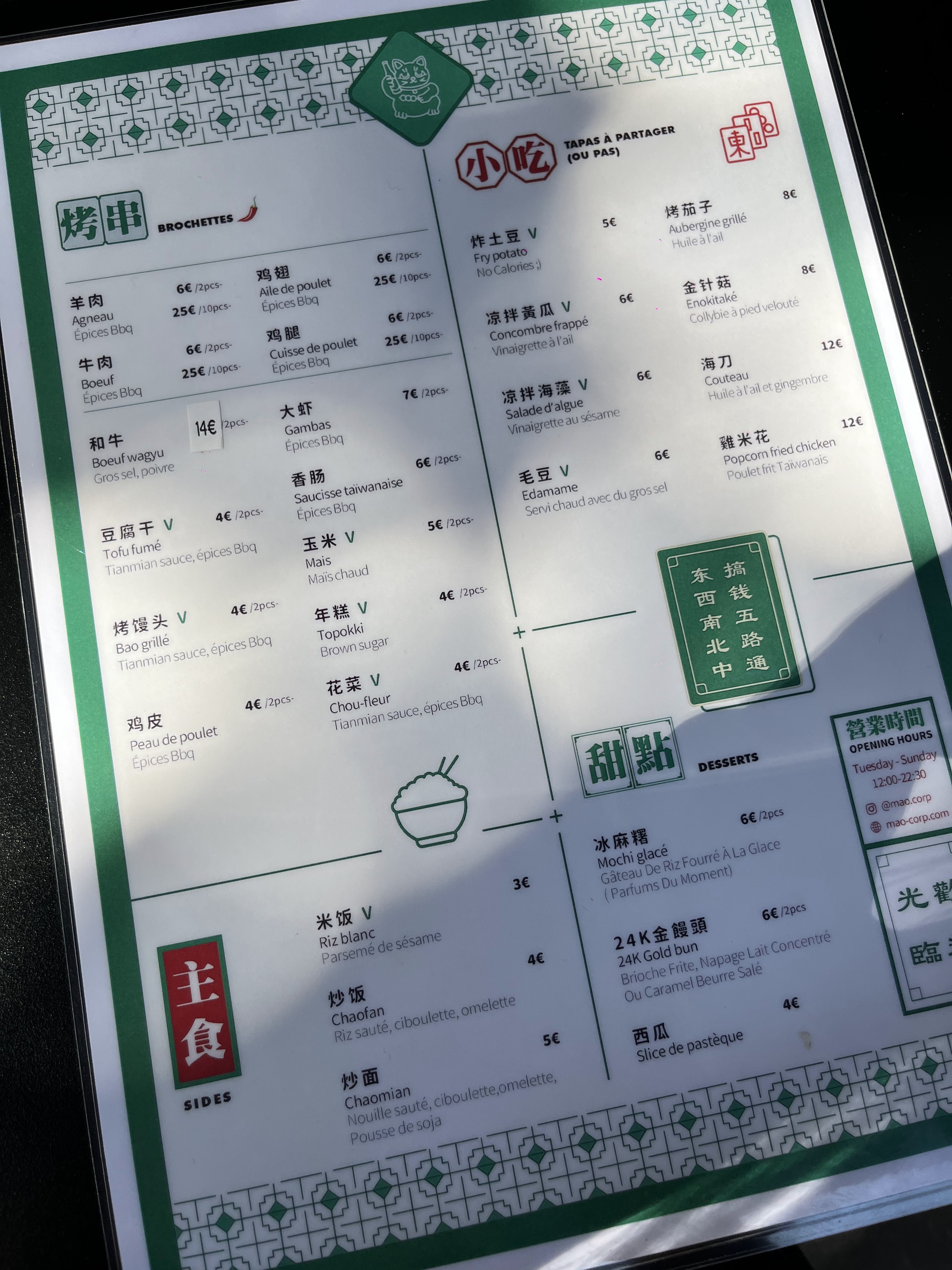 Un nouveau concept de la Mao corps avec tous leurs classiques plus leurs brochettes qui sont délicieuses - la viande est tendre cuite à la perfection. Les prix sont raisonnables et le boss toujours aussi accueillant - I will be back 🙏🏼💜✨
