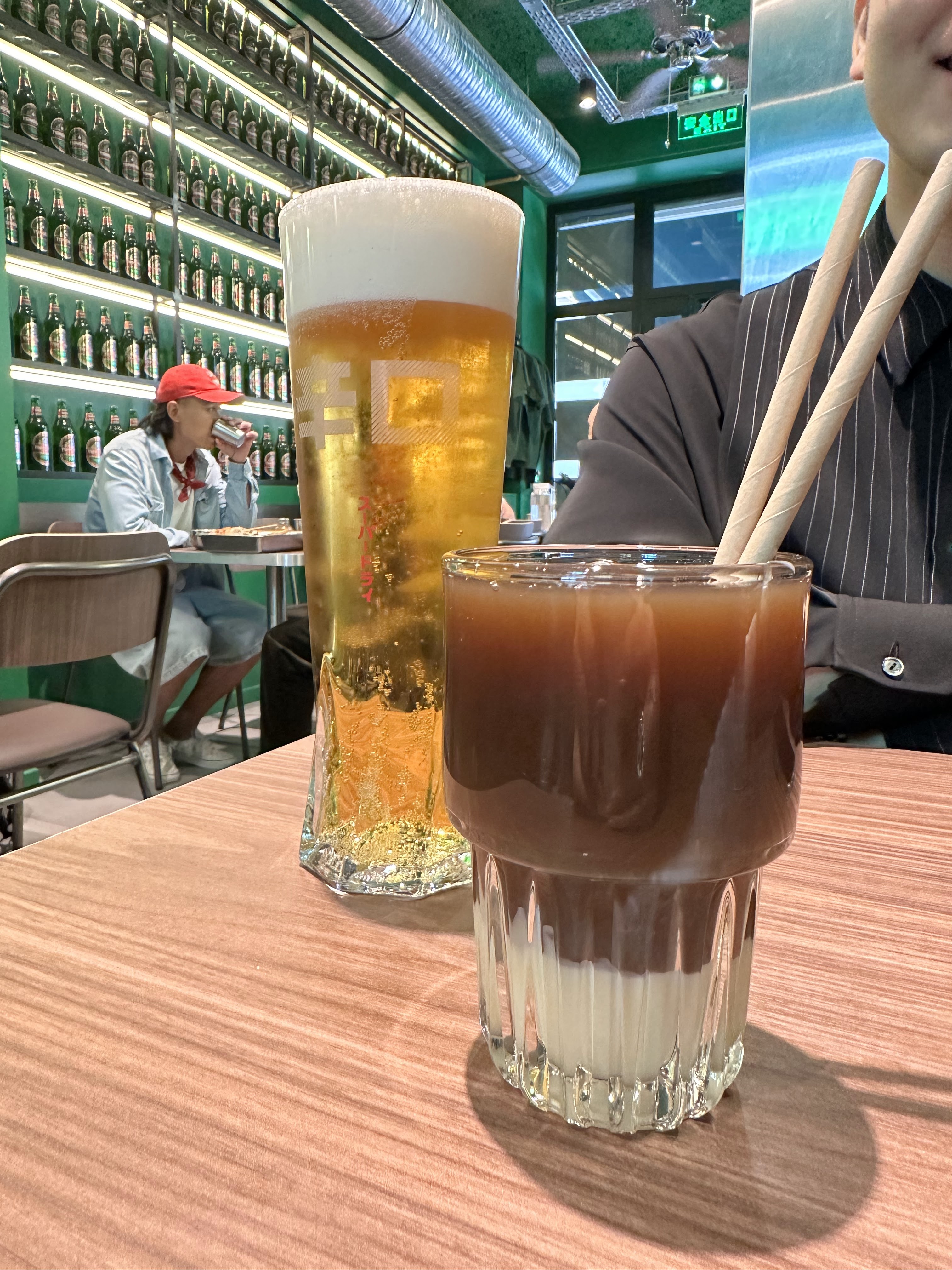 C’est un nouveau restaurant avec un très beau décor moderne et impactant. Le service est correct. La cuisine est rapide mais parfois mal dosée… - les brochettes aux bœufs sont trop cuites et avec beaucoup de tendons (lors de l’addition ça n’a pas été compté donc on leur en remercie) - les brochettes d’agneau sont bonnes mais un « chouya »un peu trop saignant - les brochettes de tofu sont bonnes mais un peu trop salé - les brochettes de choux sont excellentes ! C’est croquant et bien assaisonné. - le plat de champignons enoki est bon mais trop huileux… - le poulet frit est très bon ! C’est croustillant et pas trop huileux. Même refroidit, le poulet reste bon. Dans le thé hongkongais, il y a du lait concentré je pense, c’est un peu trop sucré… Dernièrement la déco est très bel mais la lumière rouge dans les toilettes est légèrement désagréable…