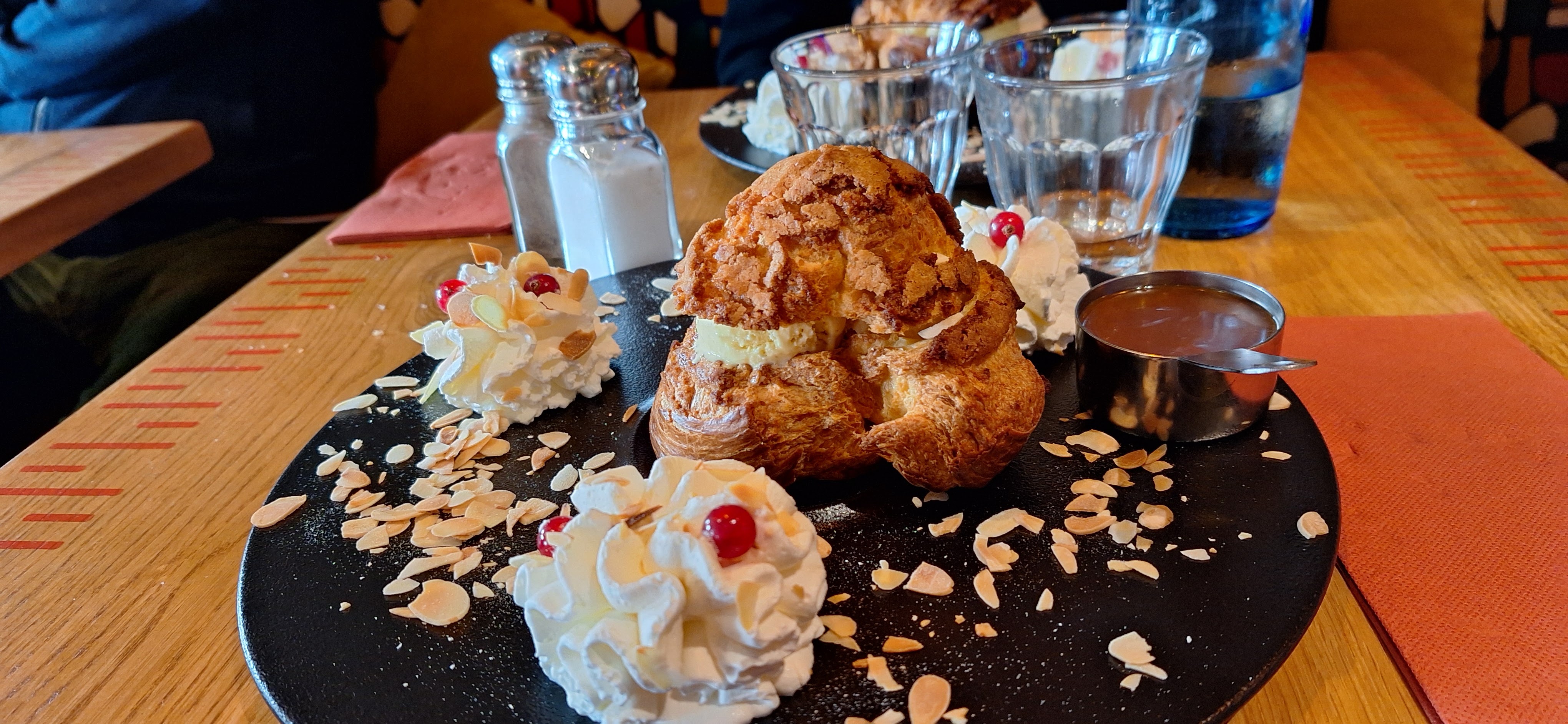 Brasserie joliment décorée, y avons pris l’apéro, les cocktails sont très bons. Puis nous y avons manger, et c’est là que ça s’est gâté… les serveurs n’étaient pas du tout organisés, nous avons eu un total de 3 serveurs pour notre table, on nous demande si ce sont nos plats sur le plateau et non ce ne sont pas les nôtres, on nous a oubliés bien 30min avant de prendre notre commande, et avons attendus autant au moins pour recevoir nos plats qui avant de nous parvenir on fait un tour gratuit de la terrasse haha ! Nous avons pris ça à la rigolade mais quand nous avons reçu nos moules gorgonzola quelle déception en ouvrant le plat! On se retrouve face à des moules cuites à la marinière, sans jus, avec un soupçon de crème très légère en gorgonzola par dessus les moules… du jamais vu ! D’autant plus dommage que les moules étaient très bonnes et charnues ! Donc un peu cher pour ce que c’était à la finale… Sommes donc partis sans prendre de dessert par peur de devoir attendre encore 1h pour manger.
