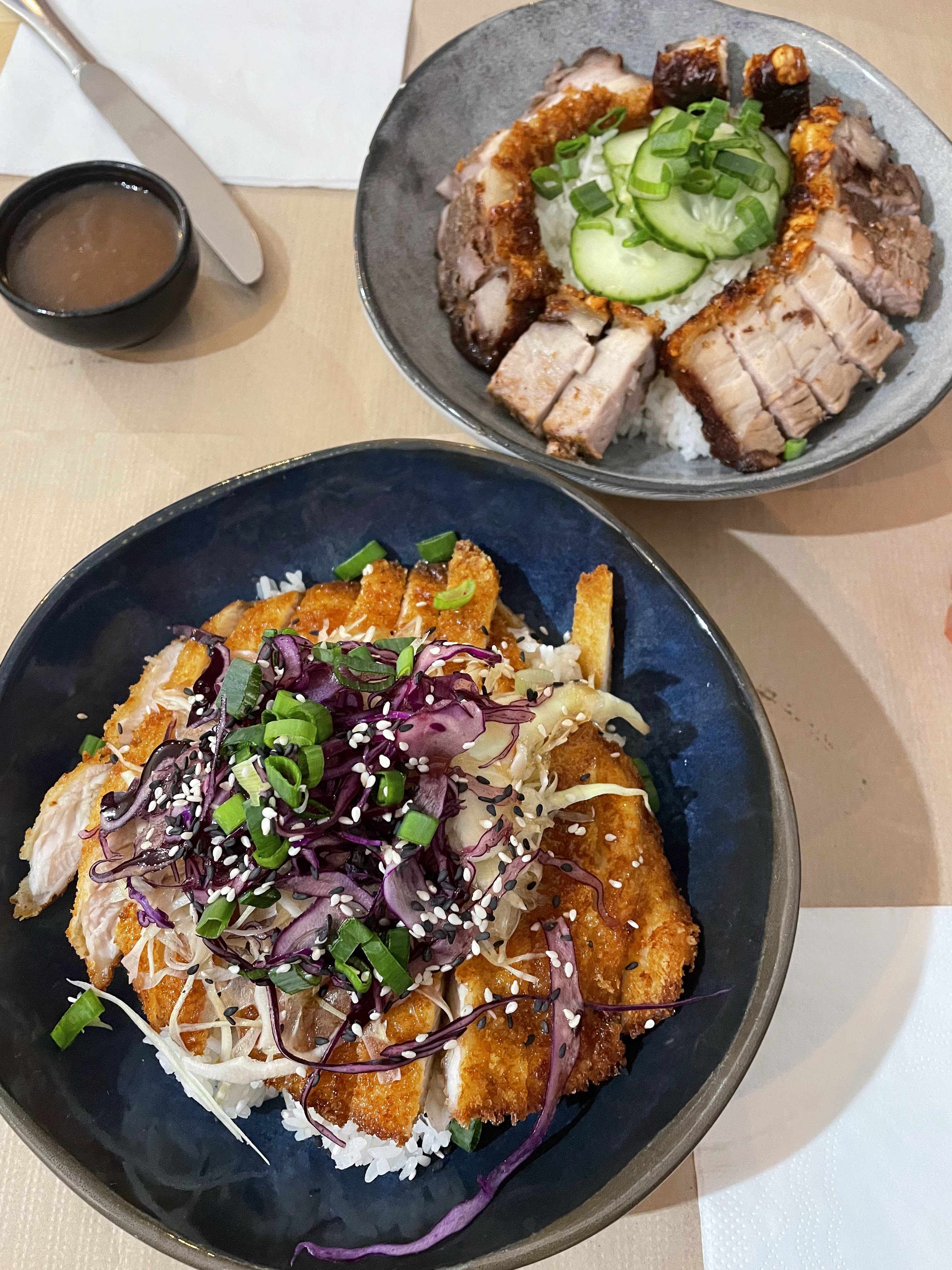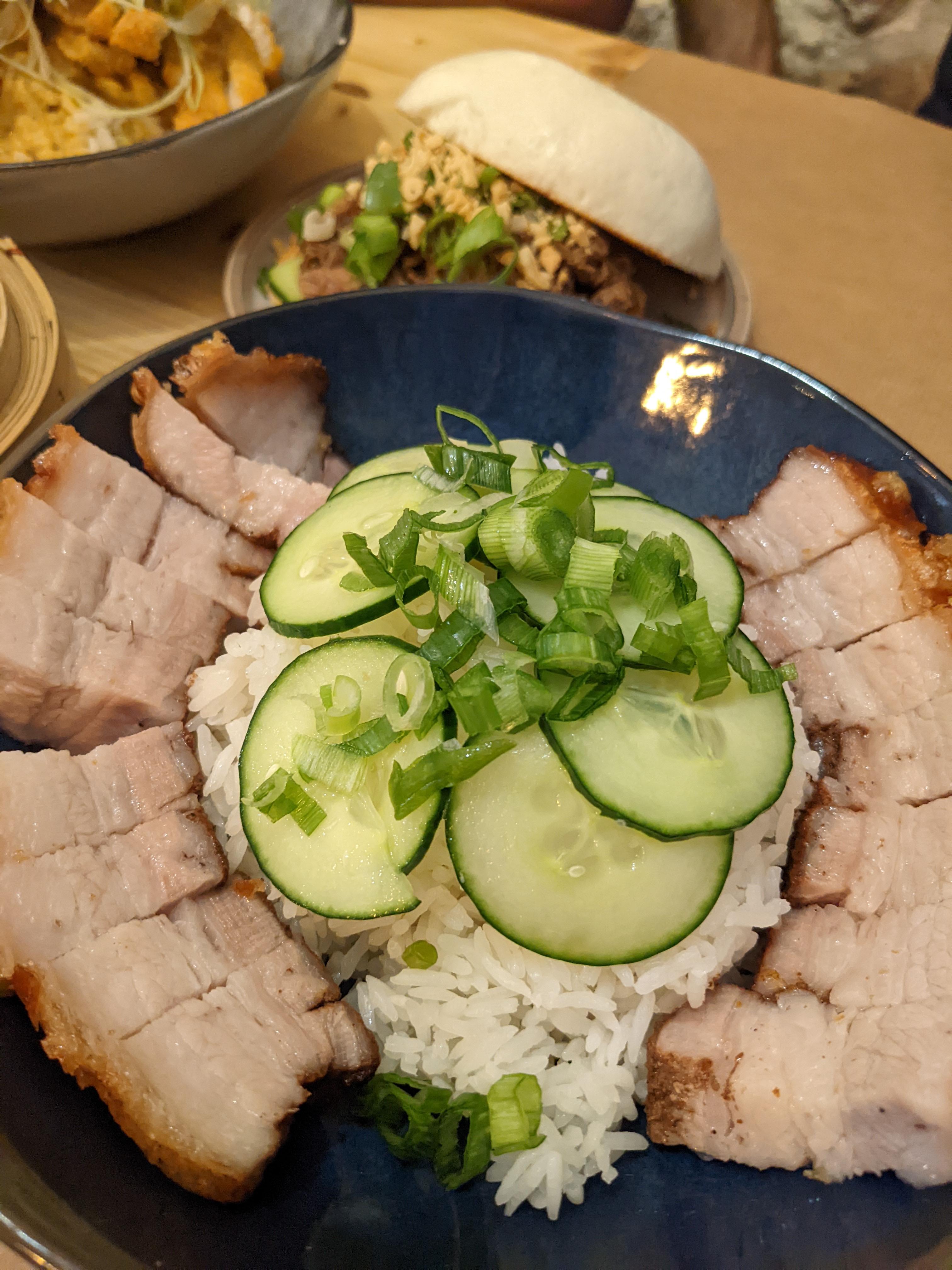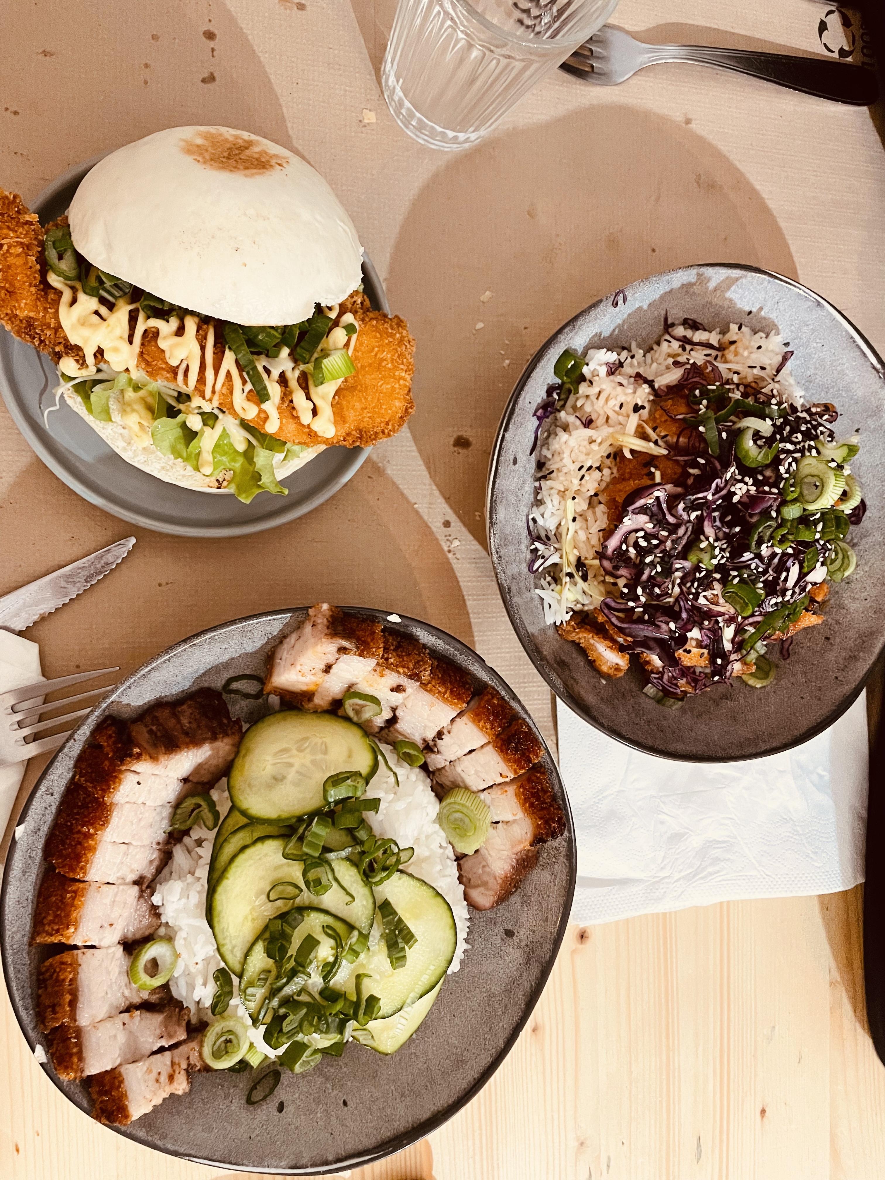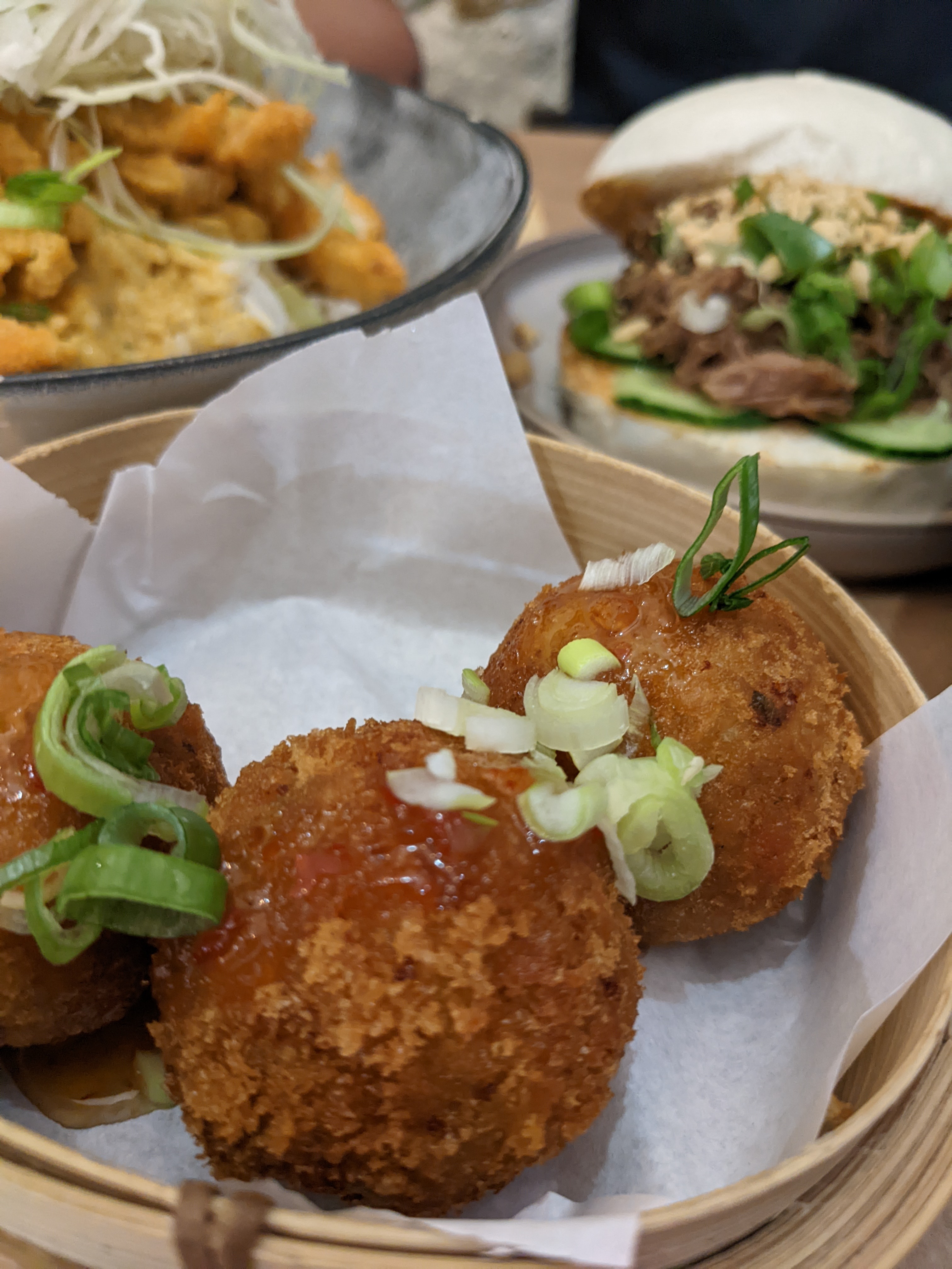 Les plats (crispy pork et poulet katsu) sont goûteux et copieux. Les bao (produit phare du restaurant) ne présentent en revanche aucun intérêt gustatif (bahn bao cuits puis coupés en deux, grillés à la plancha, et garnis d'ingrédients à la manière d'un burger). Idem pour les nems au poulet (garnis de vermicelles, il n'y a quasiment pas de trace de poulet à l'intérieur...). Le tempura de légumes est bon.