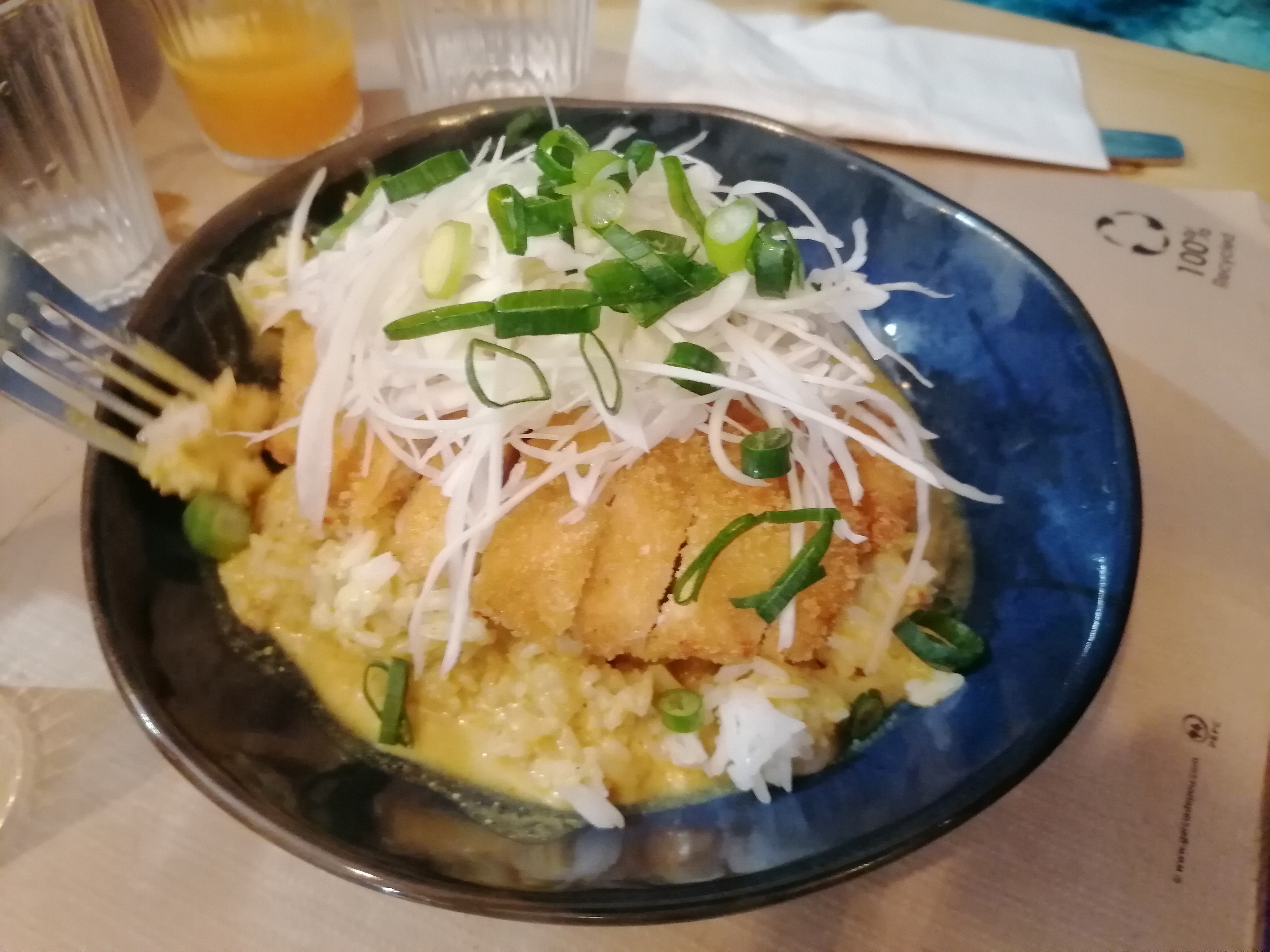 Dejeuner en terrasse au soleil, l'equipe est jeune, dynamique et souriante. Ce jour là j'ai pris une formule a 12E, poulet Katsu curry avec riz et nems. Tres bon rien a dire