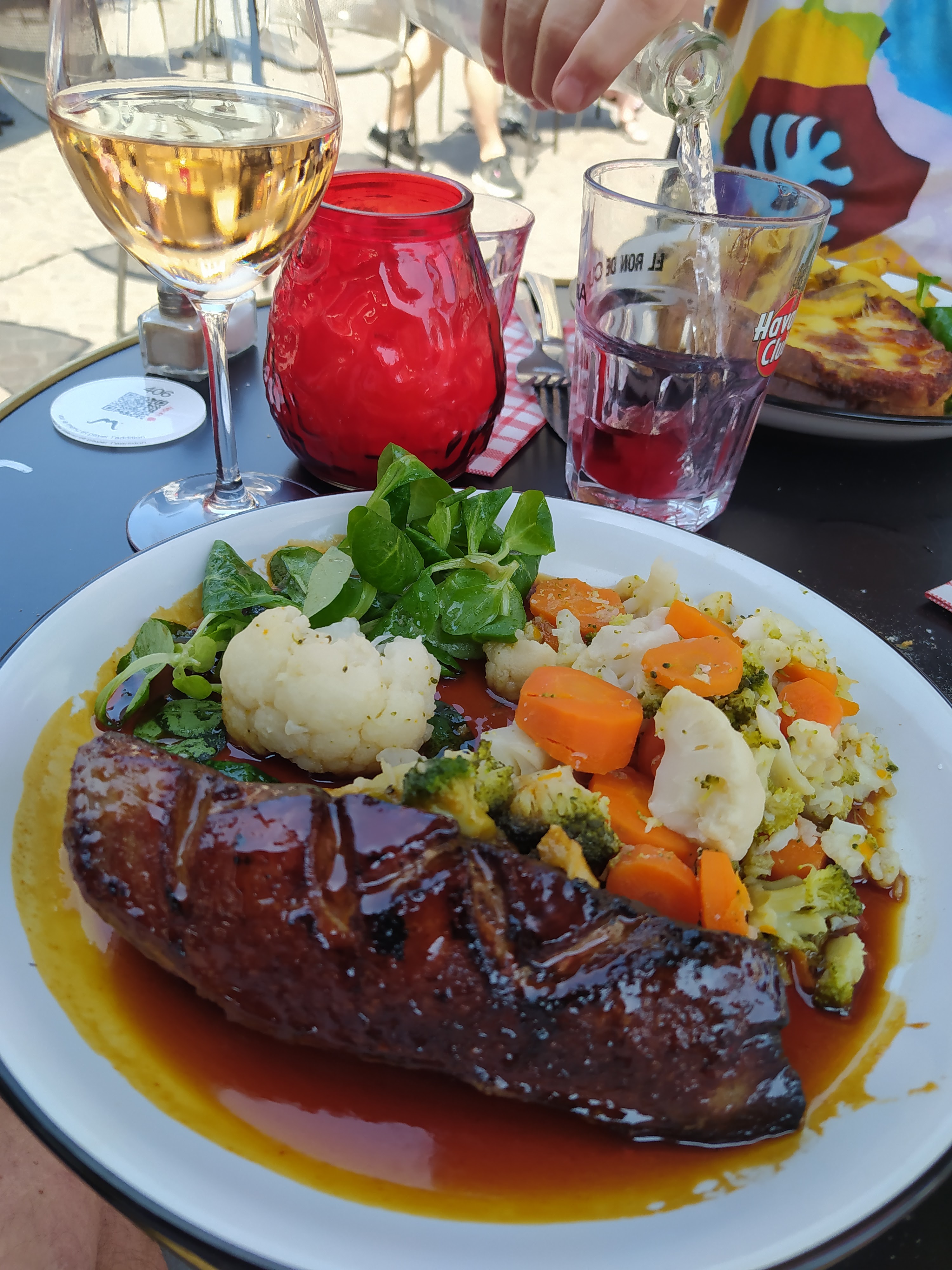 Service extrêmement rapide et agréable pour ce resto très bien placé. Morceau de canard copieux et bien cuit accompagné de délicieux légumes et repas clôt par un pain perdu avec glace et coulis de caramel beurre salé, miam Merci!