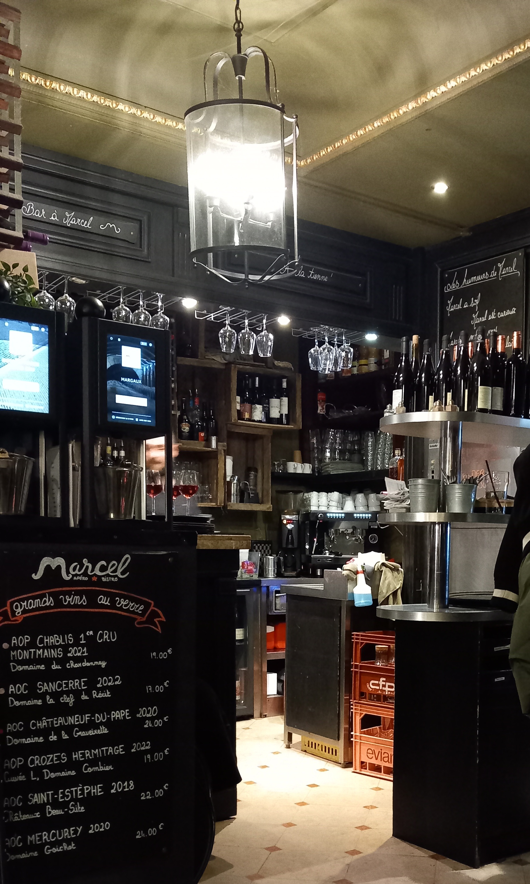 Un vrai cuisinier dans la cuisine ! La quasi-totalité des restaurants du coin fermant tôt (à notre goût, Parisiens gâtés que nous sommes), nous nous sommes réfugiés chez Marcel qui a bien voulu nous accueillir pour un plat seulement. Mais quel plat ! Et quel vin (au verre) également ! Dommage que 1) la maître d'hôtel nous ait accueillis si froidement, presqu'agressivement. Rien à dire sur le personnel qui nous a ensuite servis 2) les sièges des tables hautes soient paradoxalement si bas... En tout cas cela change des restaurants où l'on a du mal à croire qu'il y a un vrai cuisinier dans la cuisine.
