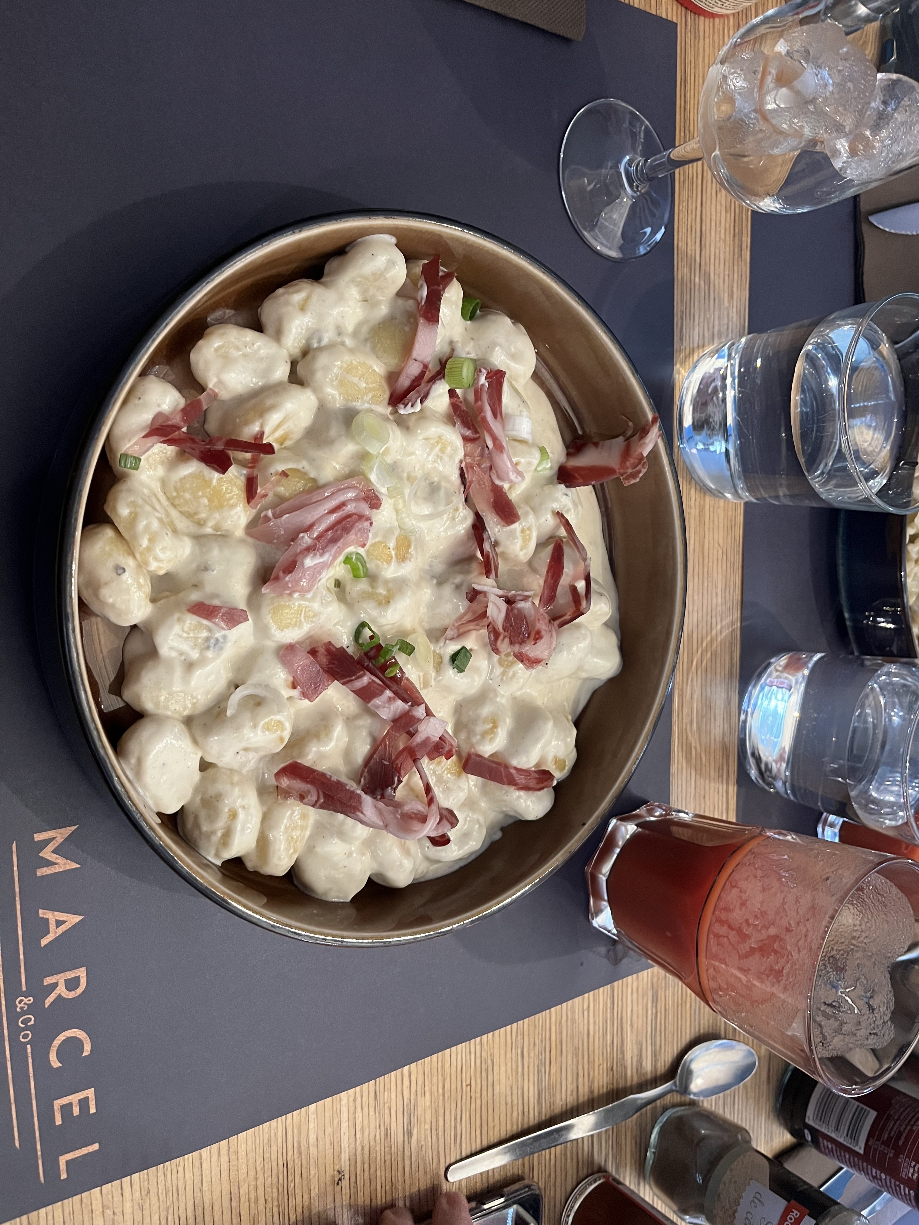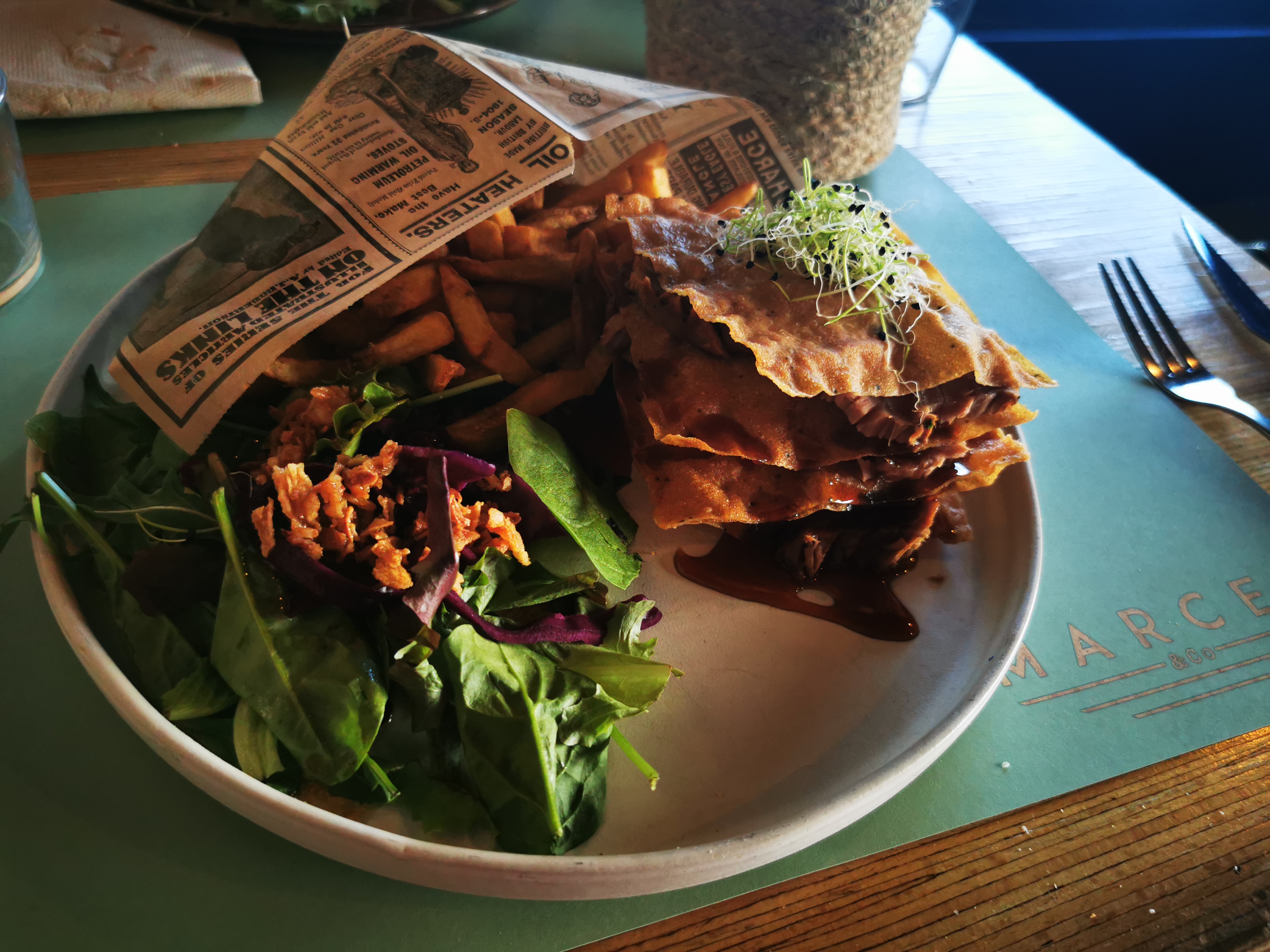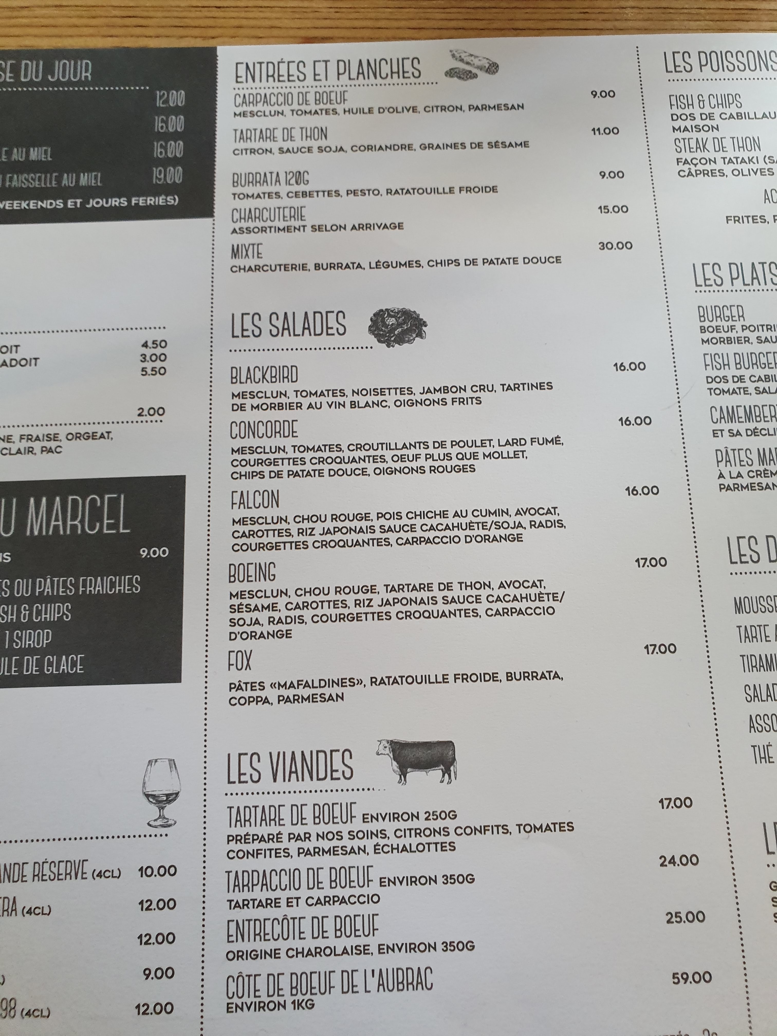 Nous sommes arrivés à 14h au restaurant. Vu qu’il était affiché que le service s’arrêter à 14h30 nous avons demandé si il était toujours possible de déjeuner , on nous a répondu que oui . Une fois installé sur une table près de la porte d’entrée et son courant d’air une serveuse vient nous voir . Je commande une bière en attendant de choisir notre repas. La serveuse revient avec la bière et désire prendre notre commande. Je commence par lui demander quel est le plat du jour et elle me répond qu’il n’y en a plus . Très bien je vais donc prendre un menu . Le menu n’est pas disponible car il comprend le plat du jour … Ok … Je choisi donc un plat à la carte pendant que ma femme commande un Parmentier de cannard. La serveuse prend note et se dirige vers la cuisine. Puis elle revient en nous indiquant que le Parmentier n’est plus disponible lui aussi. Malheureusement c’est le seul plat qui lui donné envie. On décide donc à contrecœur d’aller manger ailleurs car le choix était très restreint. Et c’est en quittant la table pour rejoindre la sortie que la serveuse me dit qu’il faut régler la bière (que je n’ai pas consommé). Ce que je refuse catégoriquement. La serveuse se voyant insistante je sors mon porte feuille pour ne pas faire un scandal pour 3,80€ . La serveuse se dirige finalement vers le bar et revient en me disant que la bière m’est offerte. Bref tout ça pour dire que je ne peux pas juger la qualité de la nourriture mais je peux juger l’accueil médiocre , le manque de communication de leur part ainsi que le côté commerçant qui au départ était absent. Je ne reviendra plus chez Marcel & co. Et je préférai largement Mac coy Saloon qui était au même endroit auparavant. Bonne continuation à vous .