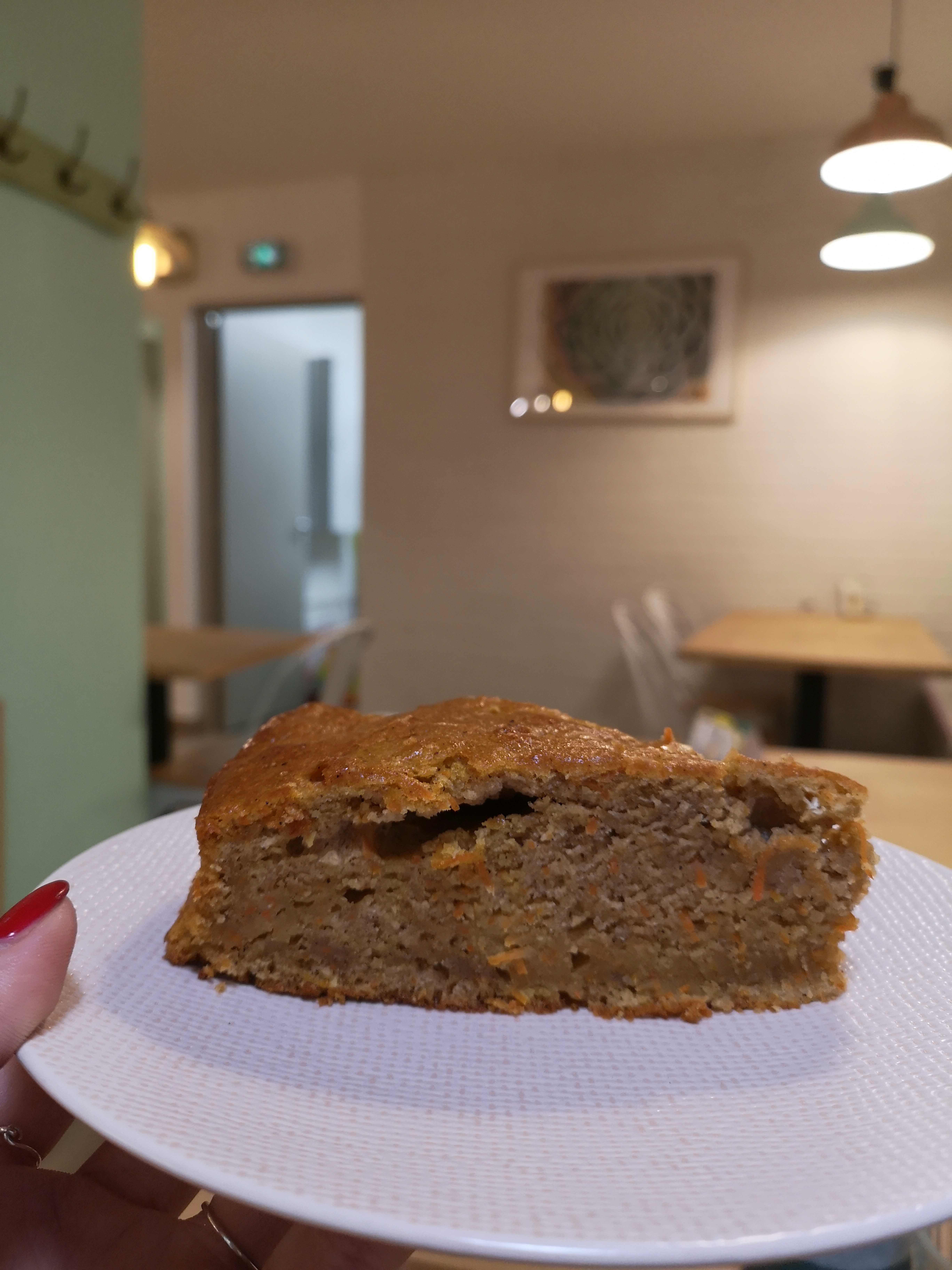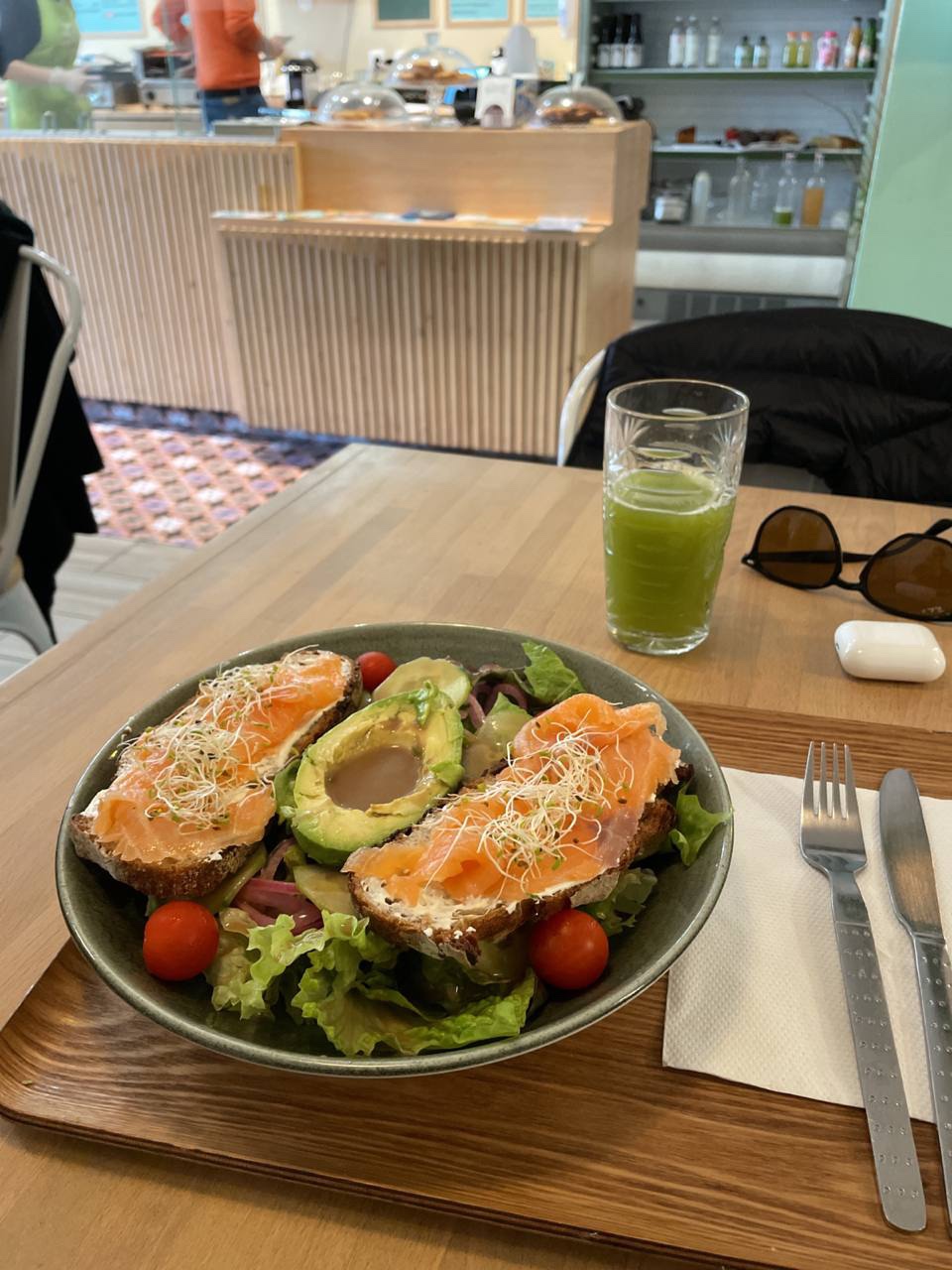 J ai pris une salade brunch, très bonne et copieuse. Le jus détox avec gingembre très bon aussi et pour terminer un banana bread magnifique. Ils devraient proposer des goûters car leur gâteau est vraiment délicieux