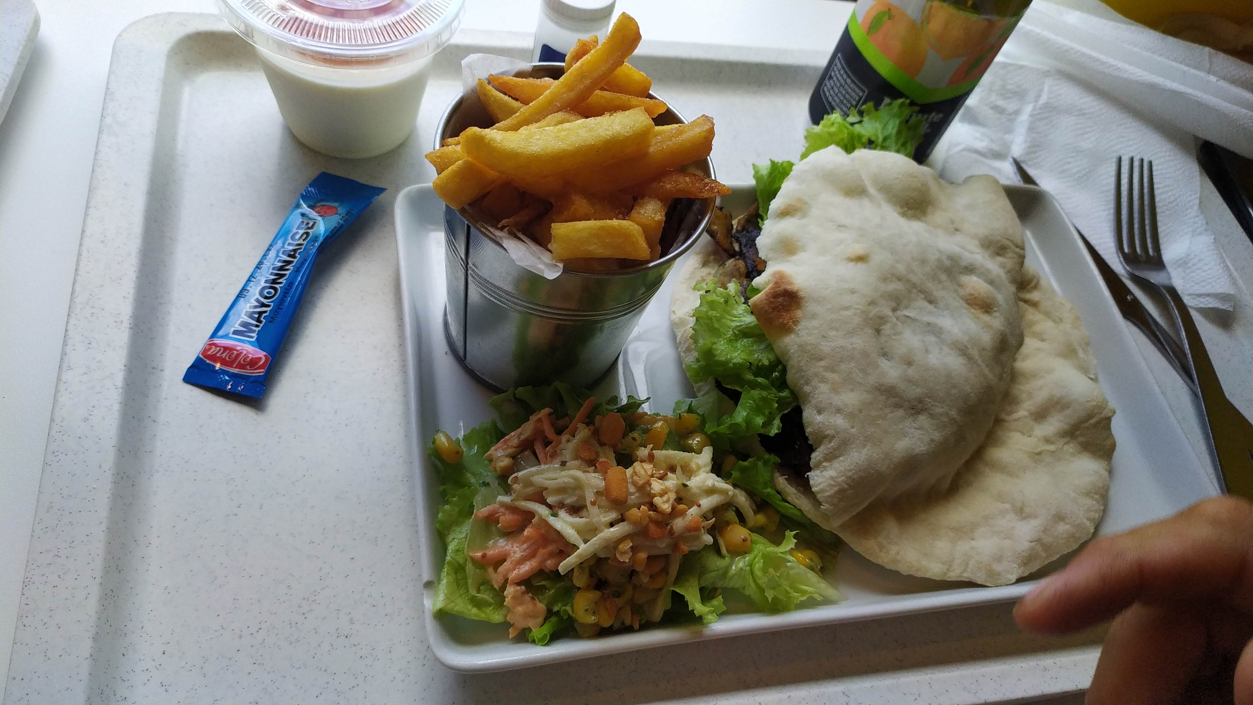 Le plat du jour est cuisiné avec des produits frais. Il faudra compter 12,50 € pour un plat et un dessert. Il y a également un choix de sandwichs, fajitas, salades et d'entrées froides. Pas très bien ventilé.