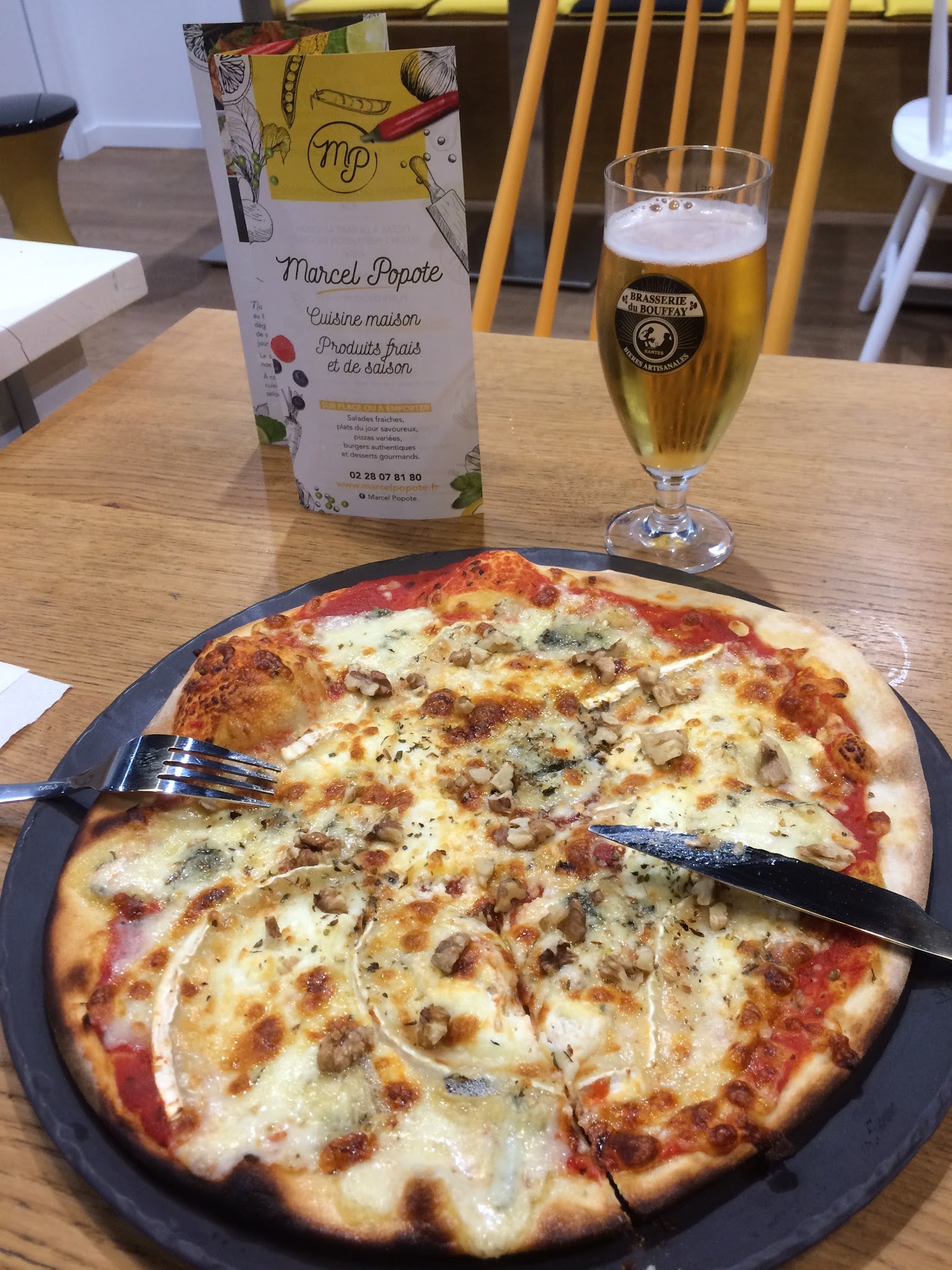 Un véritable bijou d'endroit ! Nous recommandons vivement ce restaurant décontracté. Nous étions en route pour Bordeaux et nous nous sommes arrêtés ici pour nous ressourcer pendant le déjeuner. Leur clientèle habituelle vient des bureaux locaux et prépare des déjeuners à emporter. Nous avons essayé leur repas du jour car la pizza n'était pas disponible pendant le déjeuner. Absolument délicieux. Désolé si je n'ai pas compris le nom français. Le personnel a accueilli notre groupe de 5 personnes (2 enfants) même si nous ne parlions pas français. Merci Marcel Popote!