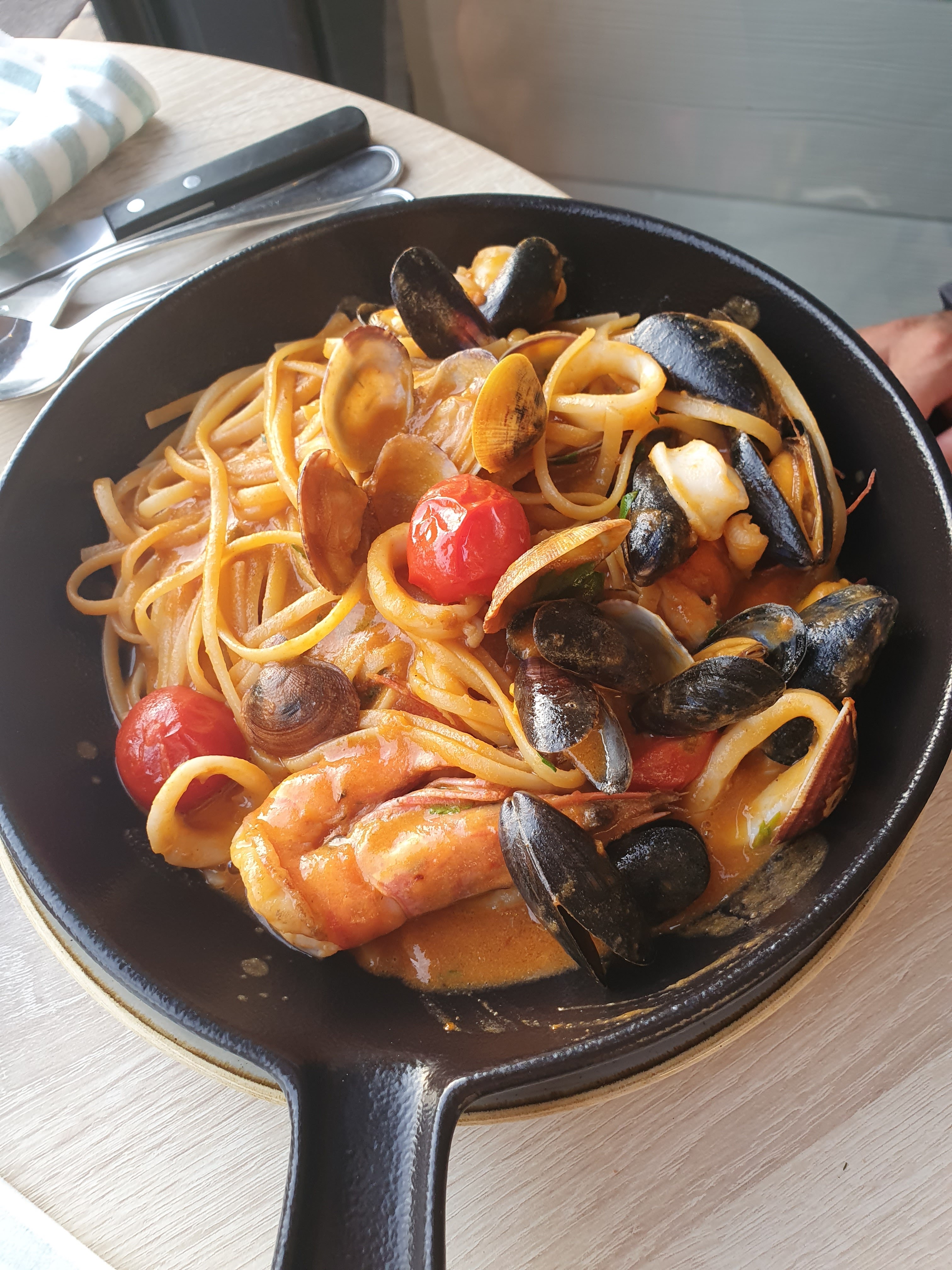 Le restaurant est agréablement convivial et charmant. Nous avons pris linguini frutti Di mare et moules frites. Tout était très très bon. Je vous conseille fortement les pâtes fruits de mer, une tuerie, goût et quantité au rdv.