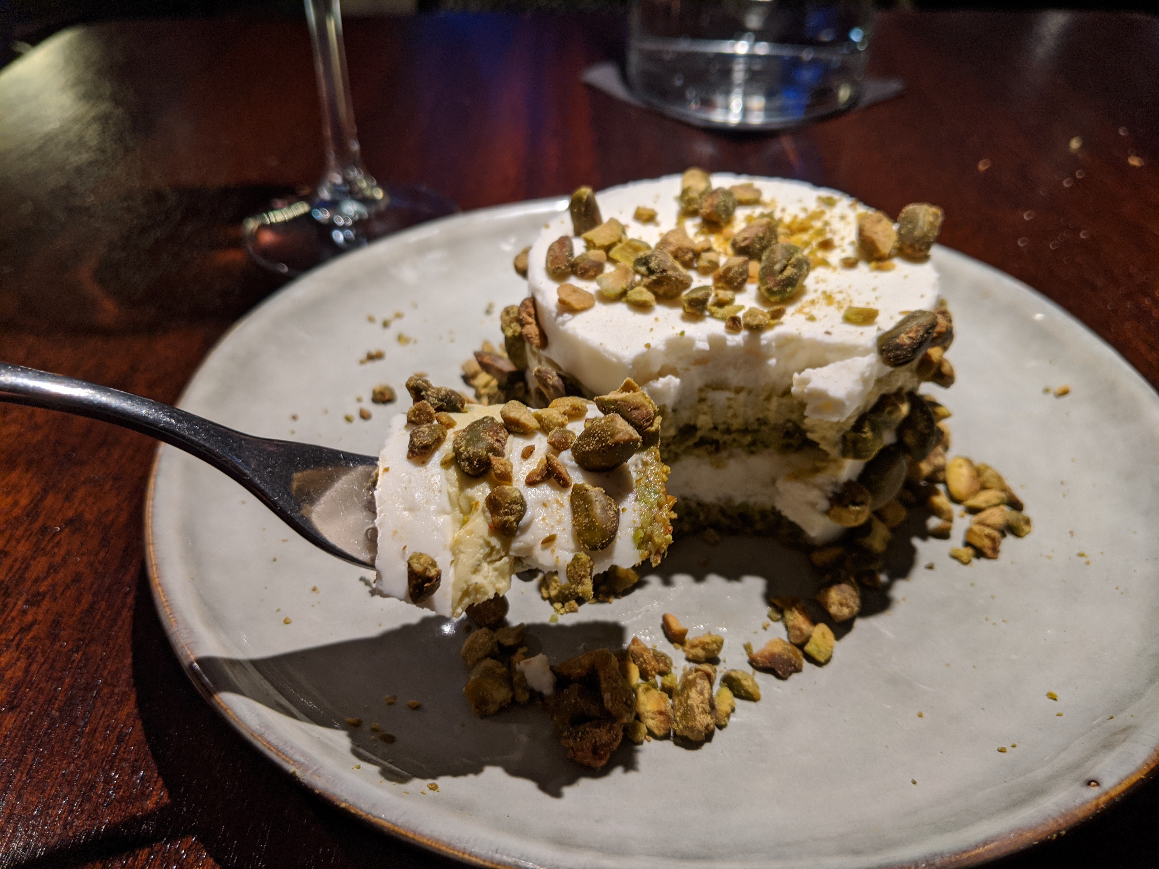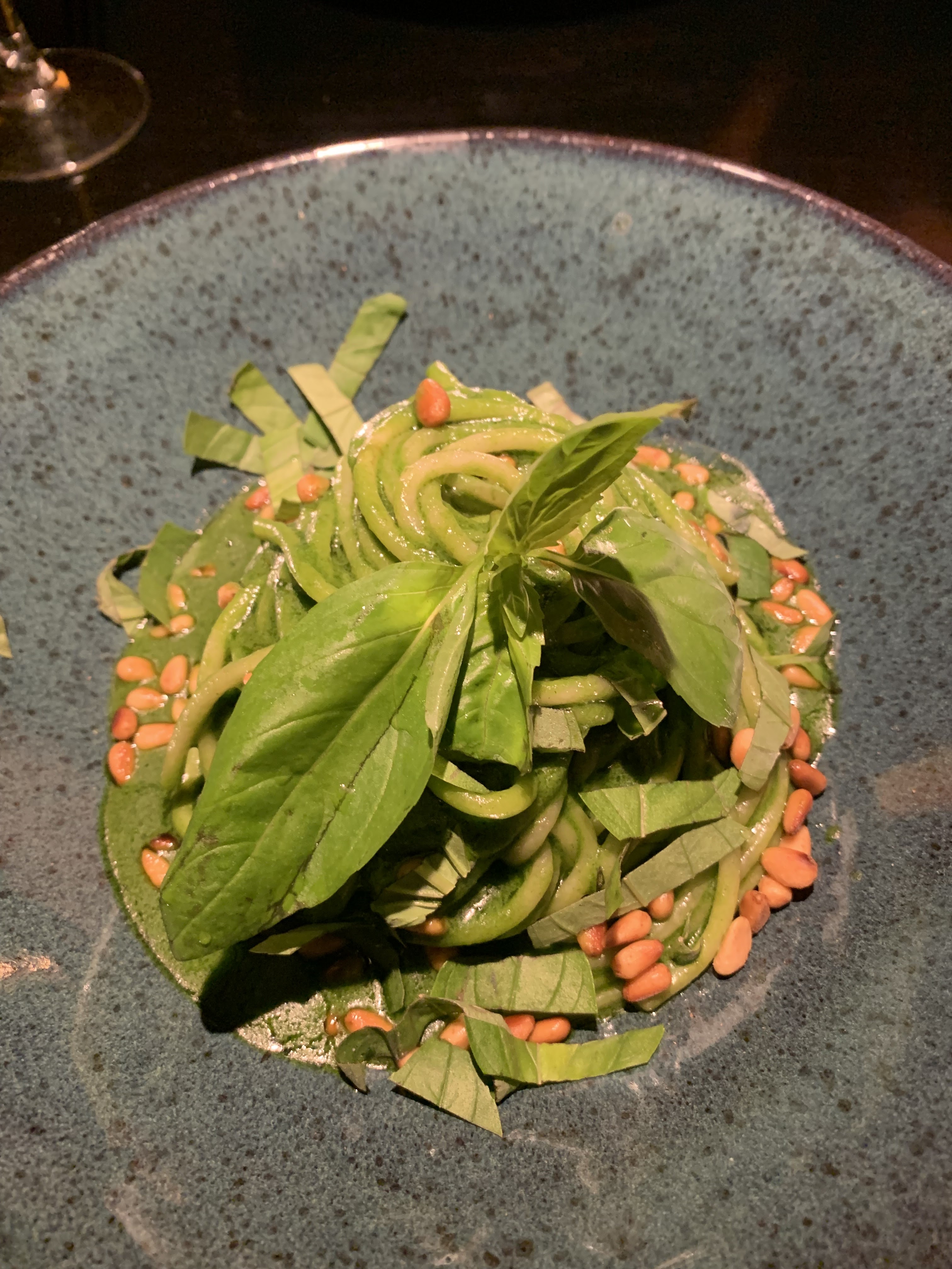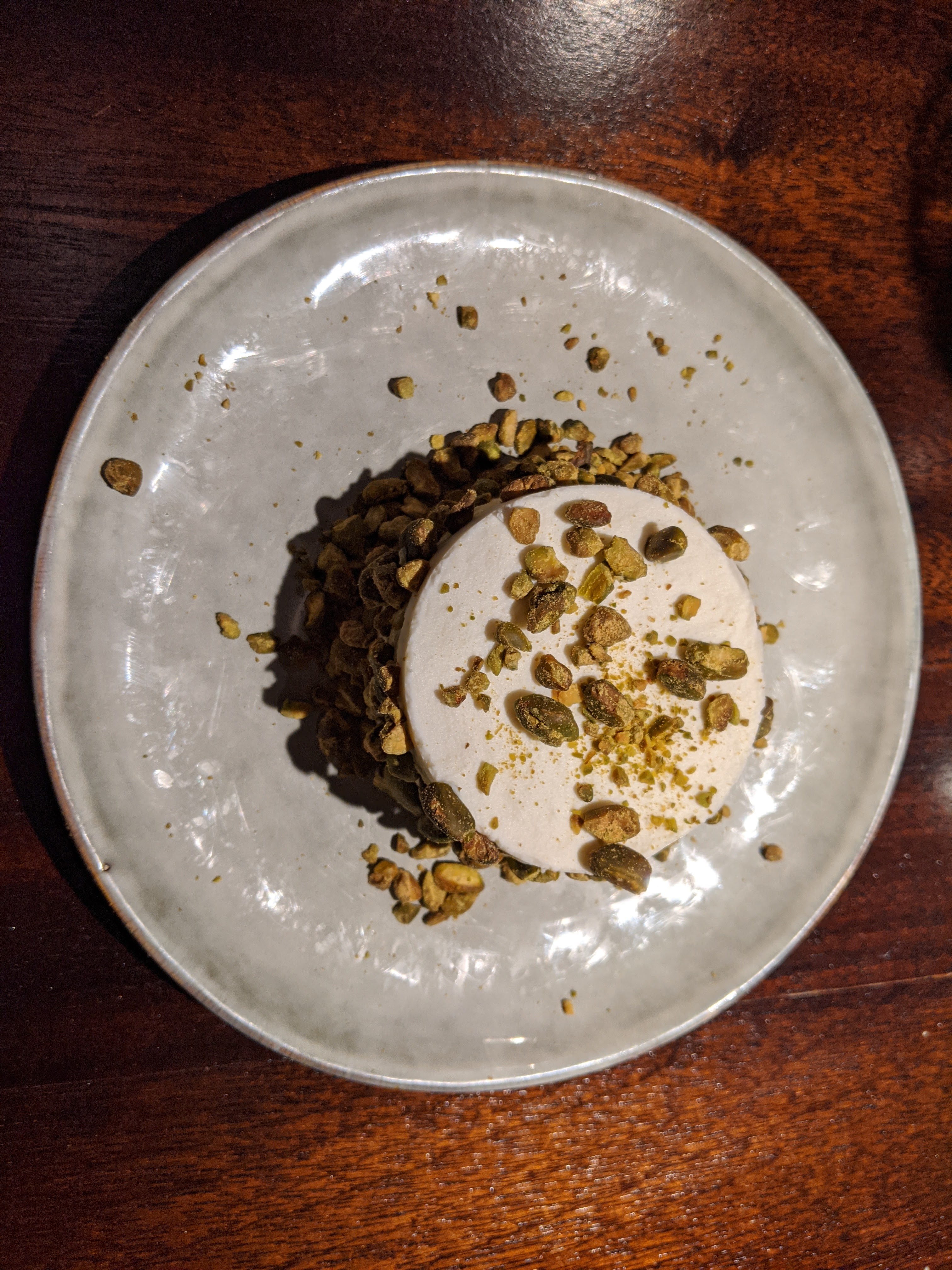 Nous avons partagé une burrata fumée et petits pois (une tuerie), une aubergine rôtie (très bonne même si j'imaginais l'ensemble roti et pas seulement l'aubergine), des raviolis à la crème de truffe blanche (délicieux), et un semifreddo (c'était bon mais ça ne nous a pas emballé). Le lieu est très beau, et dispose d'une grande terrasse agréable (il faut réserver). Les prix sont assez élevés, conformes au quartier (41€ par personne avec un ginger beer chacune).