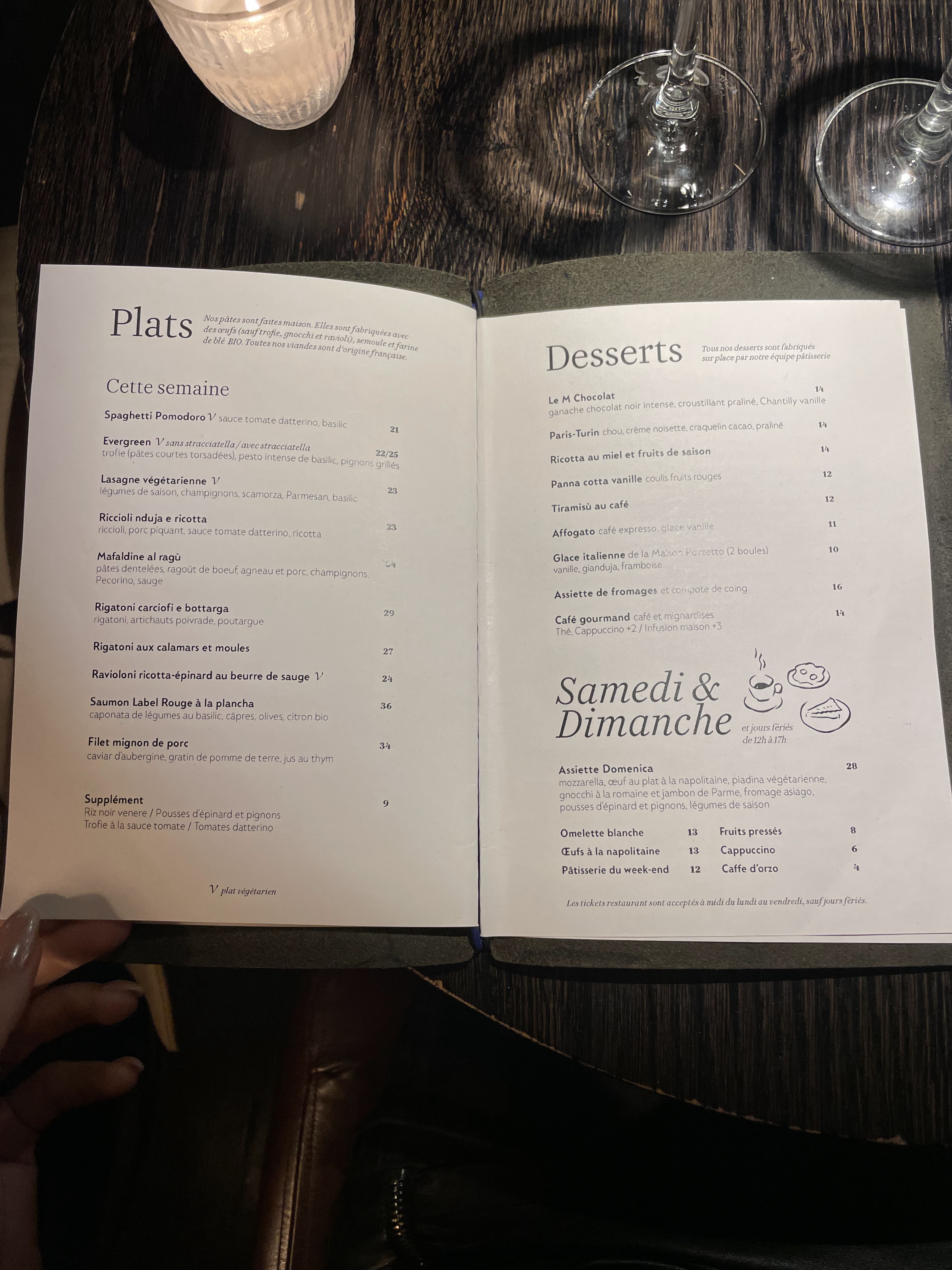 Ambiance juste incroyable en plein cœur de st Germain des Prés ! Nous avons découvert ce lieu en nous baladant, en voyant une magnifique terrasse en contre bas, très charmante& intimiste et l’intérieur est tout aussi incroyable ! Nous avons pu un vendredi soir appeler et réserver pour l’heure qui suivez la dame de l’accueil est efficace et arrangeante La carte change souvent, c’est italien raffiné et frais . J’ai trouvé que les pâtes 🍝 étaient correct et copieuses, les glaces en dessert 🧁 sont excellentes ! Les vins aussi. Service de qualité et déco tamisé, belles vaisselles . Pour se garer vous avez le parking st Suplice et pas le parking st germain qui est privé !