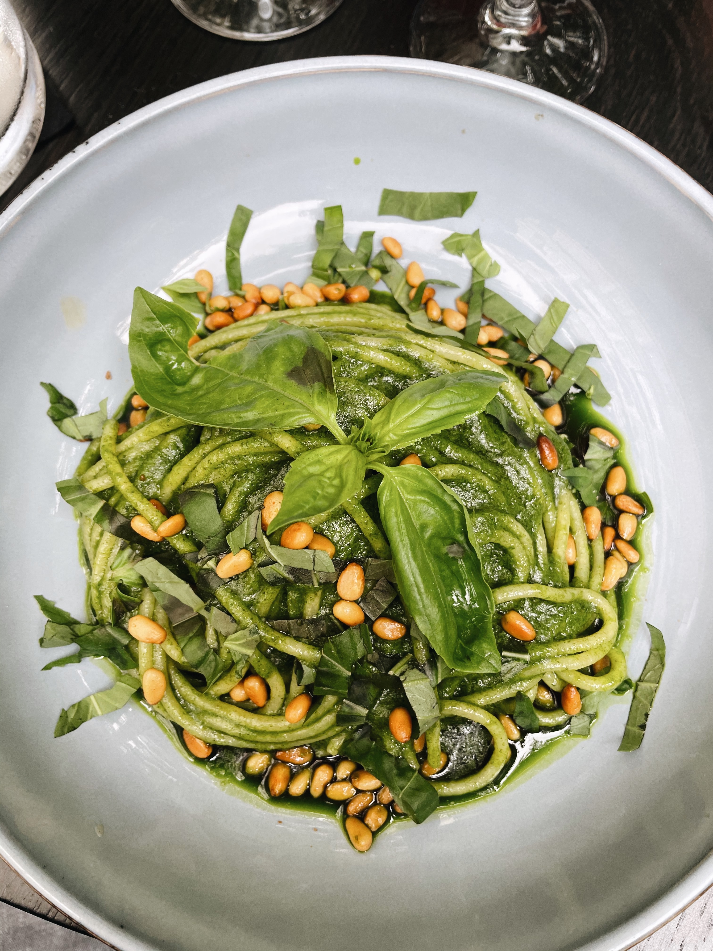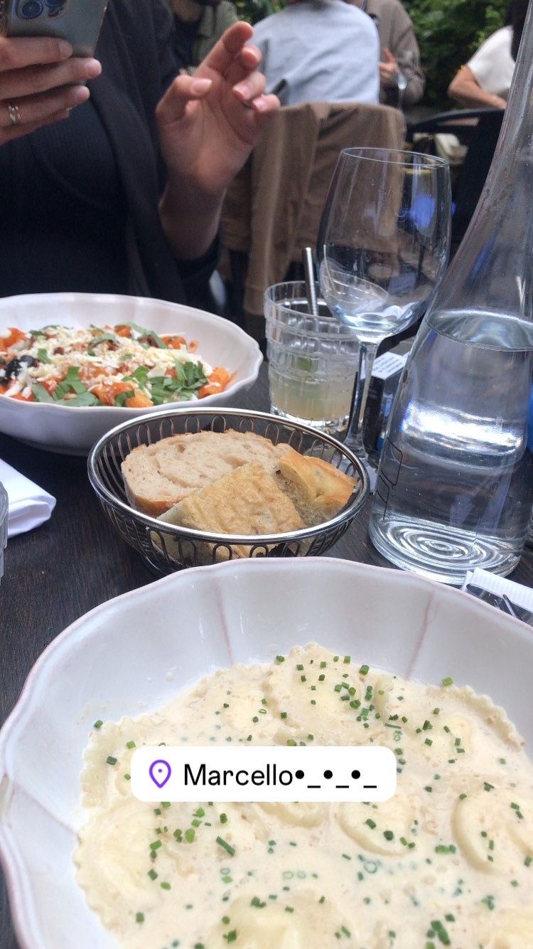 On accède à l’entrée cachée de Marcello en empruntant un petit escalier, qui vous emmène dans une jolie cour ombragée. Quand on a de la chance, et que le temps est au beau fixe, il est coutume de s’installer à l’extérieur, sur la terrasse fort convoitée du restaurant italien. Mais par temps de pluie, ou quand on crains le froid, l’intérieur offre une alternative confortable et design. Dans tous les cas, la carte vous régalera à toute heure de la journée. Le premier contact est excellent : le service est chaleureux et la bonne humeur de rigueur. Ainsi, on se sent immédiatement à l’aise. Le jour où je me suis rendue chez Marcello, il faisait si beau que je ne pouvais pas envisager de déjeuner à l’intérieur. J’opte finalement pour des pâtes fraîches (fabriquées sur place chaque matin). Mafaldine aux asperges vertes, sauce tomate fraîche, speck et pecorino romain. Quant à Muriel qui m’accompagne, elle choisit le Parma e Melone, et une délicieuse demi Burrata Nera et sa purée de truffe noire. Bien que très satisfaites par ce repas bon et copieux, nous avons cédé à l’appel de la partie Dolce : Paris-Turin (petits choux à la crème gianduja) et Cheesecake.