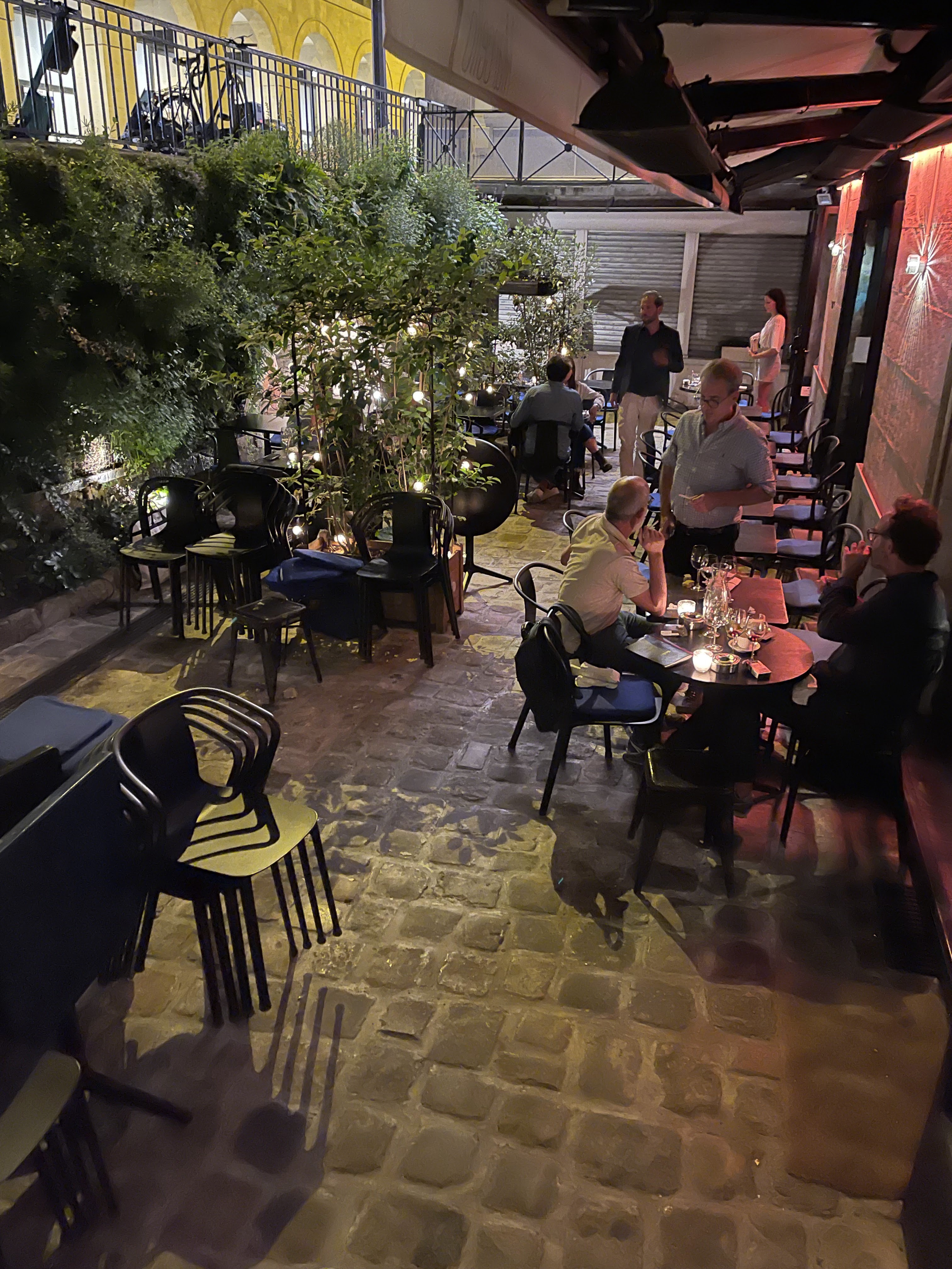 Un rêve de terrasse-jardin caché, un mur végétal, une atmosphère de place de village, un micro bassin avec poissons rouges…bref, le PARADIS. Une carte longue d'inspiration italienne avec de bons produits. Service attentionné mais clairement en sous effectif.