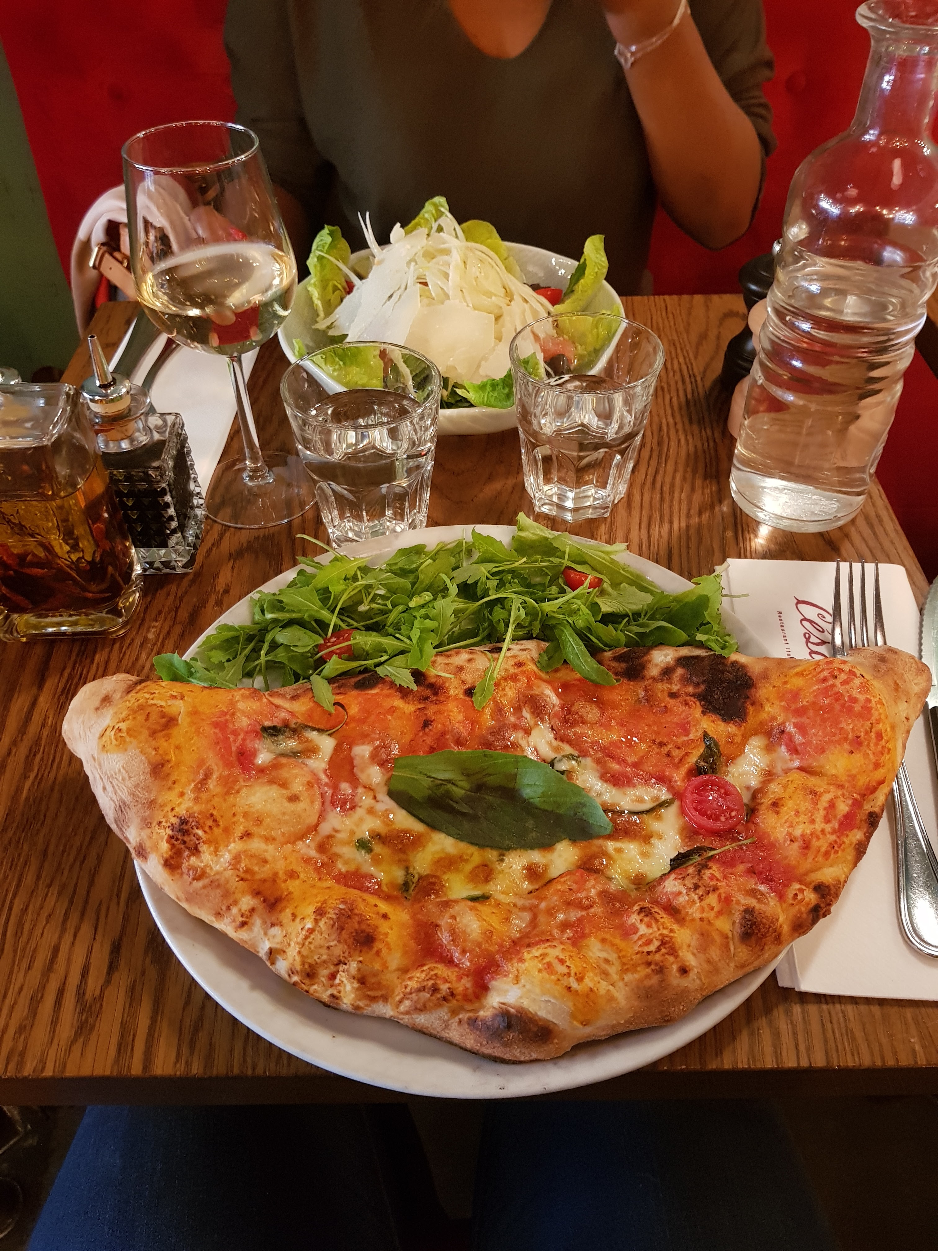 Joli cadre, un peu surfait pour le reste La pâte est épaisse et bien levée sur les bords (très bon), mais trop fine et détrempée au milieu. La pizza tartufo est fade Bouteille de Chianti à 39€, bonne découverte
