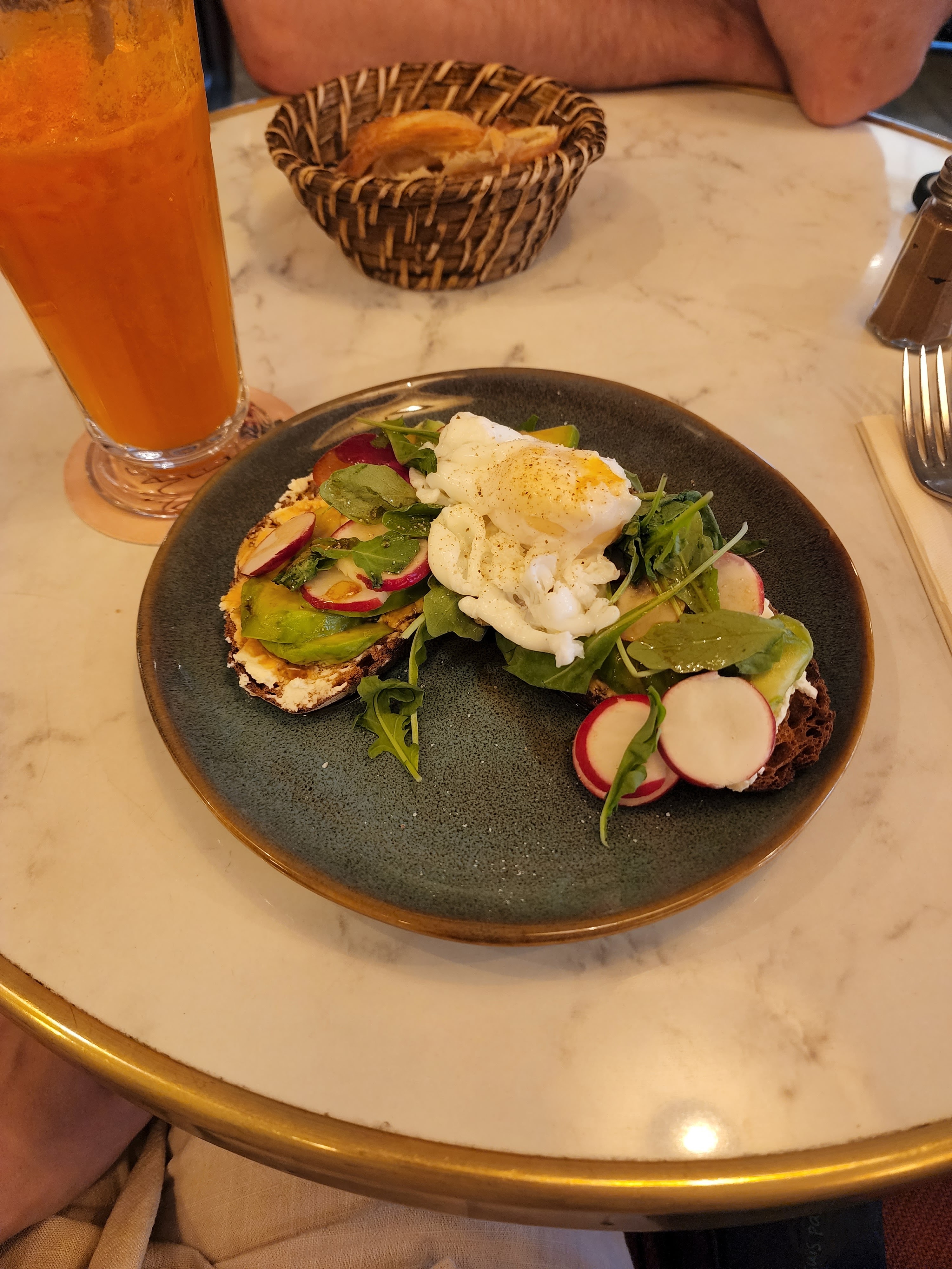 Nous nous sommes arrêtés aujourd'hui avant de consulter les critiques, ce dont je suis heureux. Notre serveuse était chaleureuse et arrangeante, malgré notre maîtrise médiocre du français. La décoration est accueillante et confortable. J'ai eu le toast à l'avocat et c'était meilleur que ce à quoi je m'attendais, ma seule critique est que le toast soit moins grillé. Il y avait aussi le jus ACE, très bon mais un peu acidulé au citron. Le partenaire avait un croissant, feuilleté et délicieux. Mais je reviendrais ici !