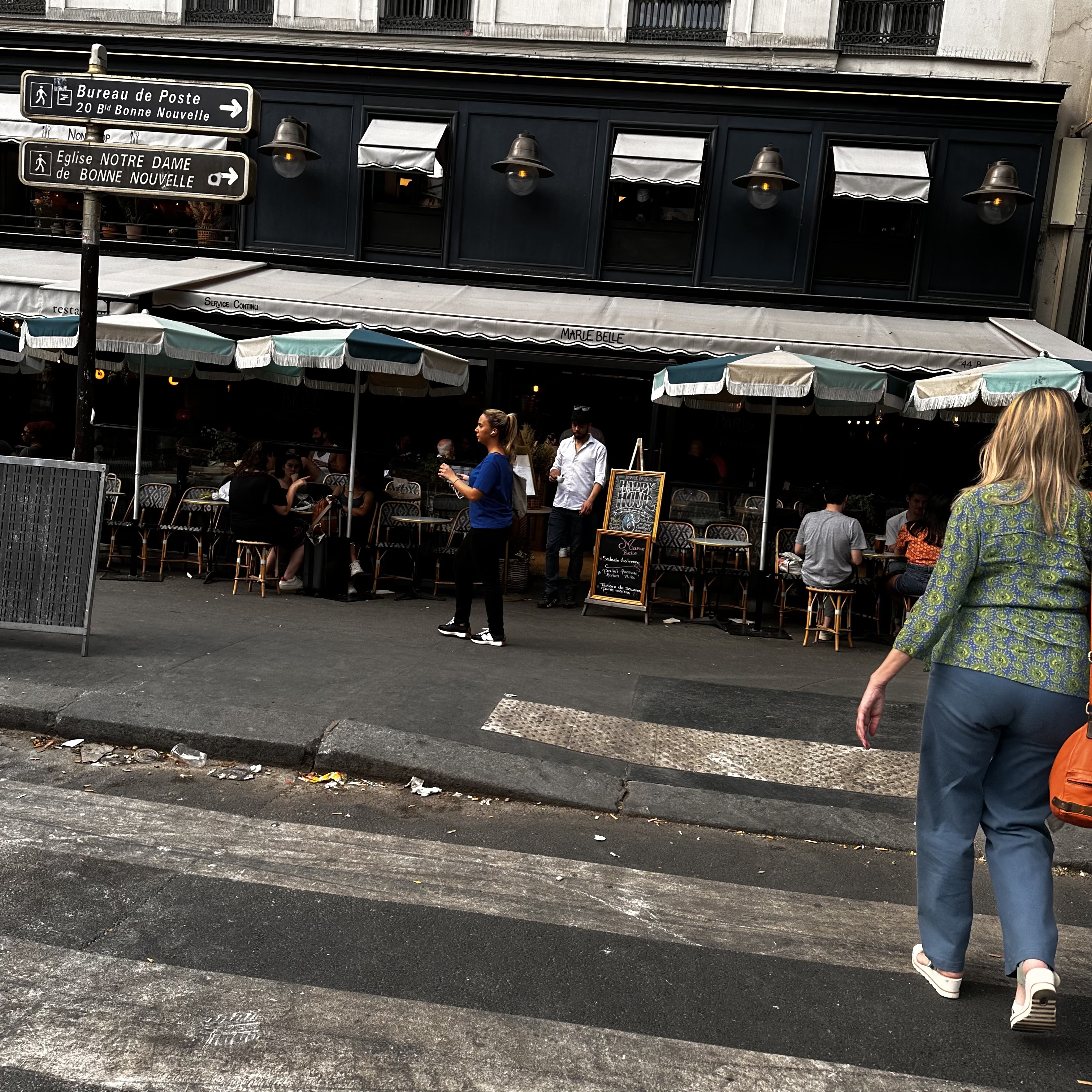 Des petits salons ou à l'étage, poste de choix pour contempler la belle façade du Grand Rex et les couleurs des Grands Boulevards, paillard de poulet des familles au déjeuner, avec sa purée maison dont je ne me lasse pas. Changement d'ambiance : le soir l'apéro amélioré avec des plats à partager. On ressort avec l'impression d'être partis en week-end.