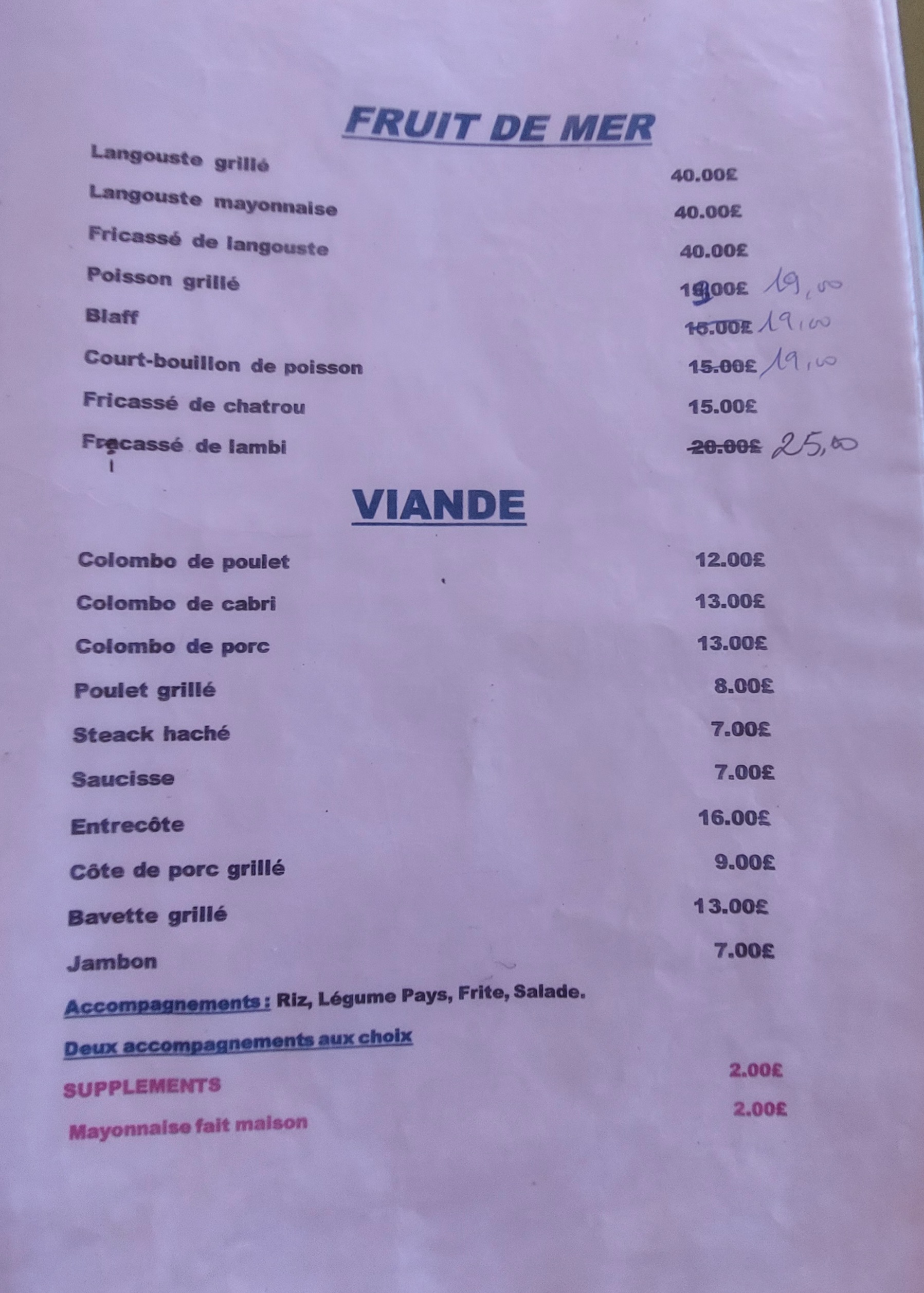 Le serveur était seul ce jour, un peu (beaucoup ++) débordé pour la gestion du restaurant qui était plein. De l'attente certe (20min avant d'être placé) mais nous sommes en vacances :) Assez atypique nous avions rempli nous même le bon de table, cela nous fera une anecdote à raconter. Au menu 2 planteurs (avec du rhum !), Une entrée accras (que nous avons pas eu) et en plat, fricassé de lambis (une découverte, donc pas de comparaison possible) et un Colombo de cabri (ultra fondant et portion généreuse, mon dernier souvenir de cabri était en Sardaigne). Nous sommes arrivés à 14h, sortis de table vers 15h45 avec deux cafés.
