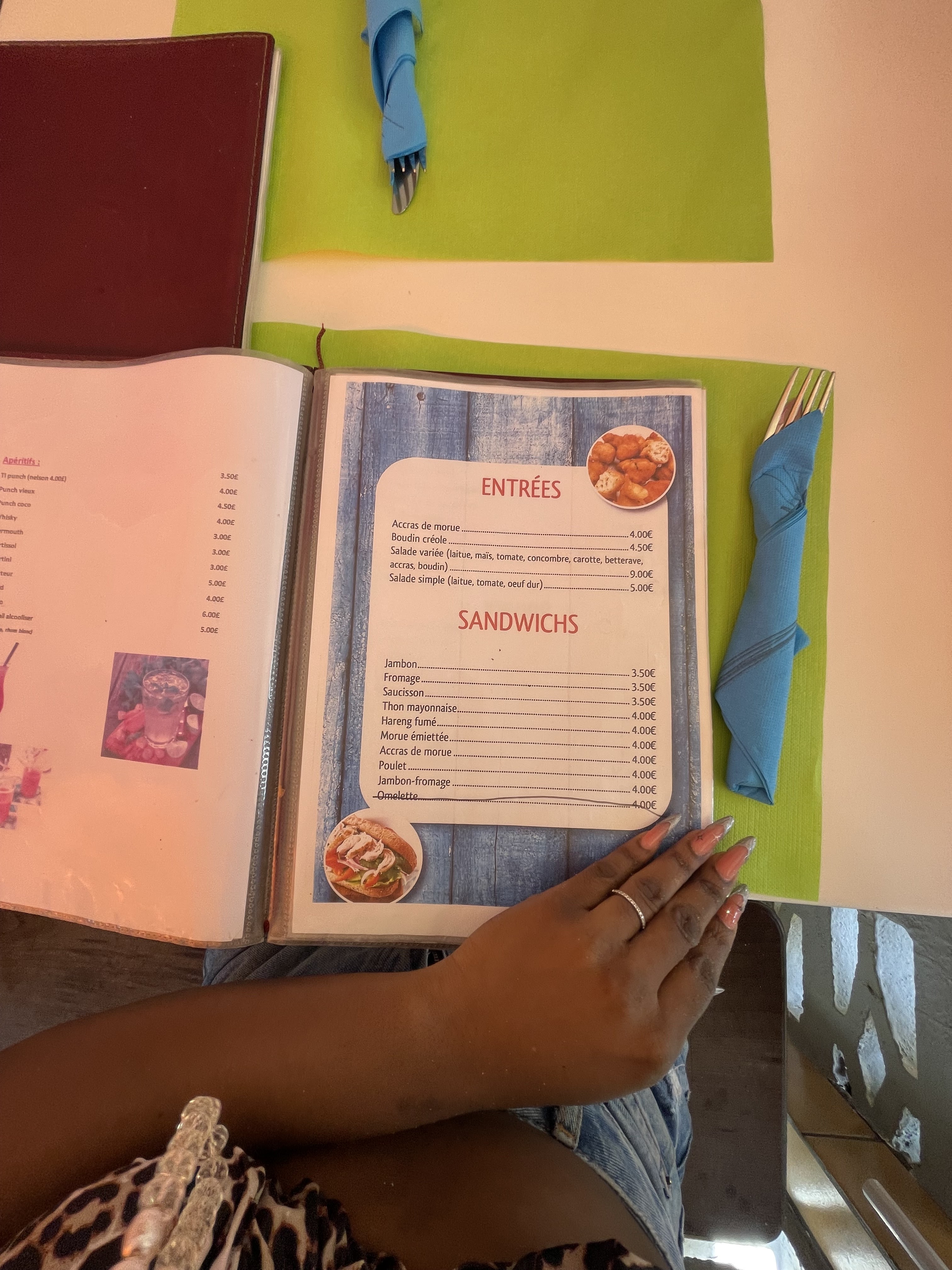 C’était vraiment un chouette restaurant avec une serveuse super sympa qui nous a conseillé des jus super bons ! Les accras de morue étaient vraiment bons et c’était un super rapport qualité prix. Par contre les sandwiches étaient bons mais sans plus. C’était vraiment pas cher.