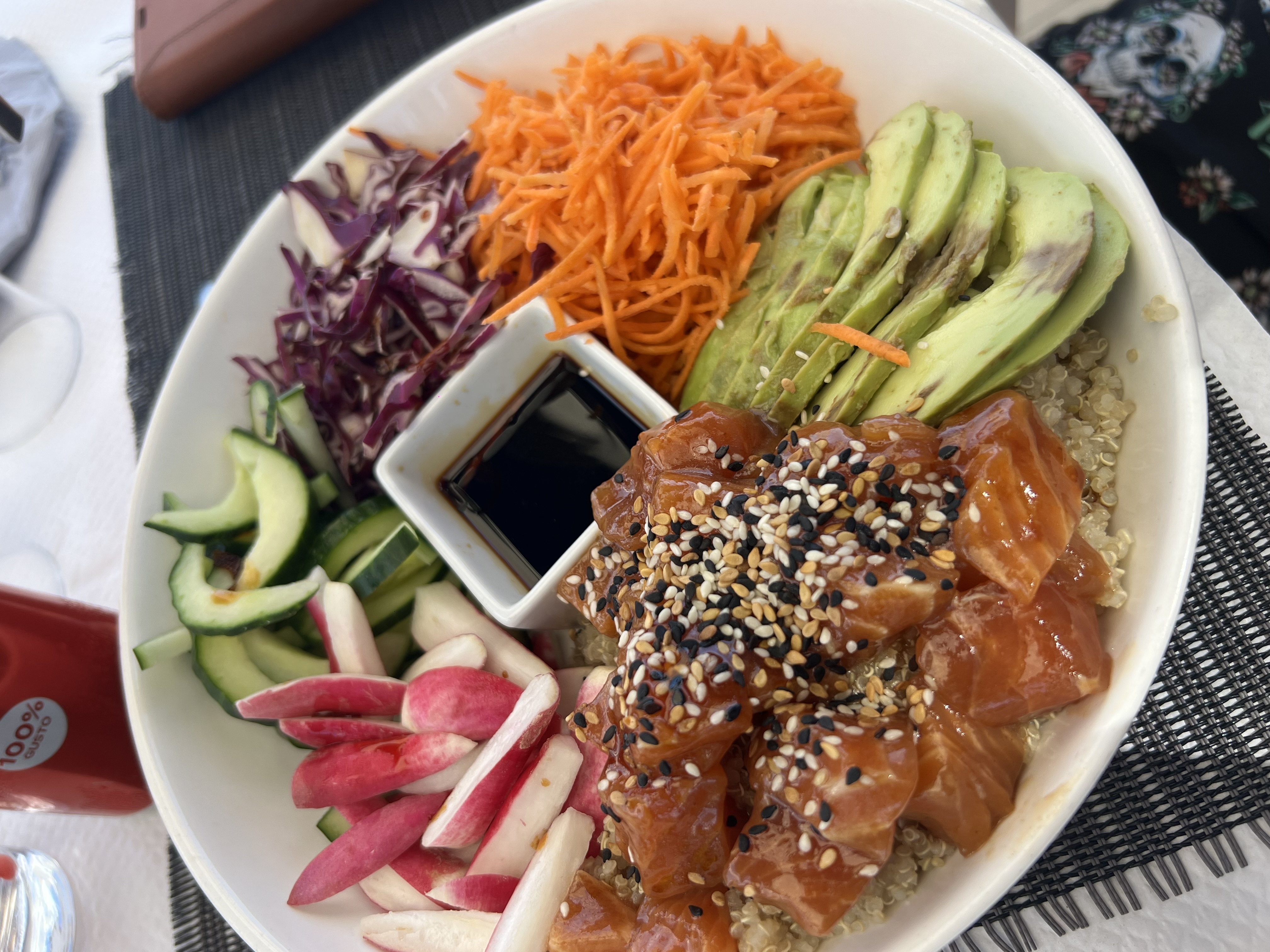 Si vous souhaitez déjeuner sur des tables en plastique avec fun radio en fond sonore, le tout agrémenté d’ un accueil pas vraiment aimable ni attentionné, c’est sans doute une adresse à fréquenter. Bien qu’il soit indiqué Pizzeria, la carte des pizzas ne nous a pas été présentée, sans doute réservée aux habitués qui savent que c’est possible. Nos assiettes de qualité différente, mon épouse ravie avec son poisson, mon poke bowl vraiment faible, un avocat pas mûr du tout et des crudités coupées en grosse portion (bien que l’assiette ait été laissée à moitié, aucune question du serveur… On ne se remet pas en question chez Marinella!) L’ambiance n’y était vraiment pas, et on n’ est pourtant qu’ en début de saison…