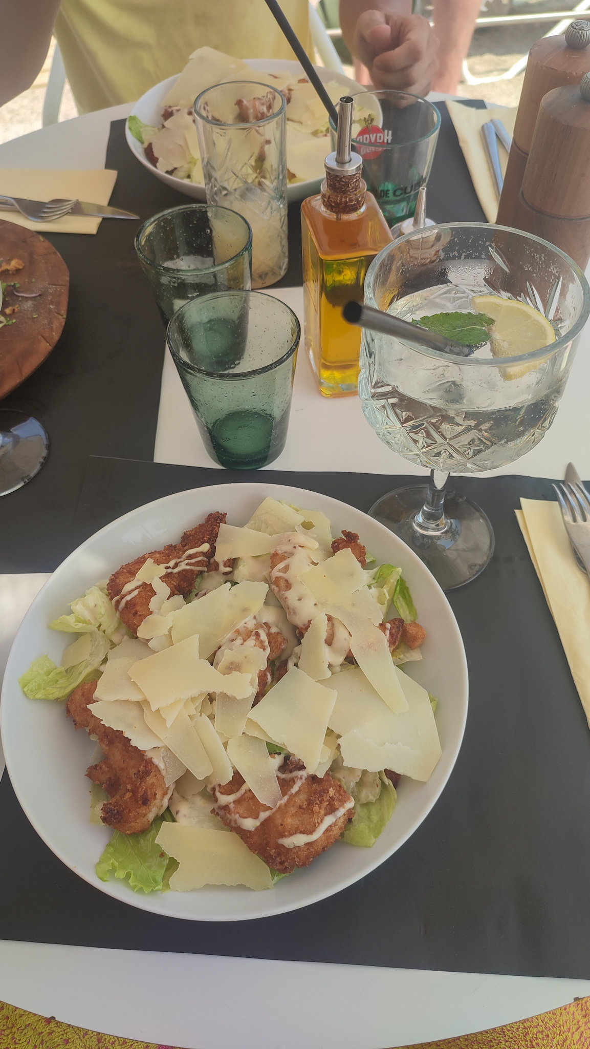 Dernier resto pour nos vacances Coktail a 11€ pas abusé Monsieur a prit un paccheri au homard et moi une cote de veau à la milanaise, un délice !!! Le staff est gentil et aimable Seul inconvénient, le prix des Transat, 30€ par personne pour la journée mais si on y va 2 ou 3 heures c'est le même tarif
