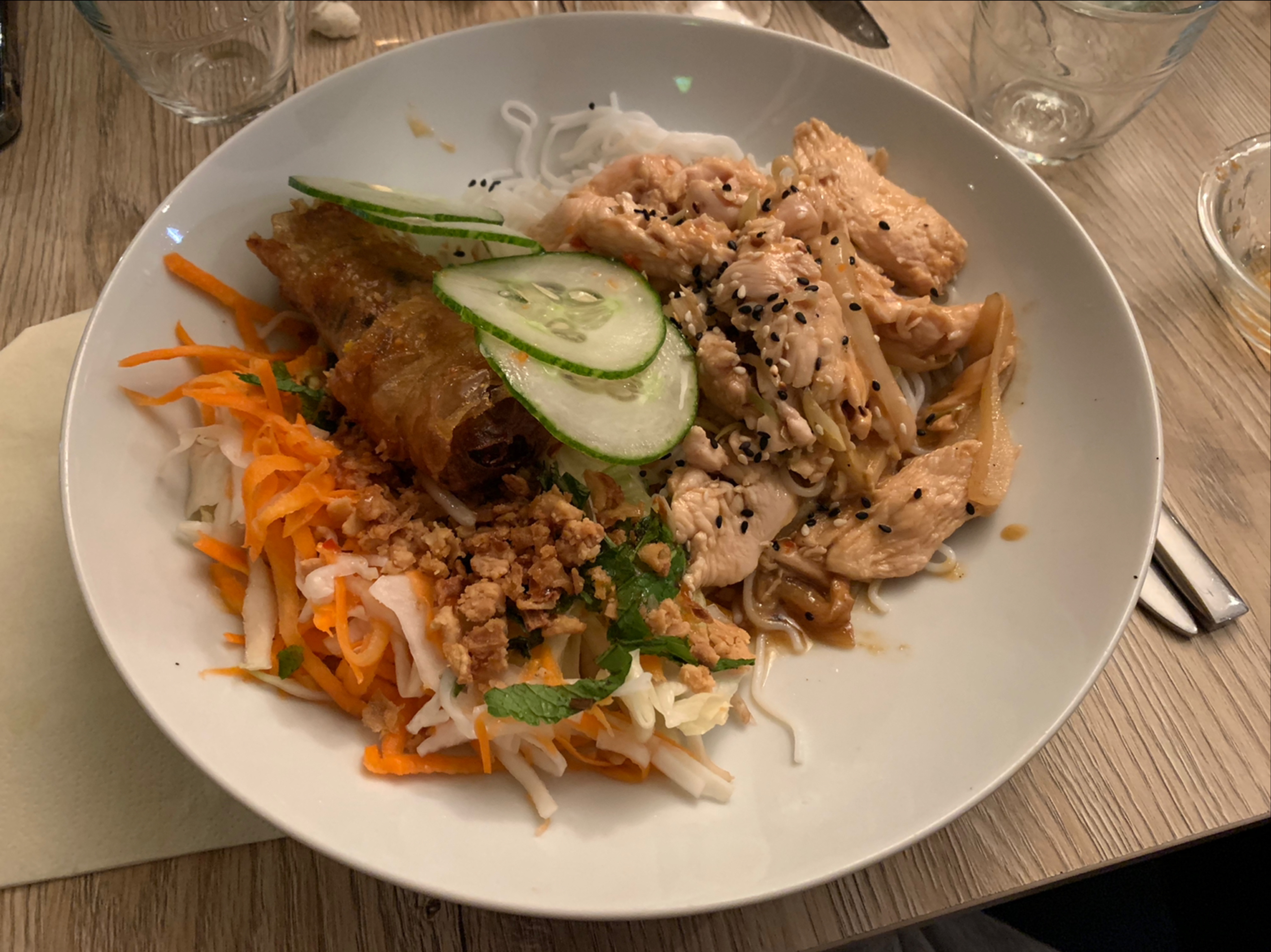 Repas particulièrement gras, fade. Nems trop cuit, à la limite du brûlé tout comme les oignons de mon bœuf aux oignons. Déçue.