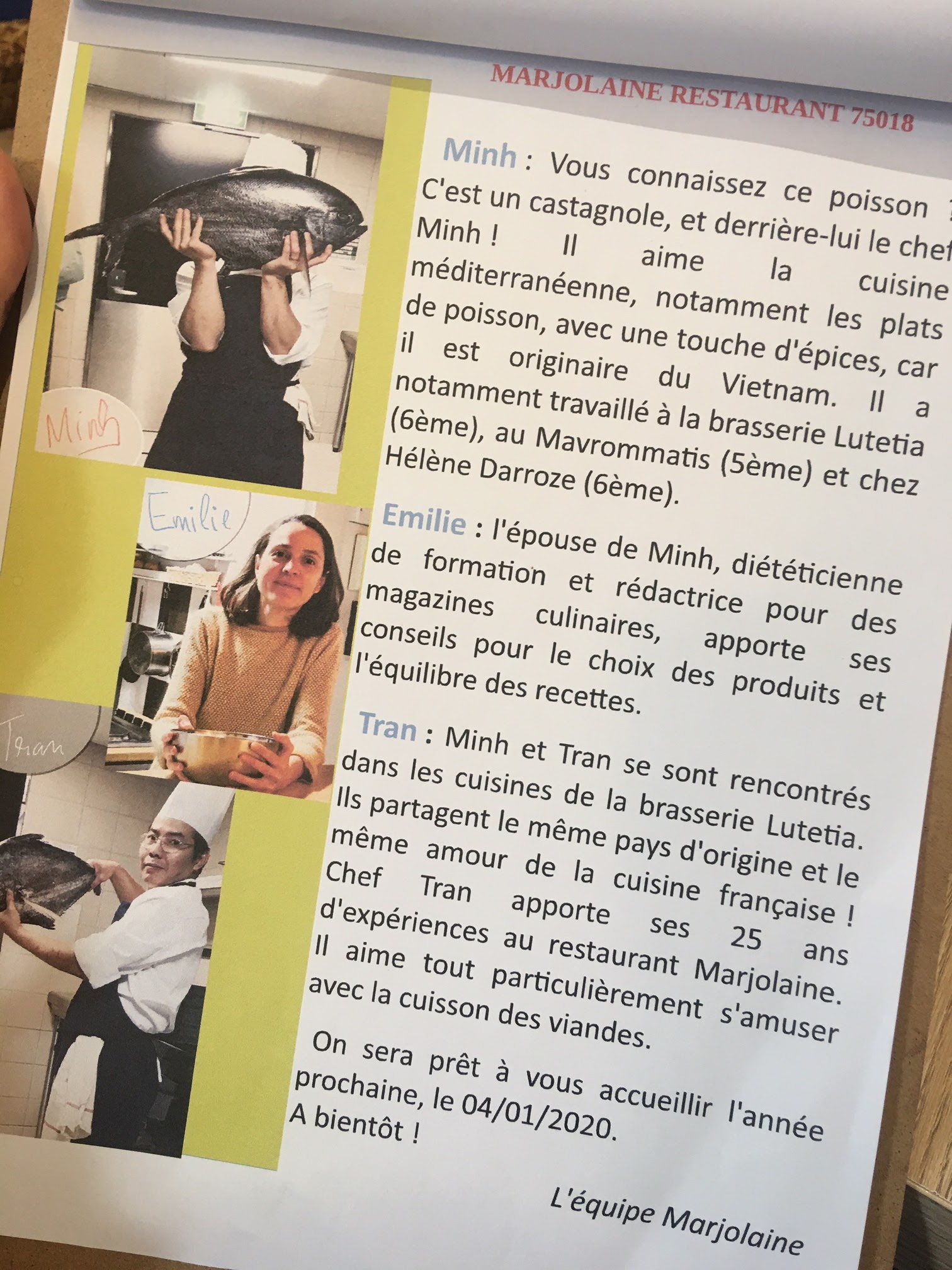 6eme visite chez Marjolaine et nous ne sommes jamais déçus! La carte franco vietnamienne est très originale et surprenante avec un véritable effort d’innovation. Les assiettes sont joliment présentées et savoureuses. Pour couronner le tout, l’accueil est toujours particulièrement attentif et chaleureux!