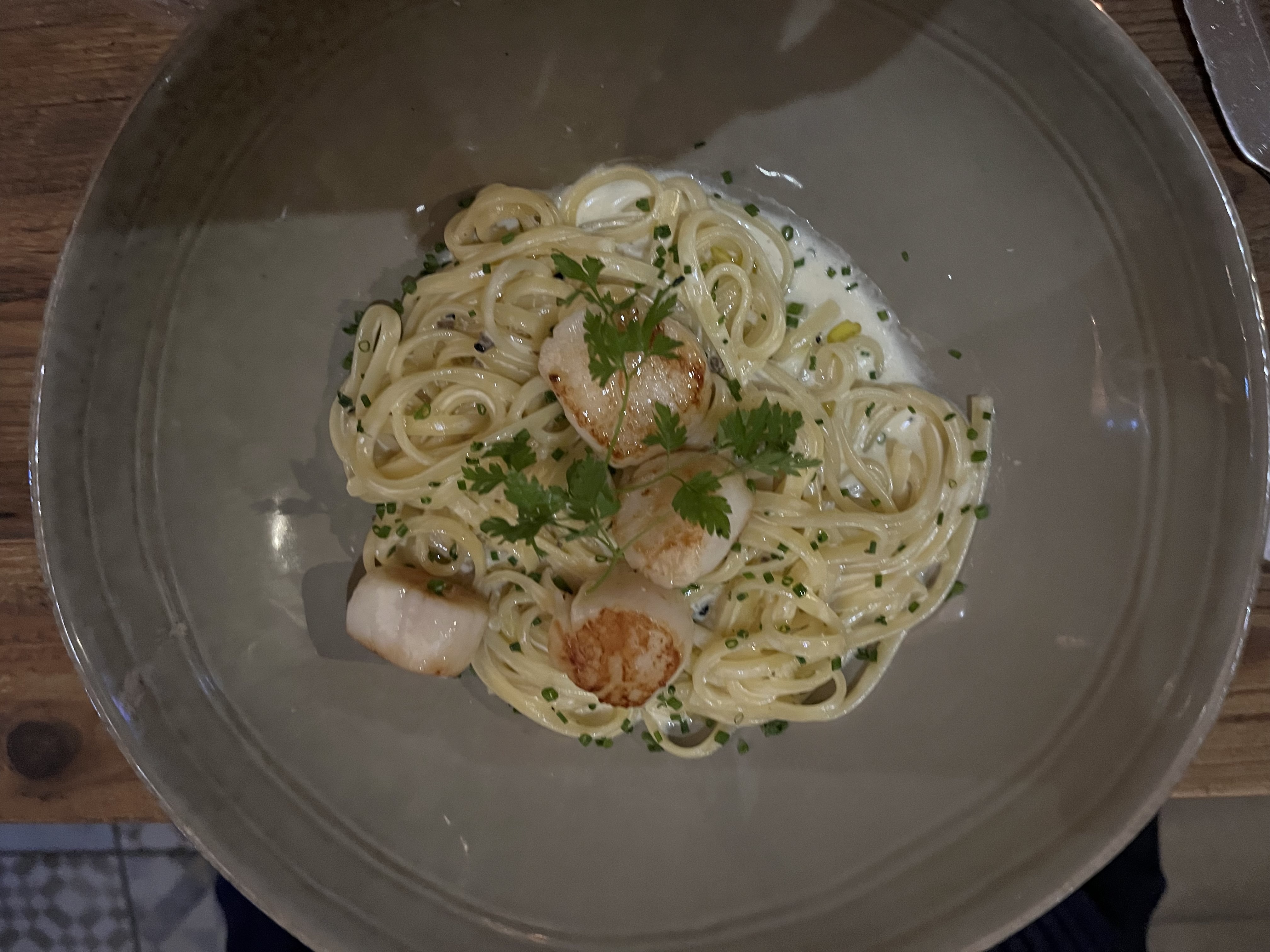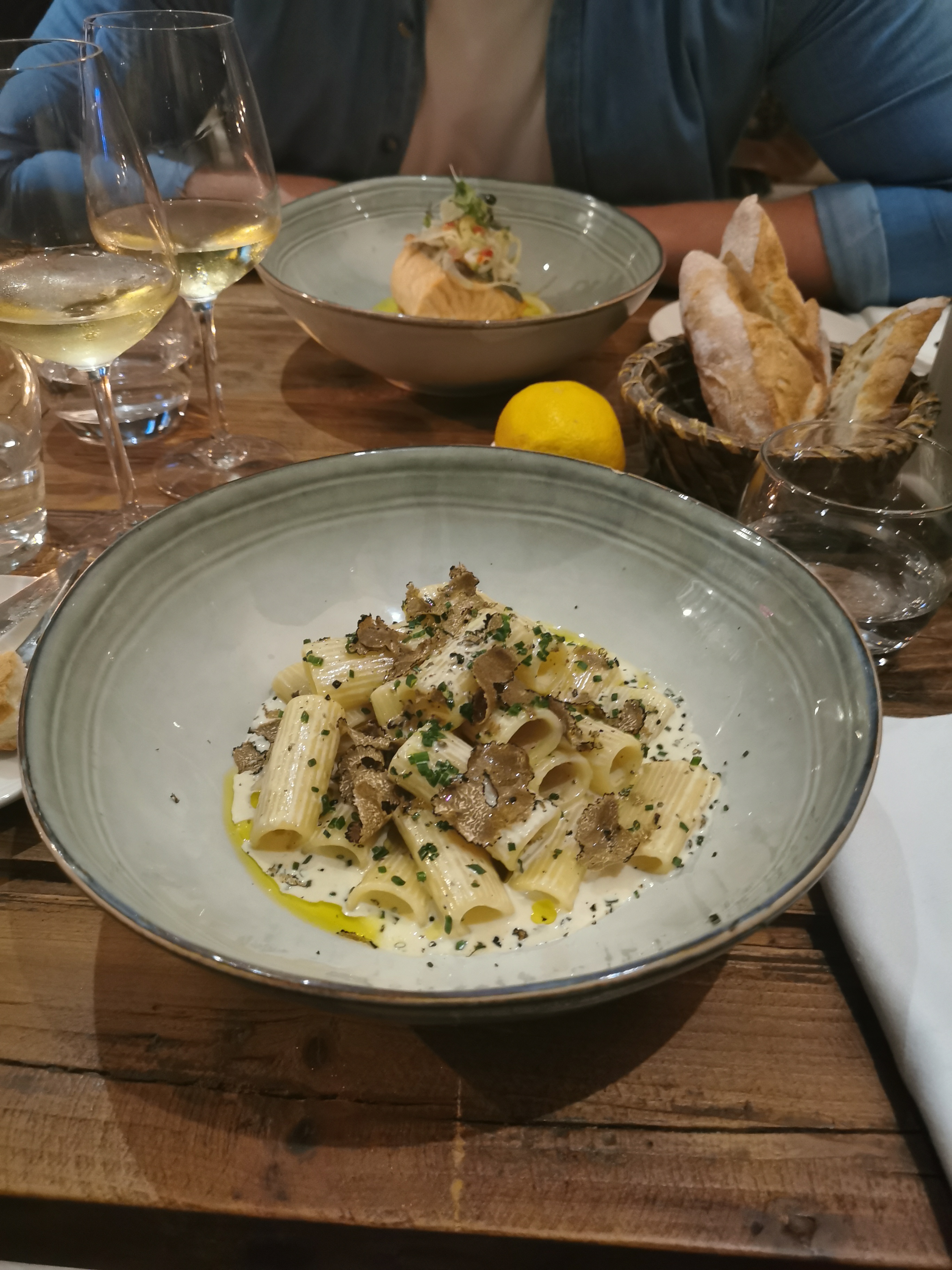 Après avoir tenté 2-3 fois d'y aller, j'y arrive enfin pour le 2ème service à 21h. En entrée j'ai pris des œufs parfaits avec leur mouillette à la truffe. J'en ai encore l'eau à la bouche! Ensuite des linguini saint Jacques + truffe. Un repas truffé d'excellence 😉 Je n'ai mis que 4 étoiles pour l'ambiance car la musique 🎶 était un peu trop forte. C'est peut-être le cas que le week-end et lors du 2ème service 🤔