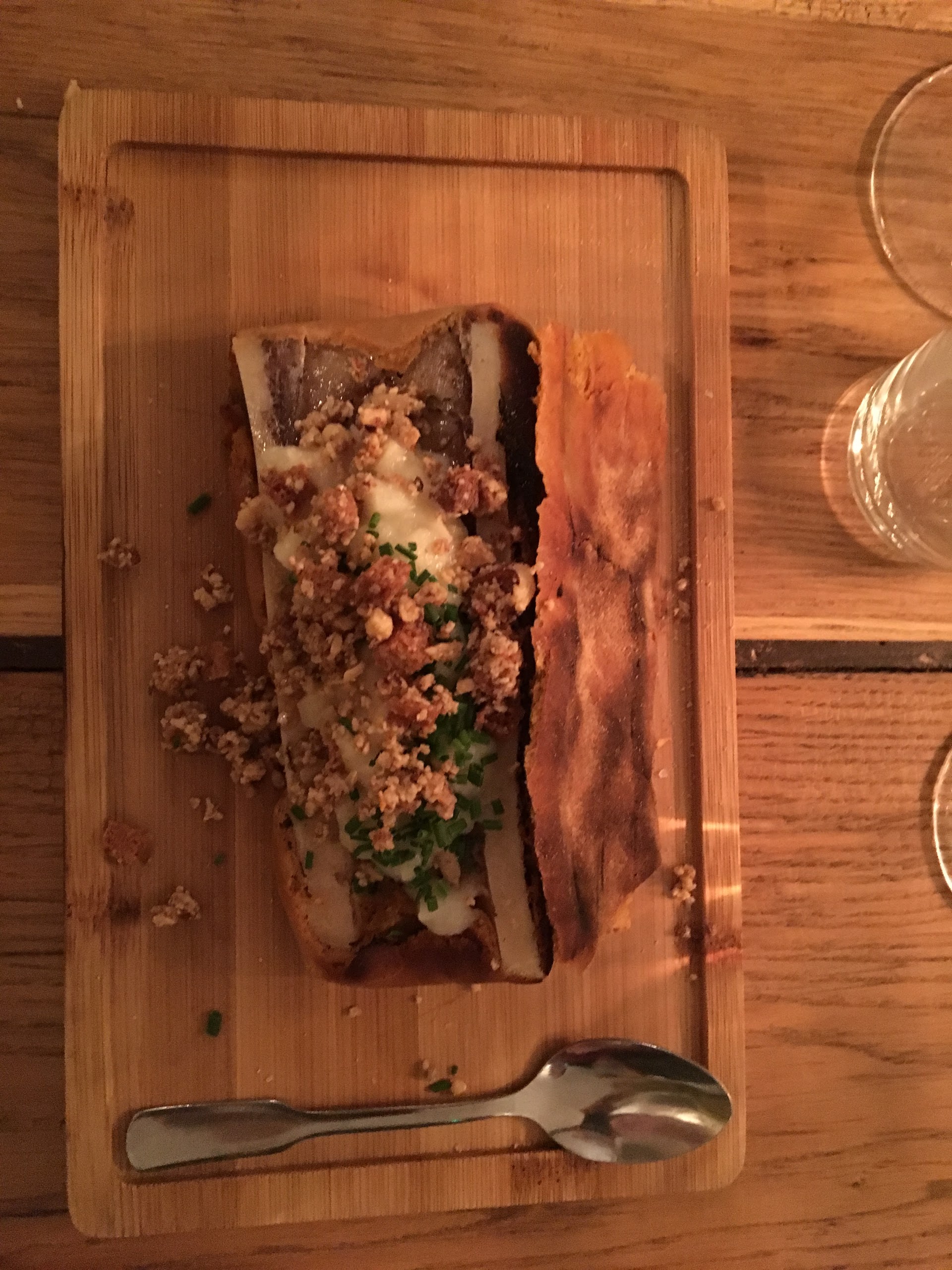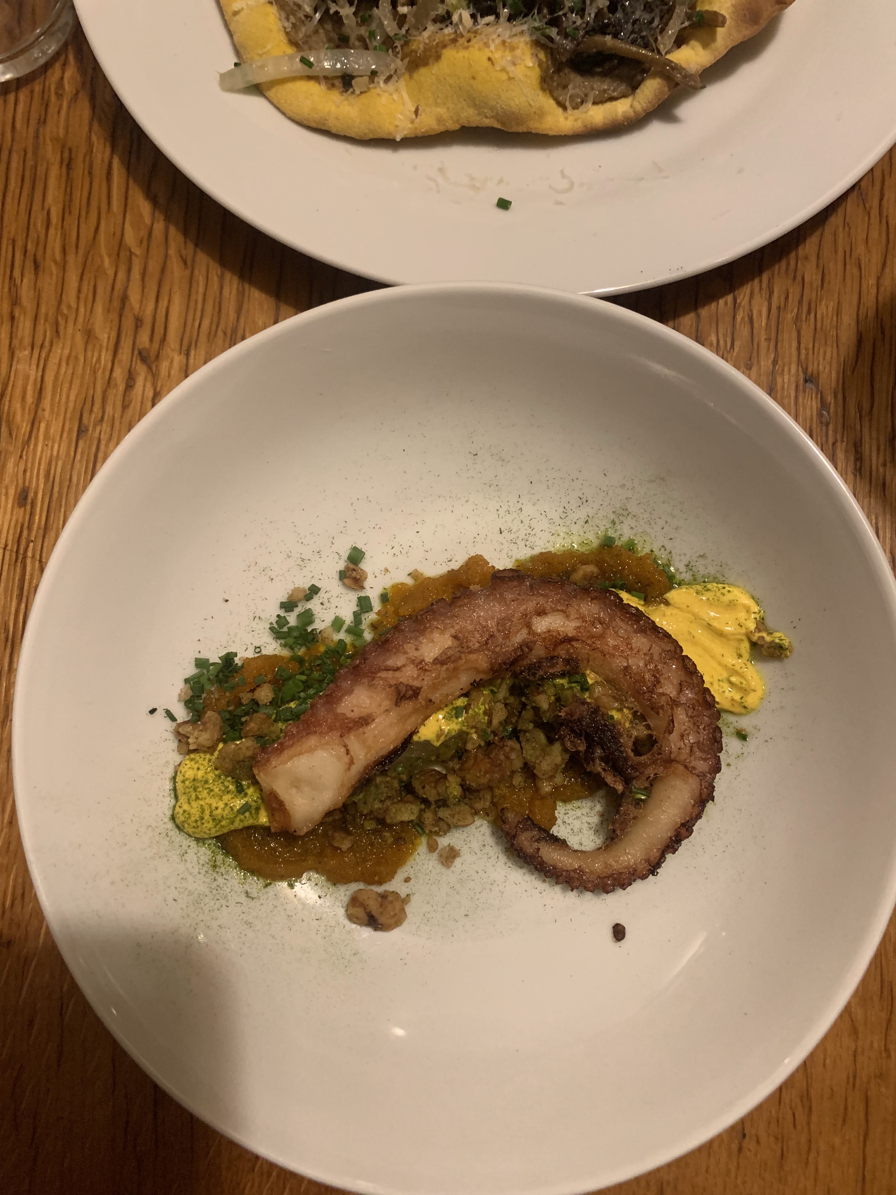 Le dixième arrondissement cache à nouveau une pépite! Et la pépite est bien cachée au pied de la gare de l'est entre un salon de massage et une autre façade miteuse. Si on passe devant sans savoir c'est simple, il y a peu de chance qu'on s'arrête... A l'intérieur tout change, la déco est canon efficace et jolie sans un gramme de bling: sharp! J'étais venu pour manger du poulpe, un des plats signature de la maison avec l'os à moelle (marrow en anglais), et ce fût je crois le meilleur poulpe de ma vie. La langue de boeuf est aussi bonne que ton souvenir de cantoche est cauchemardesque. On a eu la chance en plus d'être servi par le chef (Hugo) qui avait lâché la cuisine pour le service.