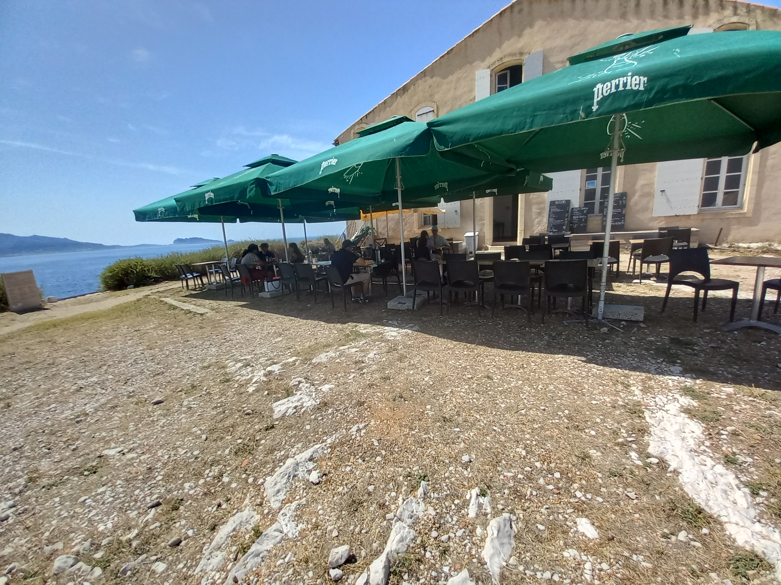 Seul commerce de l'île, on se dit forcément que c'est un attrape touriste mais les prix sont correct. J'y fais un arrêt pour boire un verre, on me demande 4€ alors que c'est afficher 3.60€ sur la carte ... J'ai commander un pâté de campagne qui avait aucun goût et qui tenait pas, servis avec un chutney pour 11€ ... Je demande l'addition, cette fois ci elle concorde au prix indiqué 14.60€, je paie 15€ mais pas de rendus monnaie ... Le seul point positif c'est la vue sur Marseille