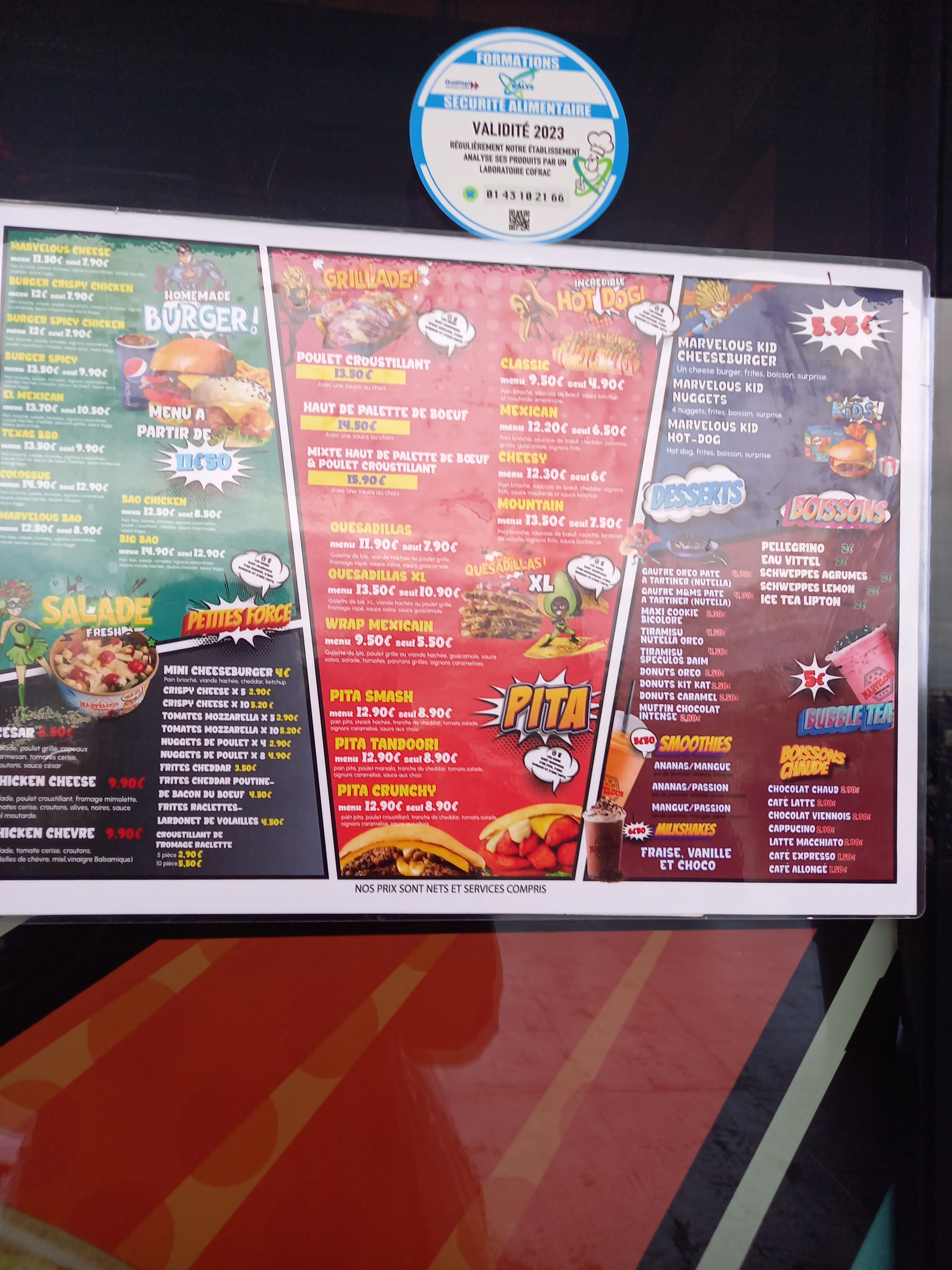 Bonjour hier j'étais au centre commercial grands j'en ai profité pour aller manger avec ma femme et mes enfants chez marvelous malgré les prix Cher nous avons testé et malheureusement très déçu j'ai trouvé tout d'abord bizarre qu'il nous serve aussi rapidement alors que nous étions 6 ils doivent faire cuire la viande a l'avance en ce qui concerne la viande achée et le poulet de plus c'est extrêmement salé. Pour finir ma famille et moi avons passé la soirée au WC jusqu'au petit Matin pour finir je pense que beaucoup d'avis sont faux pour fast-food dommage malgré la decoration et l'emplacement j'abandonne.