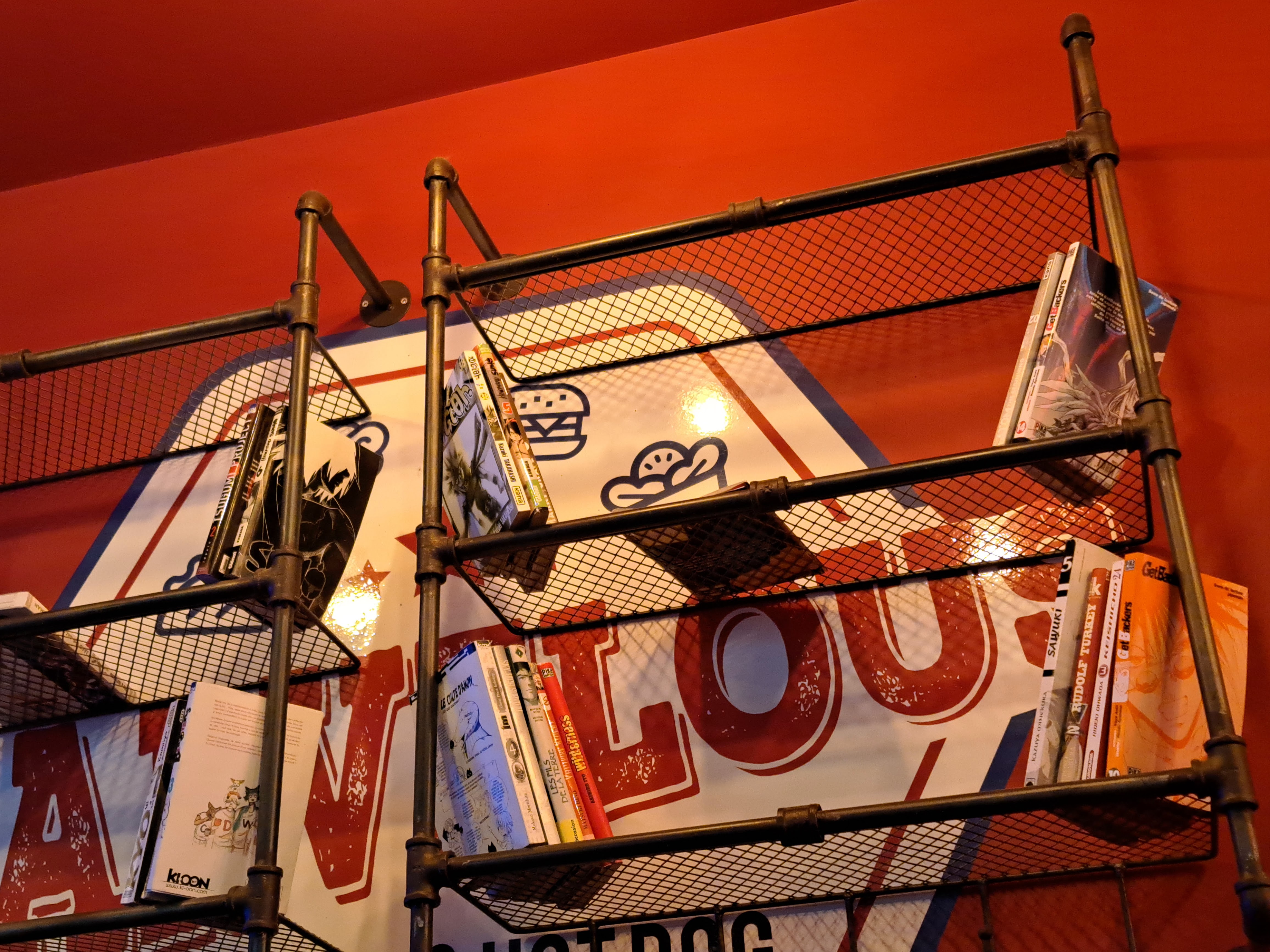 Restaurant avec un service au top 👌 J’ai pris un hot-dog Mountain (fromage raclette, lardons…), frites et boisson avec une salade chèvre chaud pour ma fille. Ma sœur a pris un hot-dog Mexicain (fromage, guacamole…) frites et coca max. Nous avons été servie par un jeune garçon (cheveux bouclés) qui était au comptoir. Il nous a offert 2 cafés. Un grand merci à lui 👍✊👊 Je recommande… (Pour les amateurs de mangas, il y a des étagères avec des bouquins…).