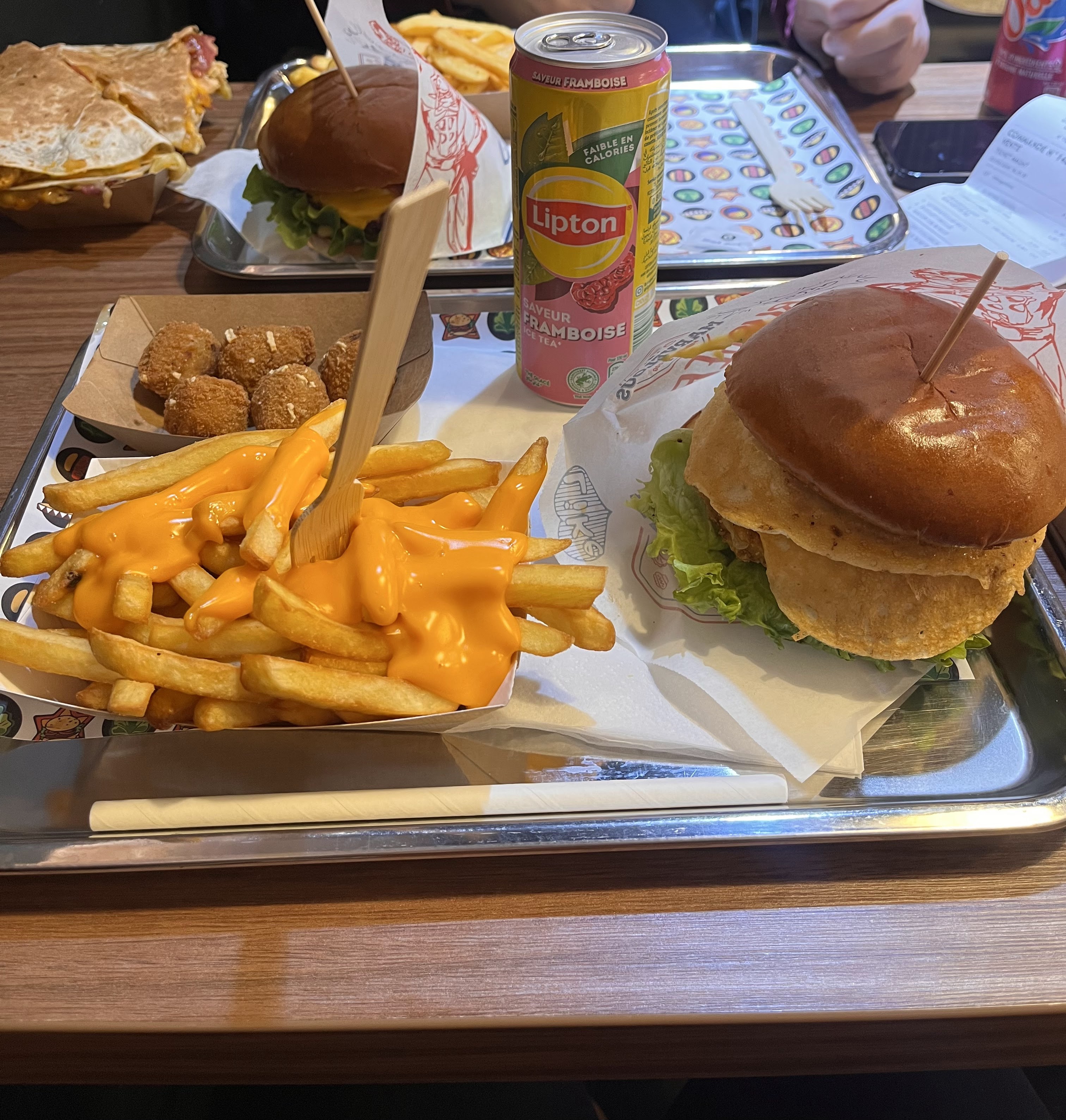 Trop de choix; ce qui complique et ralenti les commandes sur les bornes. Burgers corrects mais sans plus. mon pain était gras, je me demande pourquoi, donc pas simple à manger. Frites façon Poutine … tout dépend si on connaît les Poutines ☹️. Pepsi et pas de Coca. La déco est sympa mais pas de qualité, ça commence déjà à se dégrader.1er essai non concluant me concernant.