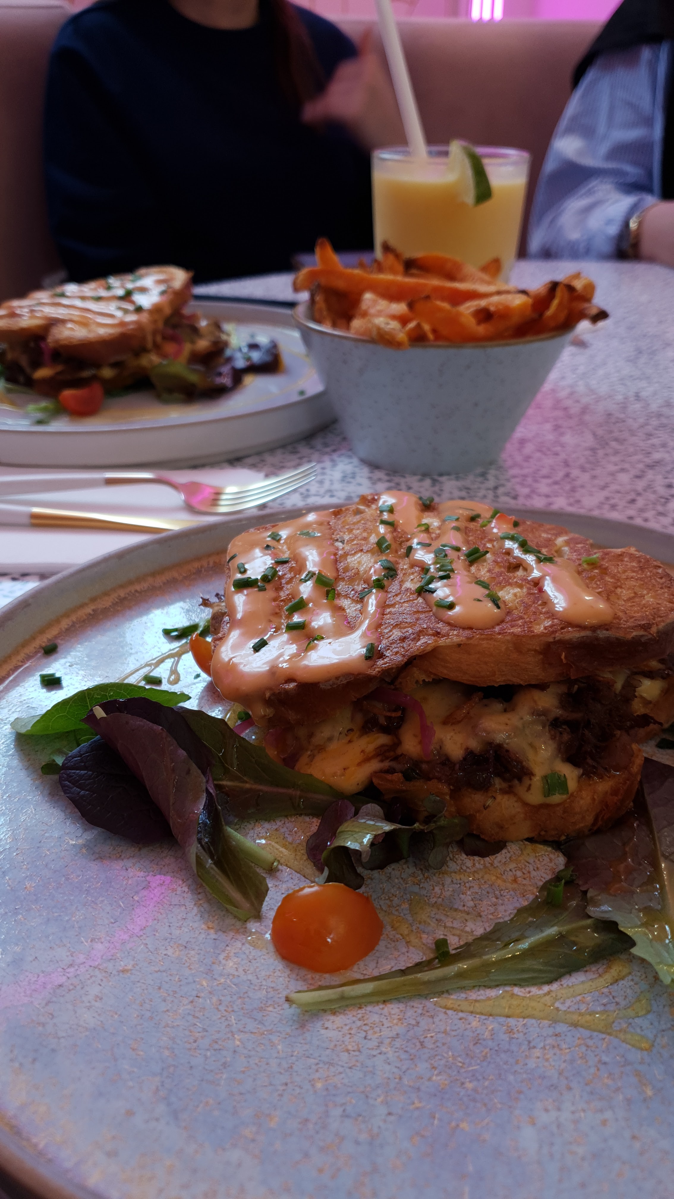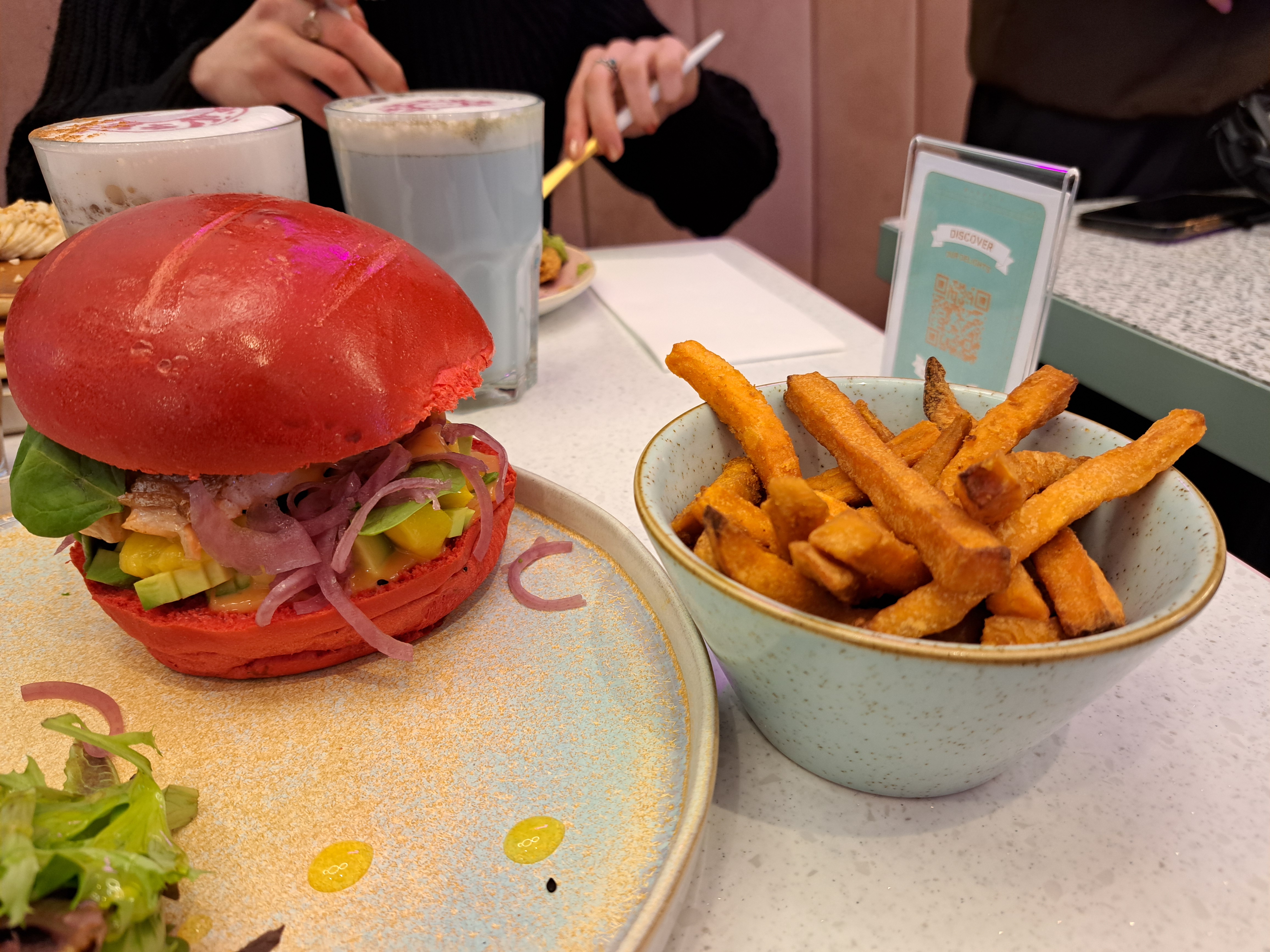 Lieu très prisé des jeunes, je recommande ++ aux heures d'ouverture pour bruncher. (Pas de réservation possible) Le lieu est très beau, haut en couleurs, instagrammable mais les plats proposés sont classiques. Le Burger pavé de saumon était bon (portion de saumon généreuse) mais trop prédominant dans le Burger : on ne sent pas les autres ingrédients. Jai trouvé le burger cher pour la qualité. La boisson Ferrero rocher chocolat blanc était bonne mais très sucrée.