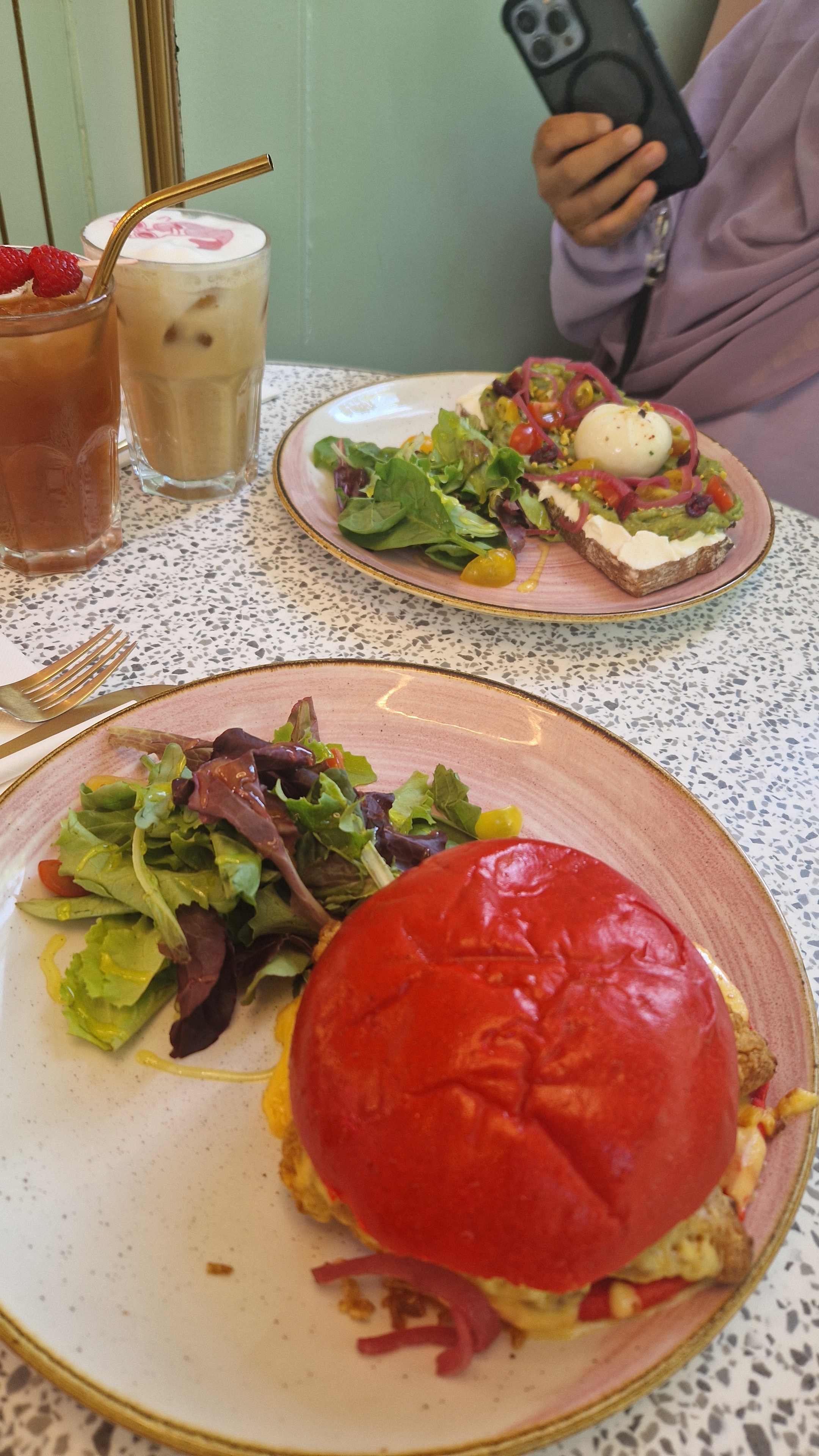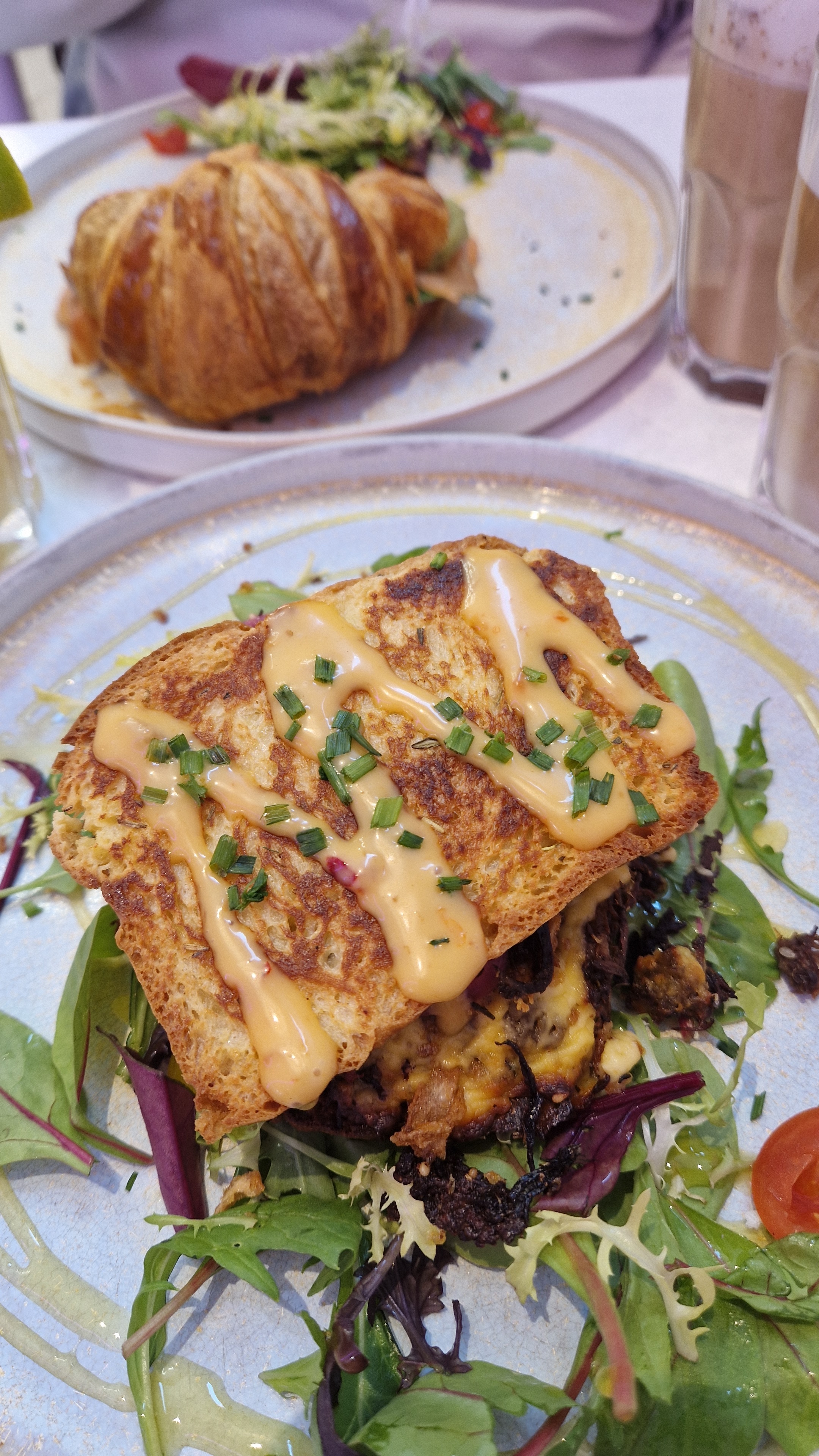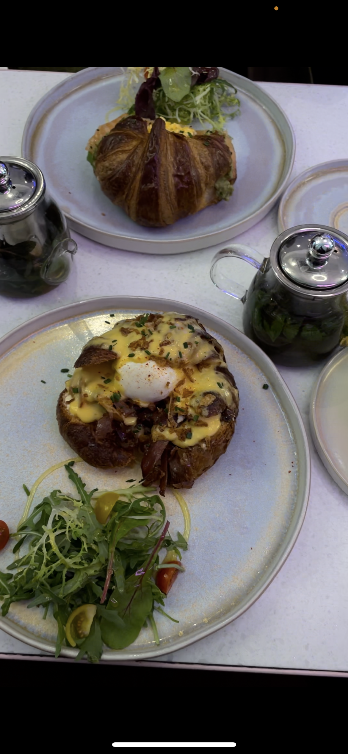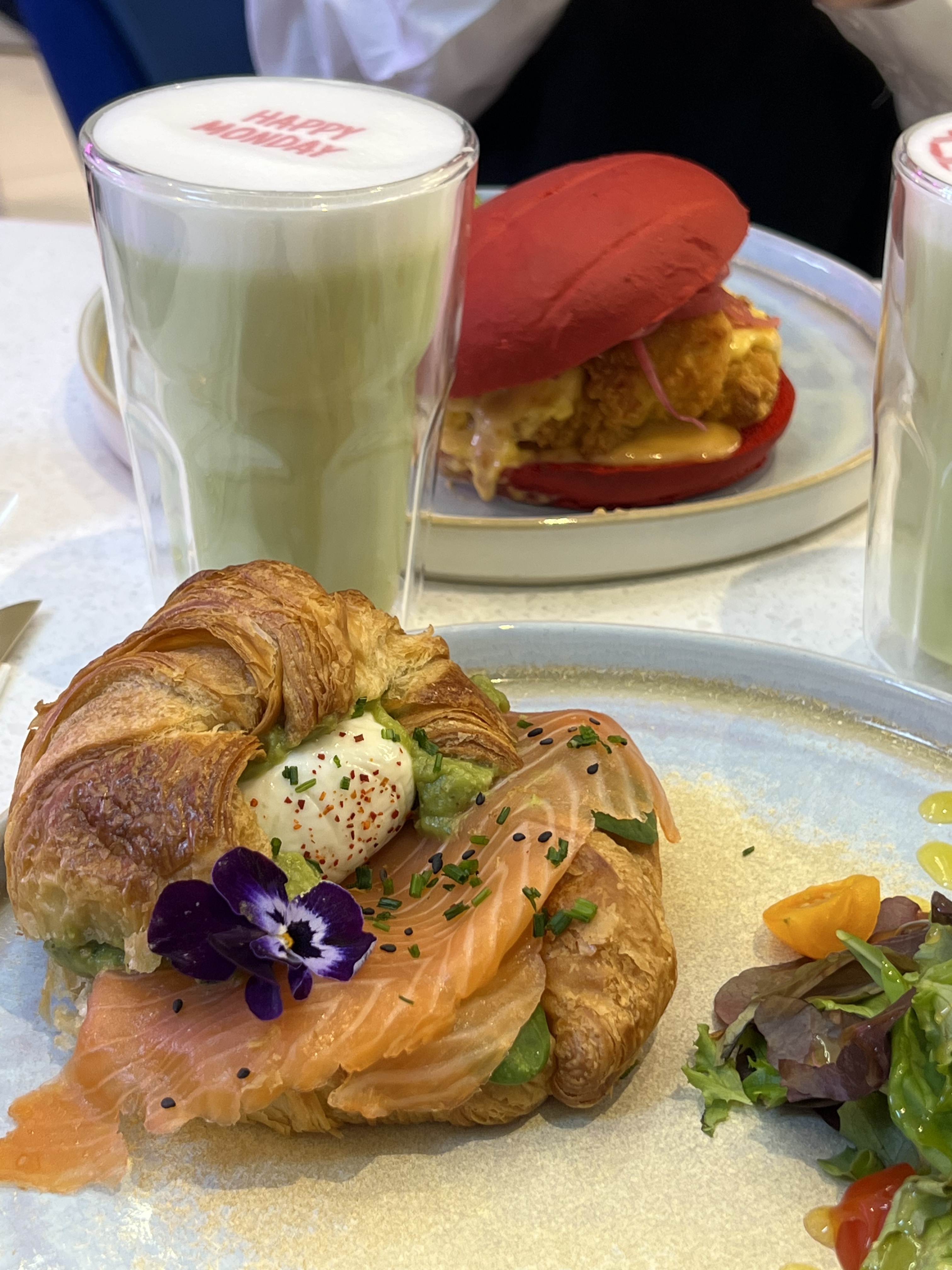 On a fait 50 minutes d'attente, ça mérite si vous voulez l'ambiance et un bon brunch, aussi les plats sont pour des photos sur Instagram. Je recommande 💯, par contre soit vous venez très tôt ou très tard. Sinon l'attente est longue. On a commandé un burger Chicken, un croissant avec saumon, et du thé rose et chocolat raffael. Au top!