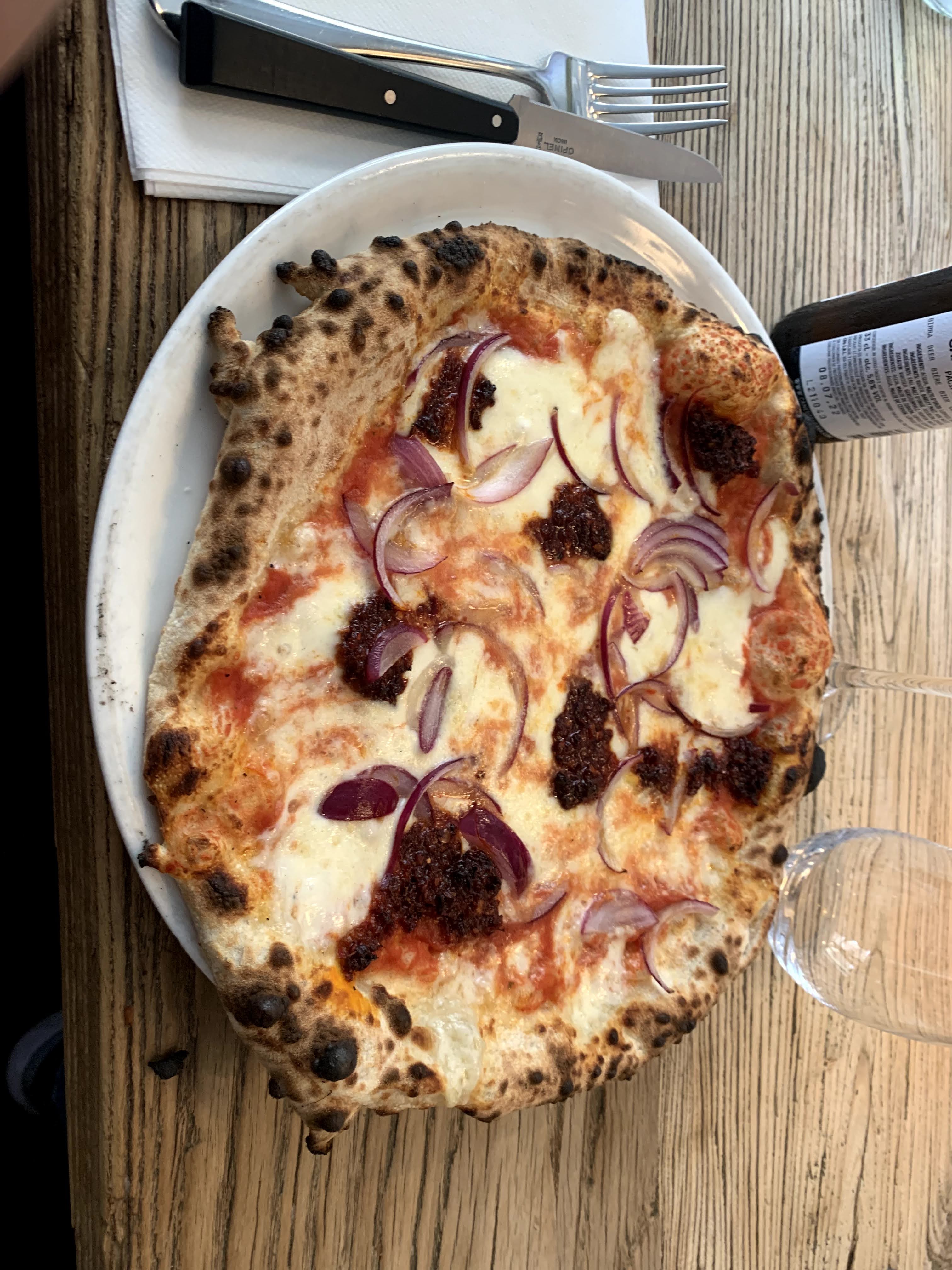 On est venu mangé un midi, le restaurant était rempli par des employés de bureau… La cuisine est bonne et rapide. Cependant notre huile piquante n’est jamais arrivée, le serveur nous a sûrement oublié. La pizza à la truffe est plutôt légère par rapport à celle à la saucisse piquante fromage et purée d’aubergine. Cette dernière est vraiment originale par rapport aux autres pizzerias. La bière en collaboration avec ce restaurant est un peu trop originale (un peu acide et bizarre en bouche) et je ne vois pas pourquoi elle est au prix de 8€ (pour une bière en bouteille). Les prix sont assez élevé pour une pizza, après ceci se justifie sûrement par le quartier.