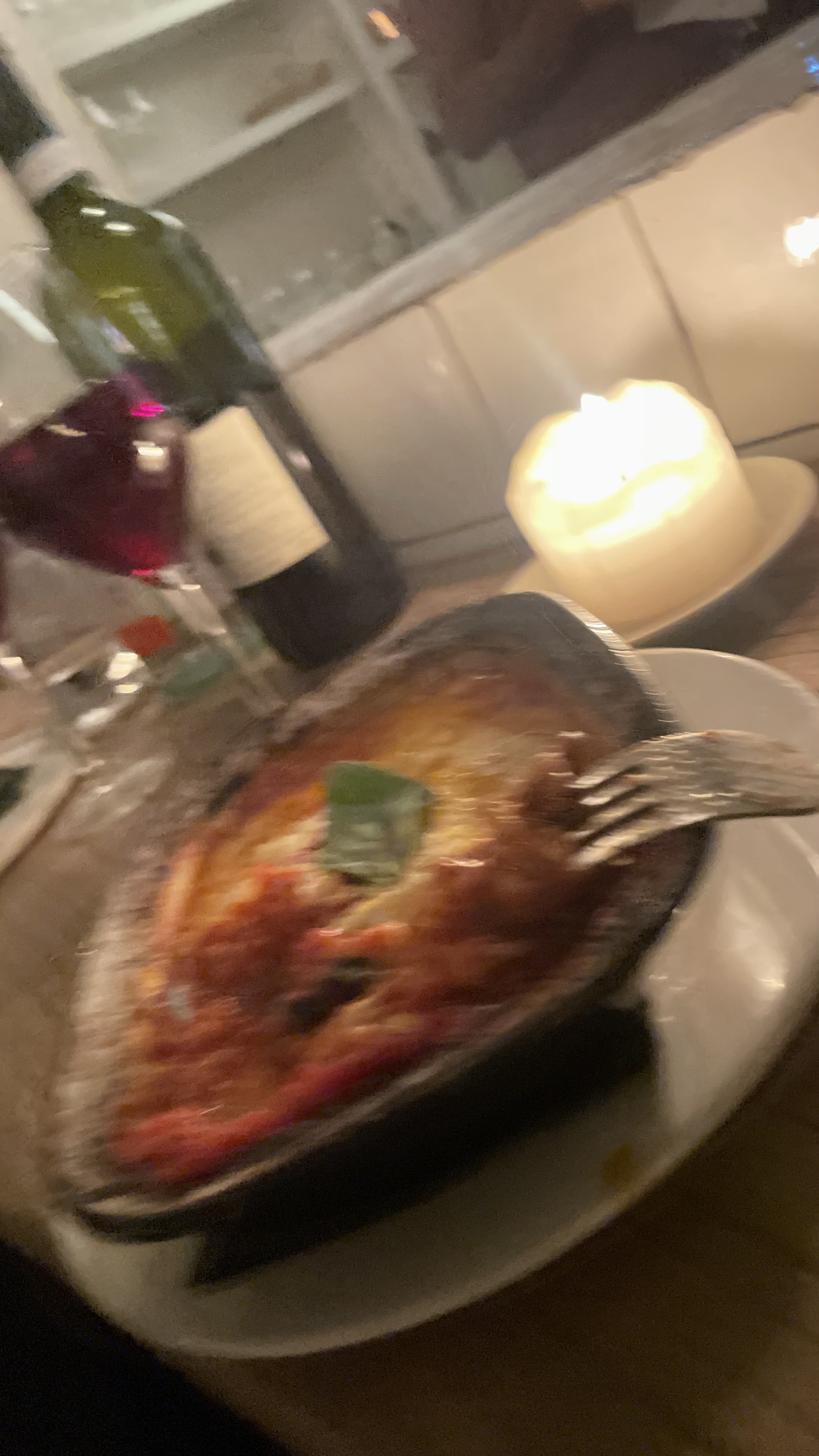 Lasagnes très bonnes Pâte de la pizza un peu grillé De bons ingrédients Vin italien excellent