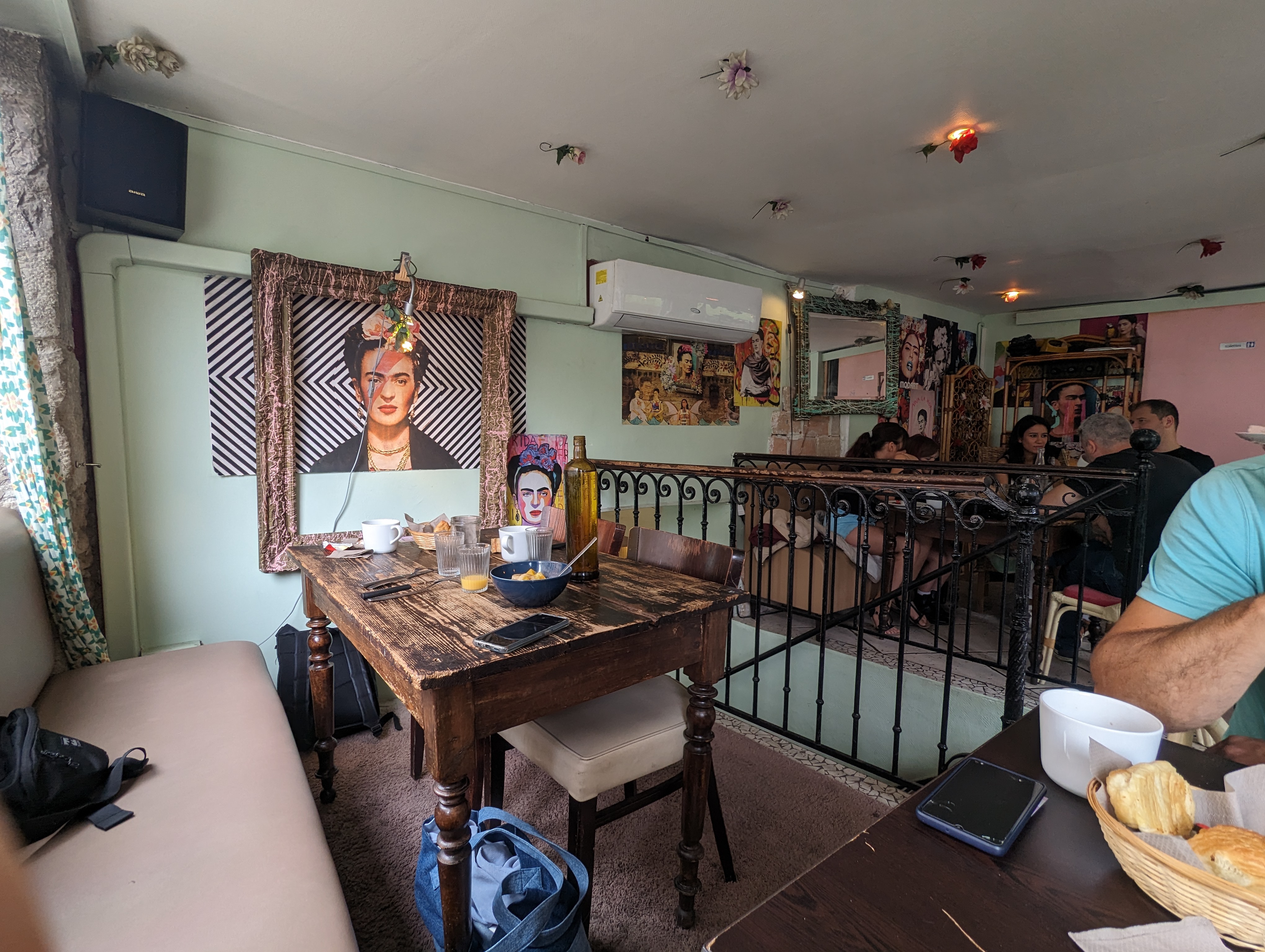 Un SCANDALE, vraiment une honte ! A FUIR On joue sur le côté bobo / grunge de Croix Rousse mais là c’est se moquer des clients. Petite musique « mexicaine » et Frida Kahlo au mur mais la nourriture n’est pas bonne, pas fraîche, avec très peu de choix (charcuterie, légumes marinés, petites tranches de fromage et nouilles). Je ne parle même pas de l’HYGIENE qui est déplorable (mur de la cuisine plein d’éclaboussures douteuses, les tasses, les bols et les couverts sont sales, assiettes ébréchées, c’est poussiéreux…). On était 4 on a tous été barbouillés l’aprem !! Un brunch a 25€ a volonté mais rien n’est qualitatif : des tortillas dont les pommes de terre sont grises tellement elles datent et dont le dessus est tout racorni, le café est en gros thermos comme sur les chantiers, le pain et les viennoiseries sont rassis, confitures en petit pot en plastique comme à la cantine. Au delà du brunch je crois que c’est depuis longtemps un des pires endroits où je suis allé manger. J’ai eu honte d’emmener mes amis là bas, j’ai dit au revoir par politesse mais je n’y retournerai jamais et je ne recommande pas du tout !! Vous avez 25€ ? Achetez vous des œufs et un avocat et faite un petit dej chez vous mais pas là bas.