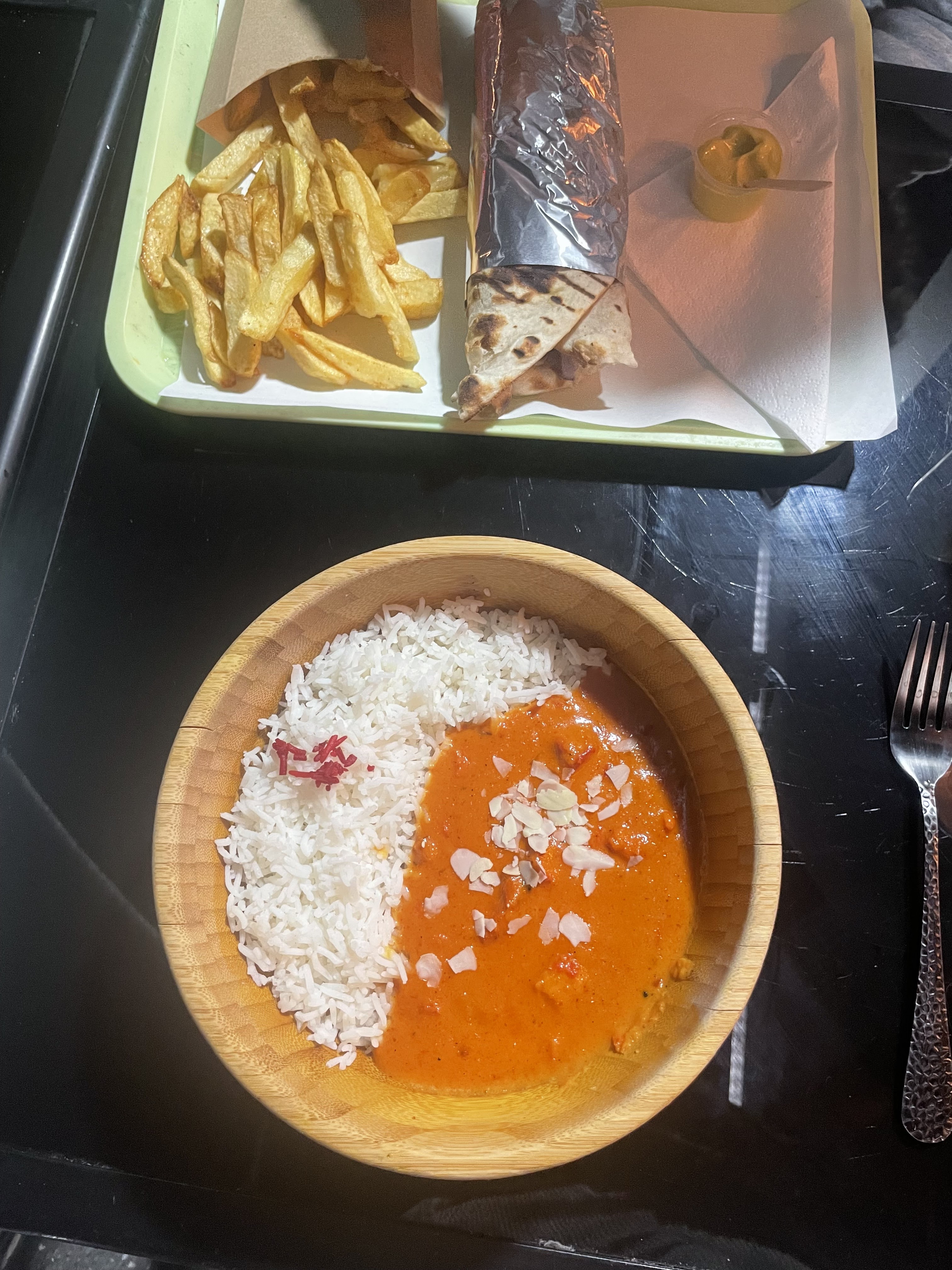 Bowl tikka massala portion genereuse, gout tres relevé. Et un naan tikka tres bien epicé avec une portuon de frites FRAICHES!! De tres bon gout. Service tres bien. Je recommande !!