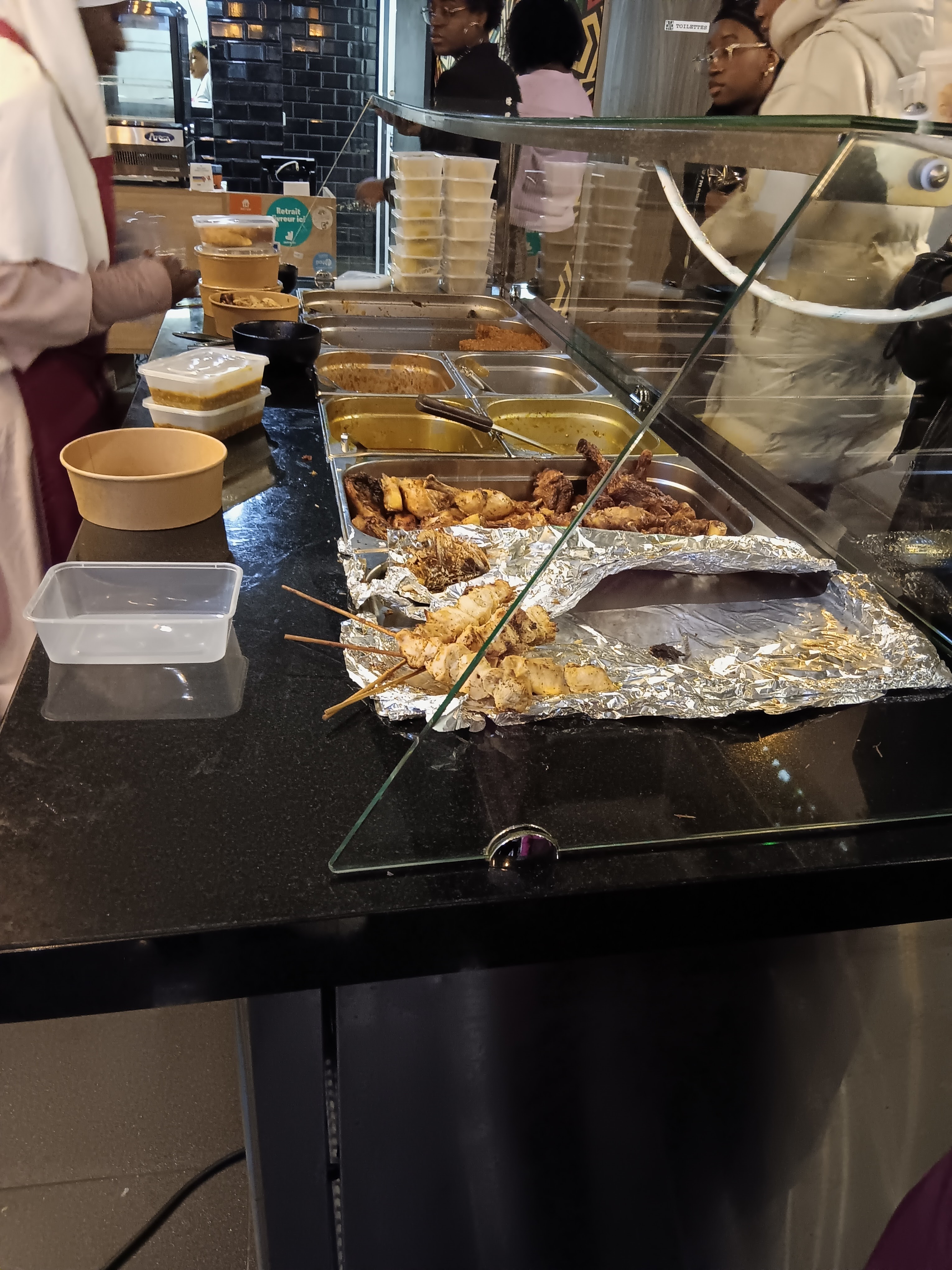 J’y suis allée le soir ne pensant pas qu’il ne resterait pas grand chose. J’ai trouver ça très salé dans l’ensemble Le Thieb été très sec les brochettes pas bonne. La sauce arachide avait un goût de brulé. J’ai pas d’avis objectif sur la sauce gombo car je n’aime pas. Le gingembre est bon mais très sucré Très déçu dans l’ensemble je n’y retournerai pas et je ne recommande pas non plus. Les personnes au services avait l’air fatiguées.