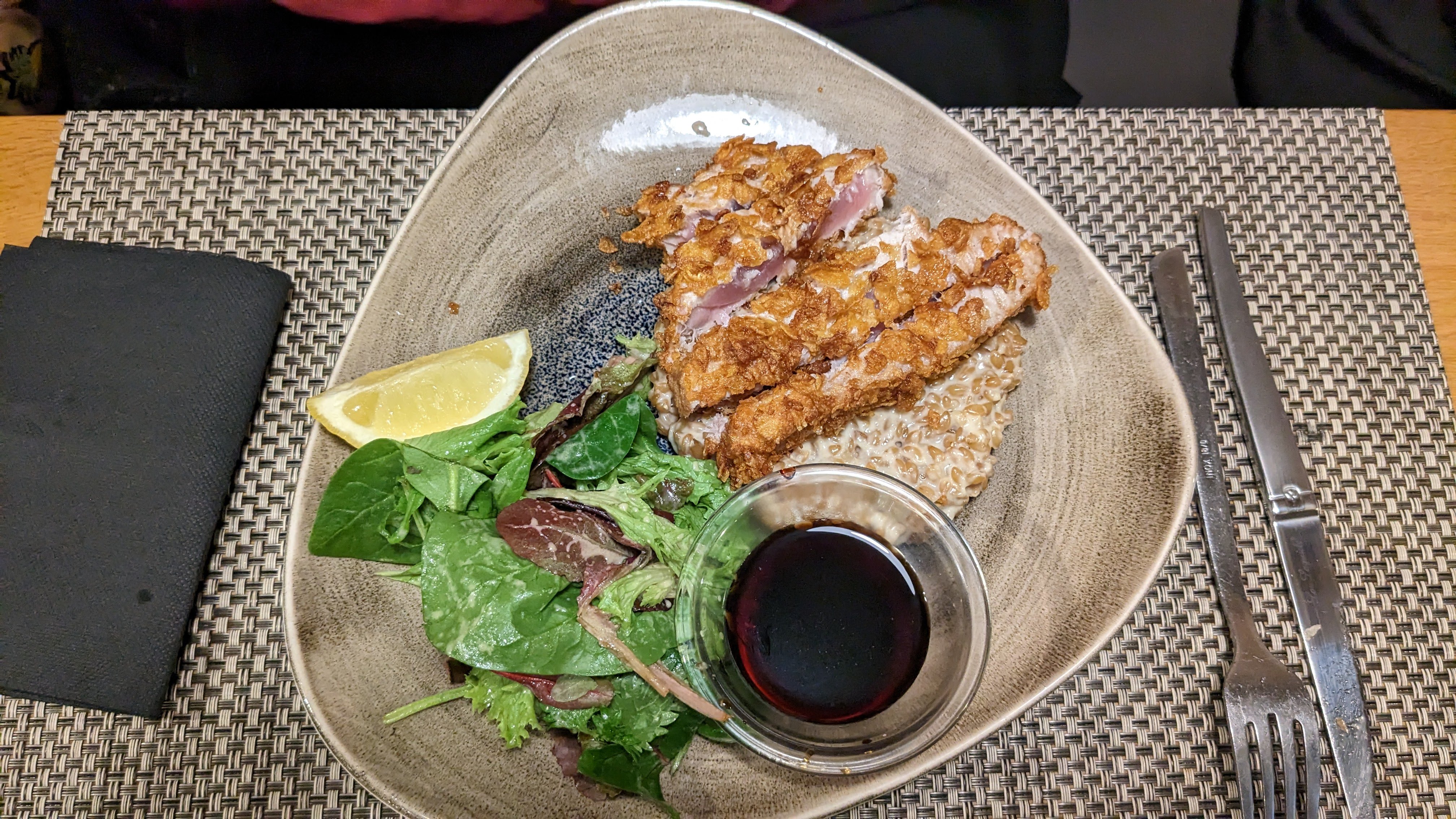 Repas improvisé, car en panne de voiture. La formule du jour est d'un excellent rapport qualité prix. Le saumon sur risotto à l'épeautre est à tomber...