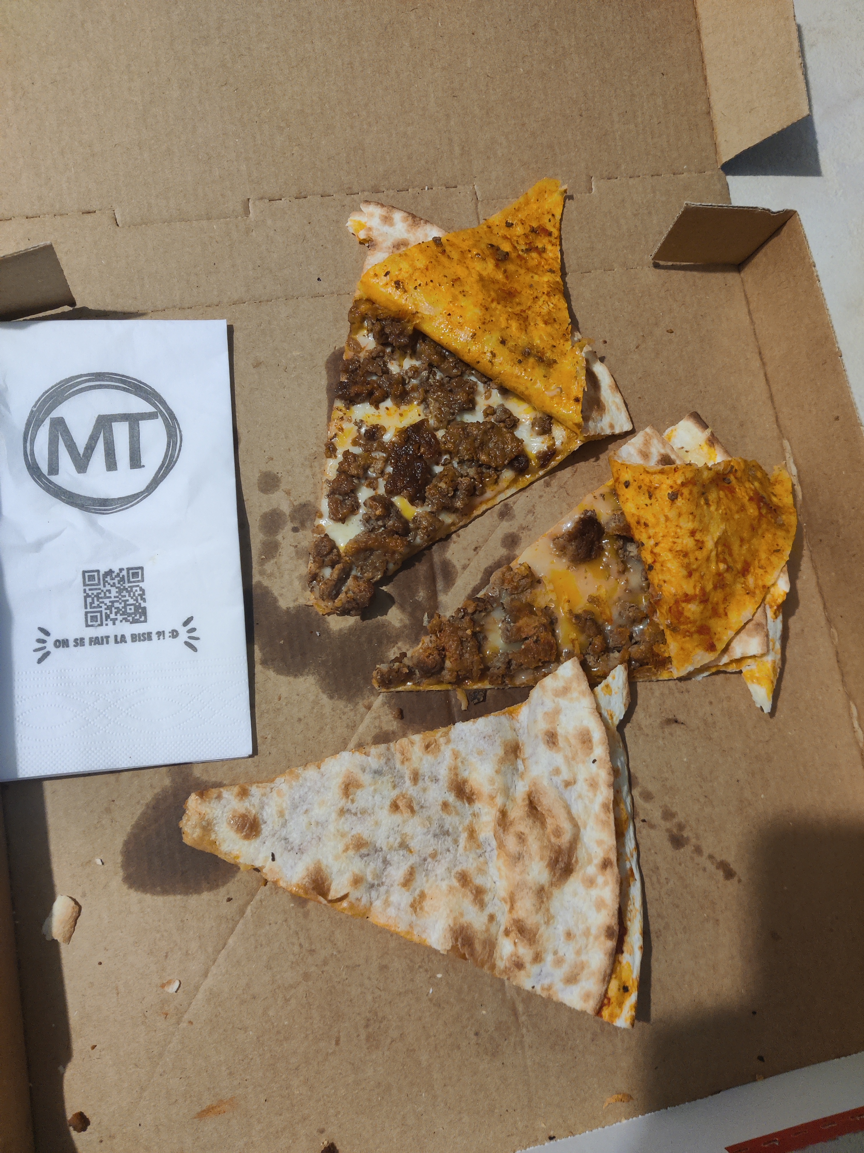 Malheureusement déçue, je trouvais que MT étaient les meilleurs mais c'était avant... Viande trop fade, pain avec un goût bizarre, tacos pas gratiné, tacos froid, trop de crème, pas de sauce tektoka... Dommage je ne comprends pas ce changement.