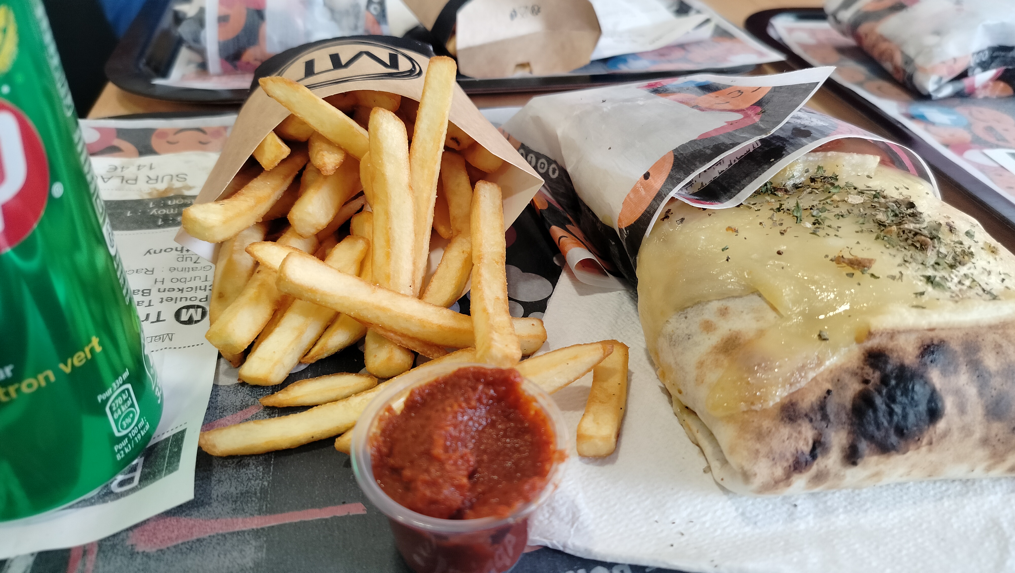 Je suis venu avec des amis. J'ai pris un tacos Xl gratiné à la raclette avec une sauce turbo h qui est une sauce très épicée. Le tacos était très bon et la sauce a eu des effets secondaires sur moi dans les toilettes. Mais sinon c'était très bon.