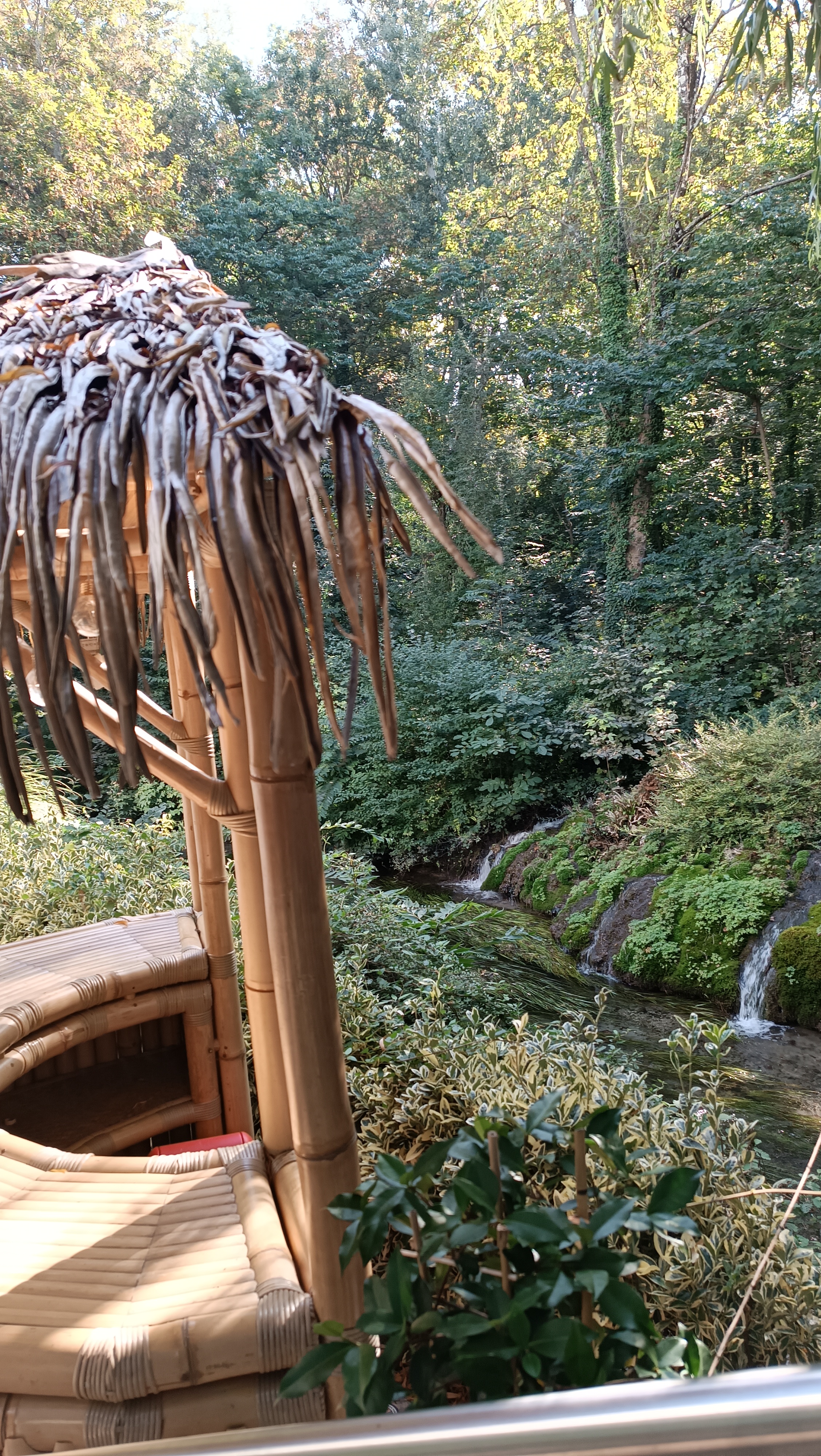 La cuisine et le cadre sont excellents, ça vaut le coût. J'ai été très surprise d'entendre le chef de salle (ou en tout cas la personne qui prenait nos commandes) appeler plusieurs serveuses chérie et non par leurs prénoms, c'est pas très professionnel. Jusqu'à 13h, la terrasse était peu remplie, c'était très agréable, surtout avec la vue sur les petites cascades et le ruisseau qui permettaient d'avoir un fond sonore et donc un peu d'intimité (sans que ça soit de la musique.) Le repas était excellent et tout était très bien présenté. Il y a même des plats végétariens et au moins un végétalien/vegan. Il faudra revenir pour goûter le reste de la carte !
