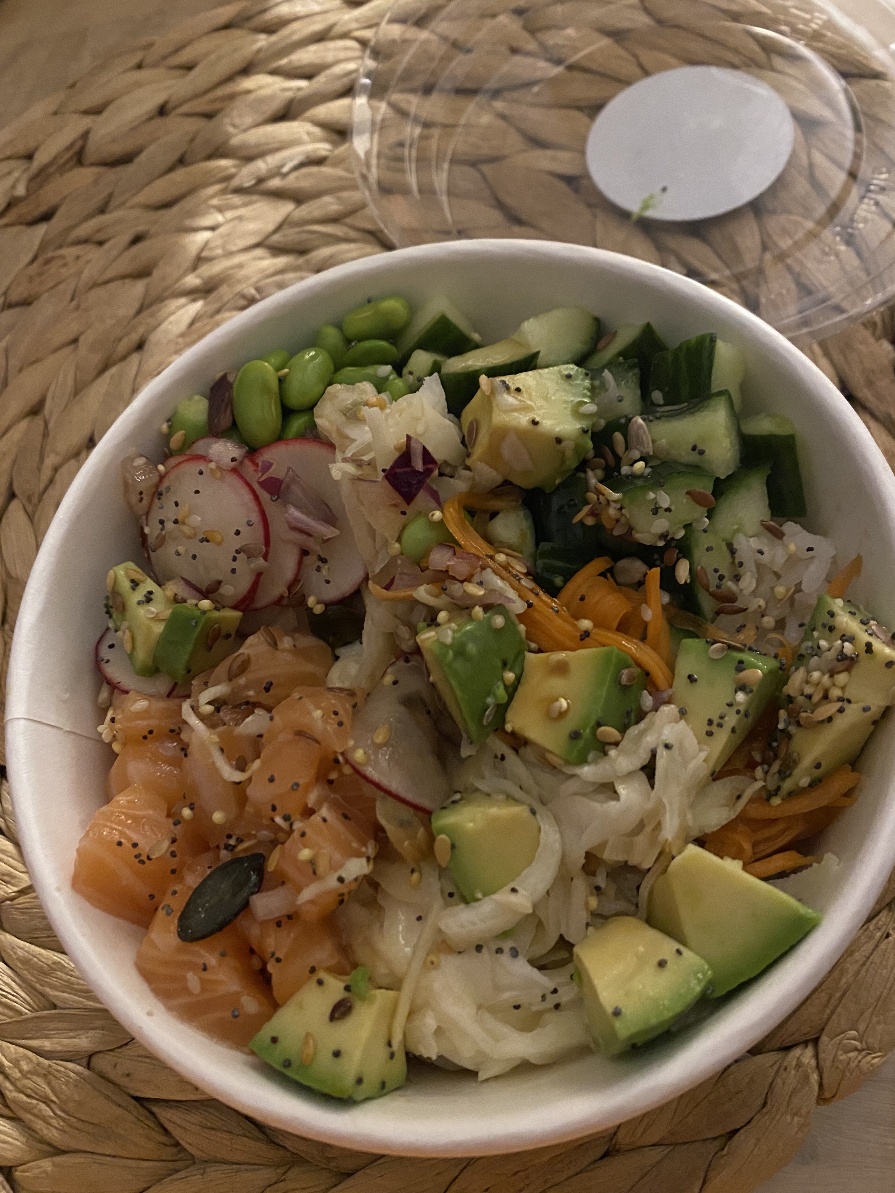 Poke bowl saumon et poulet . Très bon et frais . Nous commandons régulièrement et jamais déçu. Merci Mélissa pour ta gentillesse.