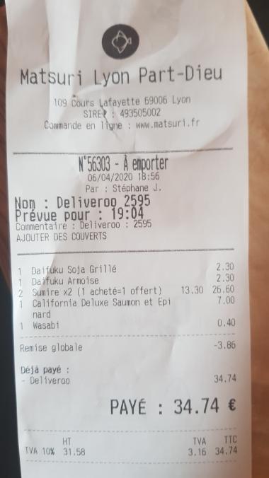 Bonjour, Je me permets de venir ajouter ma pierre au commentaire de mon épouse, ce que je n'aurai pas fait si nous avions été rappelé par le responsable comme cela nous a été promis. Je tiens a ajouter que nous sommes clients depuis 2018 et cet avis tranche avec la qualité qui était alors au rendez-vous. Commande le 30/08, livraison rapide, rien à redire. Premier avis sur le nouveau packaging éco responsable en carton la boîte n'est pas rigide et fait penser à un carton mouillé... A l'ouverture, le poisson est terne (saumon un peu, thon extrêmement). Je goute un premier maki : riz sec et pâteux, algue sèche, limite dure à mâcher, le riz pas tu tout collé aux ingrédients laissant apparaître des trous. J'avoue que le sushi Thon ne me fait pas envie par son aspect extérieur mais (nous ne sommes pas de ceux qui jettent les produits à date d'expiration) je le porte à la bouche. Là l'odeur n'est pas possible. Impossible à manger cru. Toute notre commande est passée à la poubelle ! Appel à Matsuri Lyon, l'interlocuteur ne sait pas du tout quoi faire et m'indique imprimer mon ticket (pourquoi ?)... Je demande à être rappelé le lendemain. A ce jour aucun appel et pourtant je vois que le propriétaire prends le temps de répondre aux avis positifs sur Google. Cette livraison est inacceptable là où les précédentes (sur l'année passée) étaient déjà médiocres. J'ajoute à cela le parcours du combattant pour se faire rembourser un produit non livré. Pour nous ce sera la dernière commande.