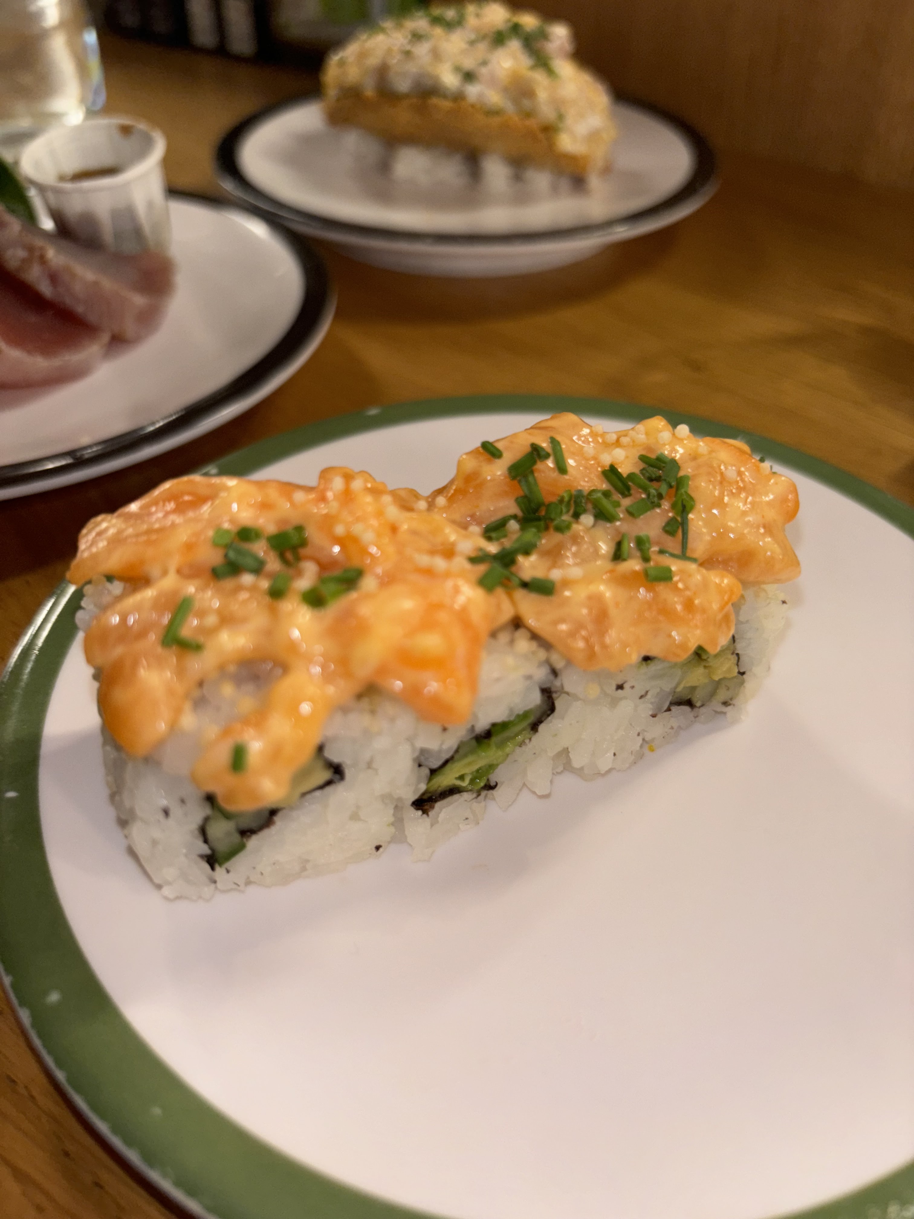 L'ambiance, la décoration et l'accueil sont agréables et chaleureux. Les sushis, californias et makis sont tous bons. En revanche, beaucoup sont mal roulés et se défont lorsqu'on veut les prendre pour tremper dans la sauce. La diversité de choix est un peu décevante sur ce qui passe devant nous sur le tapis.