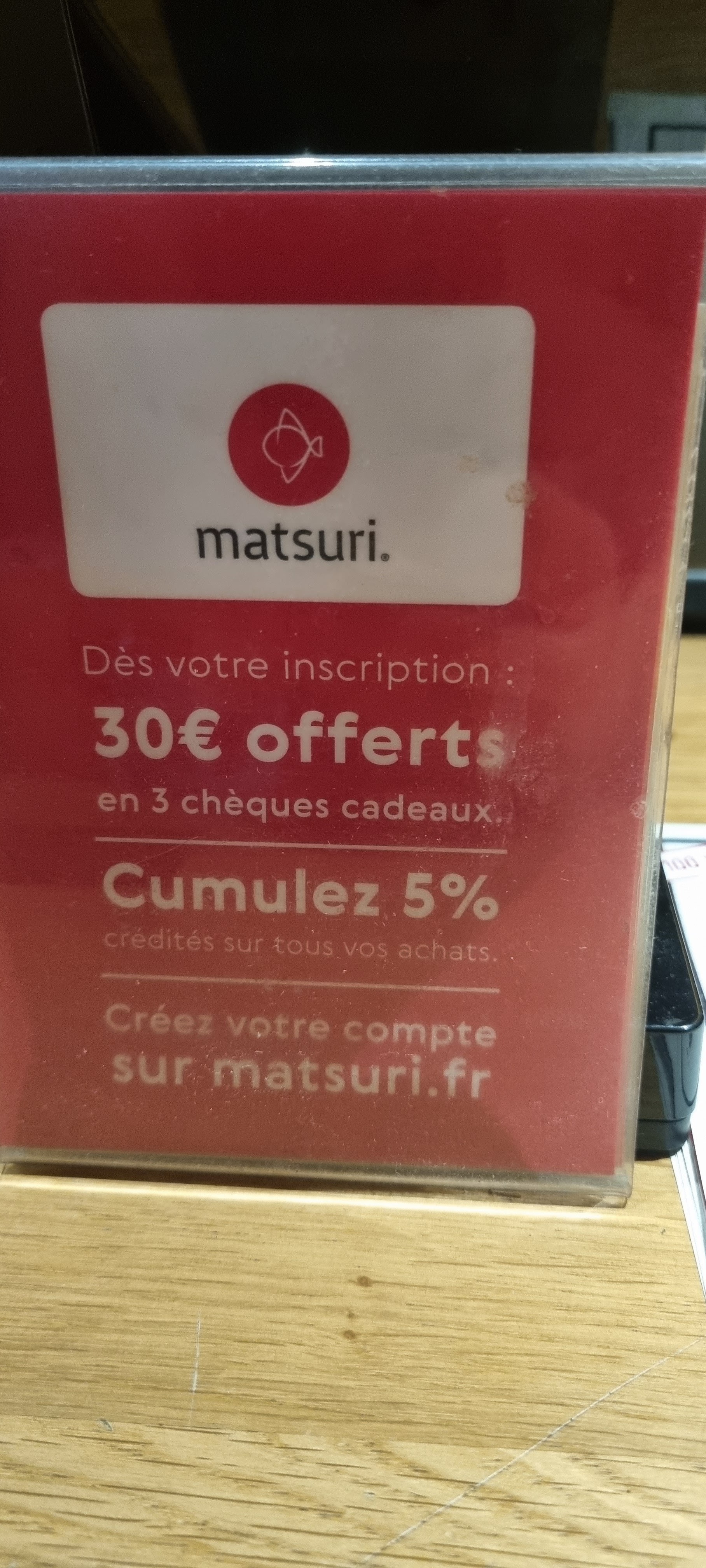 Habitué de longue date a Matsuri quelques changements déplaisent : d'abord le gingembre , pas fou dans le sachet , il etait bien meilleur servi dans les coupelles en verre . la sauce sauja dans les petites bouteilles : pas top non plus . ou es passée la serviette chaude en arrivant pour se laver les mains ? Bref oui c'est bon , mais cher . Vaut bien le coup avec une reduction 40 ou 50 pour cent sur la fourchette , sinon c'est du luxe .