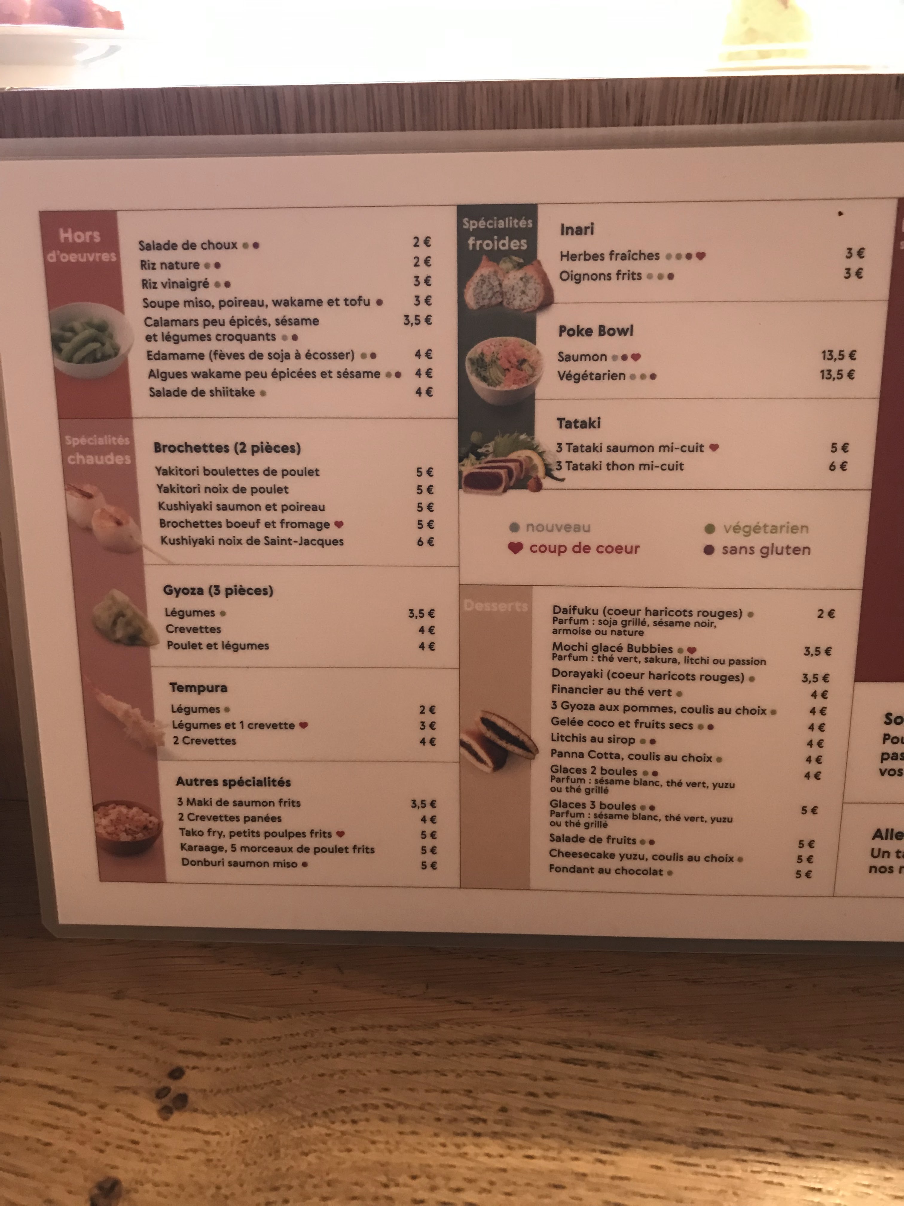 Je peux comprendre beaucoup de choses, notamment le prix du poisson. Mais proposer à 5.50€ deux ridicules brochettes, froides qui plus est à force de tourner sur le tapis, ou 4€ le dessert en photo, c'est - je trouve - exagéré. Vous repartirez en ayant faim, ou en étant frustré, 2☆ pour la déco