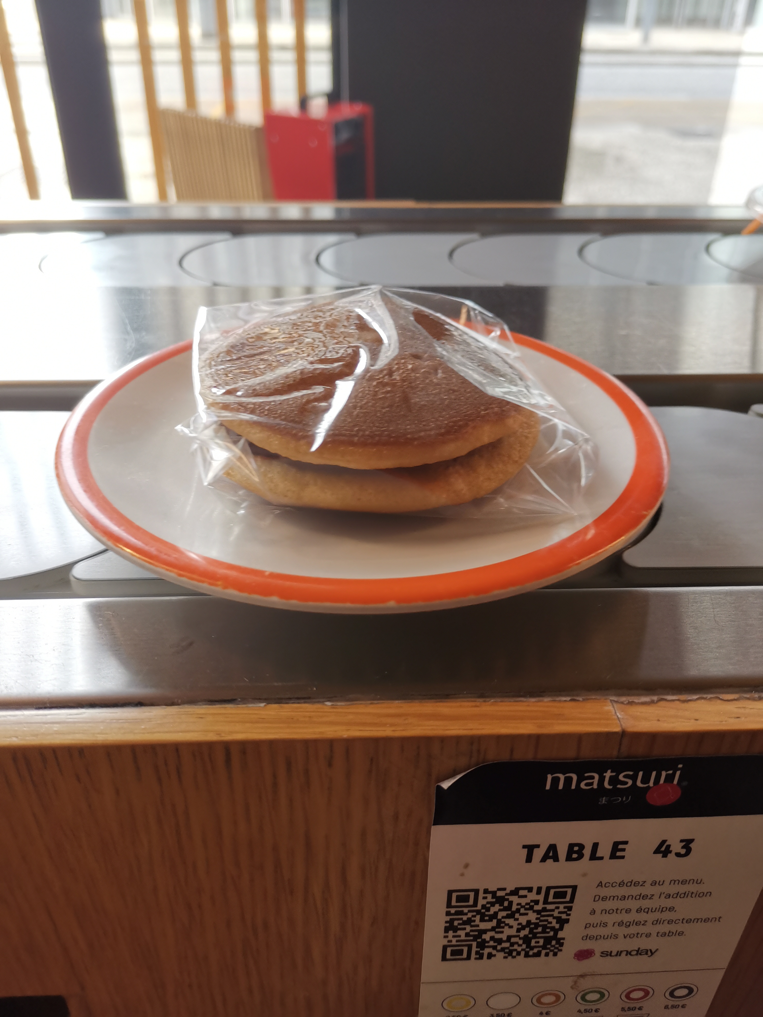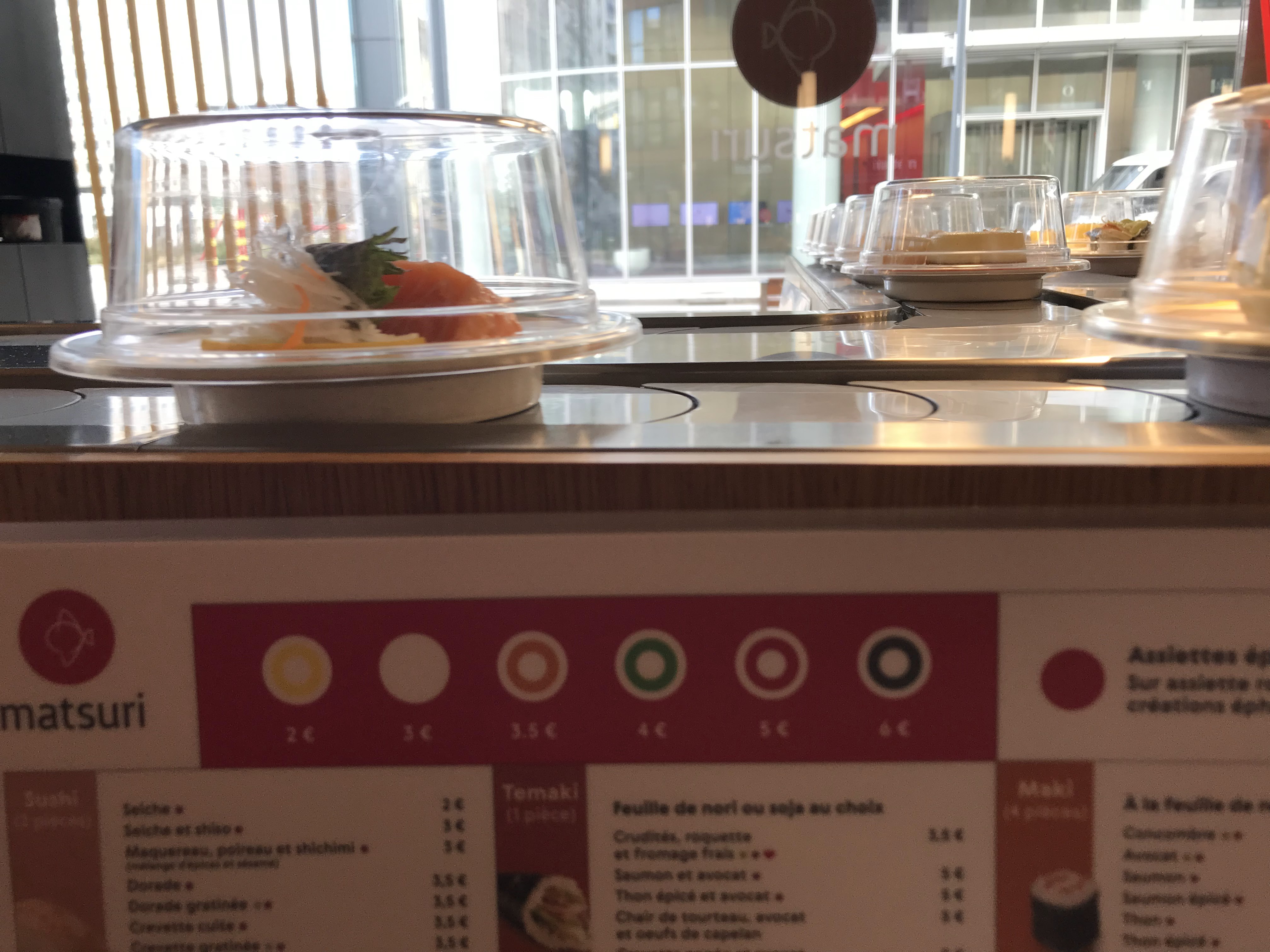 Le concept de ce restaurant est bien connu. Il y a un tapis roulant et vous vous servez en payant chaque assiette que vous avez pris. Vous pouvez aussi commander des plats qui ne sont pas servis sur tapis. Le problème c'est quand la qualité des plats proposés ne correspond pas au prix de vente. La présentation est également très pauvre, c'est le strict minimum. Étant donné que le service est quasi inexistant puisqu'il y a un tapis, les prix devraient être tirés vers le bas. Ou alors il faudrait envisager un système à volonté ou l'on peut prendre autant qu'on veut. 4,5€ ou 5,5€ pour 4 makis classiques servis sur un tapis c'est trop cher. La note monte vite. Les desserts semblent venir de chez métro et sont servis encore dans leur emballage, c'est vraiment moyen. C'est dommage car le restau est propre avec une jolie décoration.